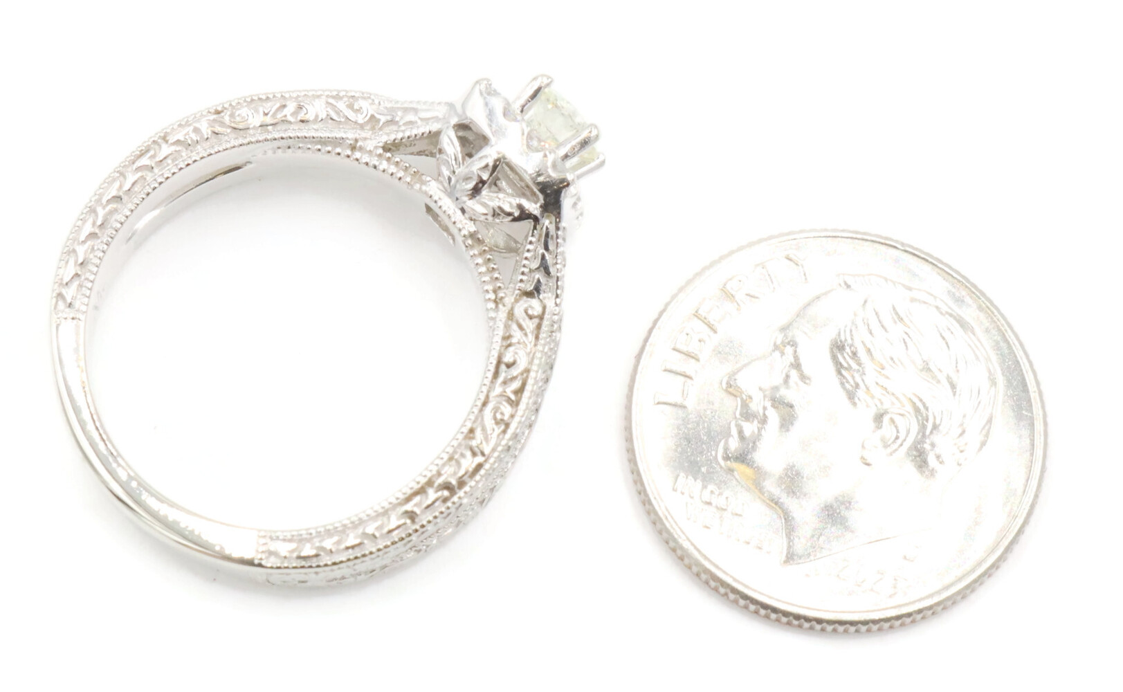 LaVie 0.53 ctw Round Diamond Halo 14KT White Gold Antique Filigree Style Ring. This ring is a size 6.
