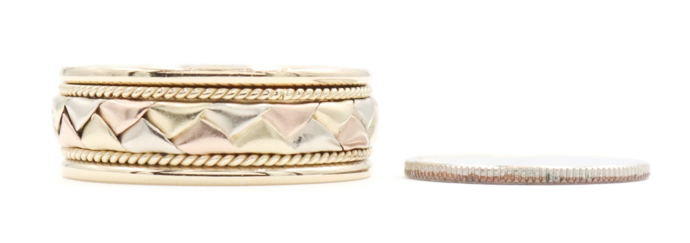 Matte Finish 14KT Tri-Color Gold 8mm Braided Wedding Band Ring Size 10.5 - 8.30g. This ring is a size 10 1/2.