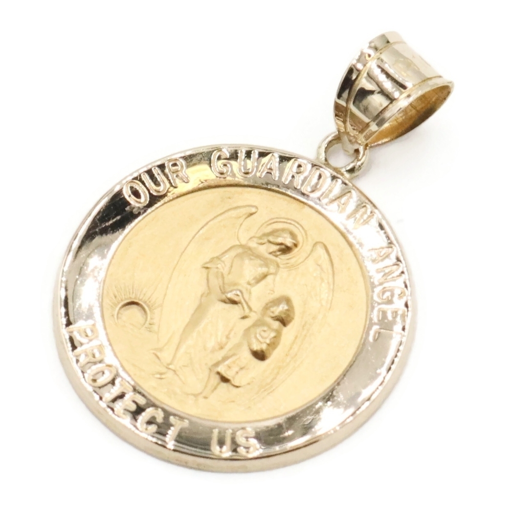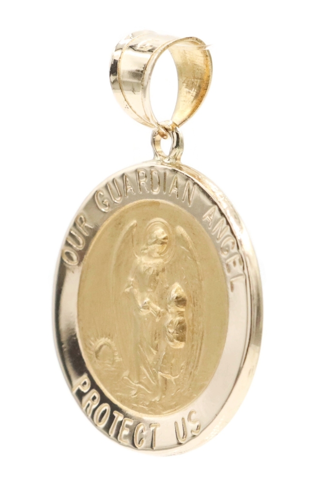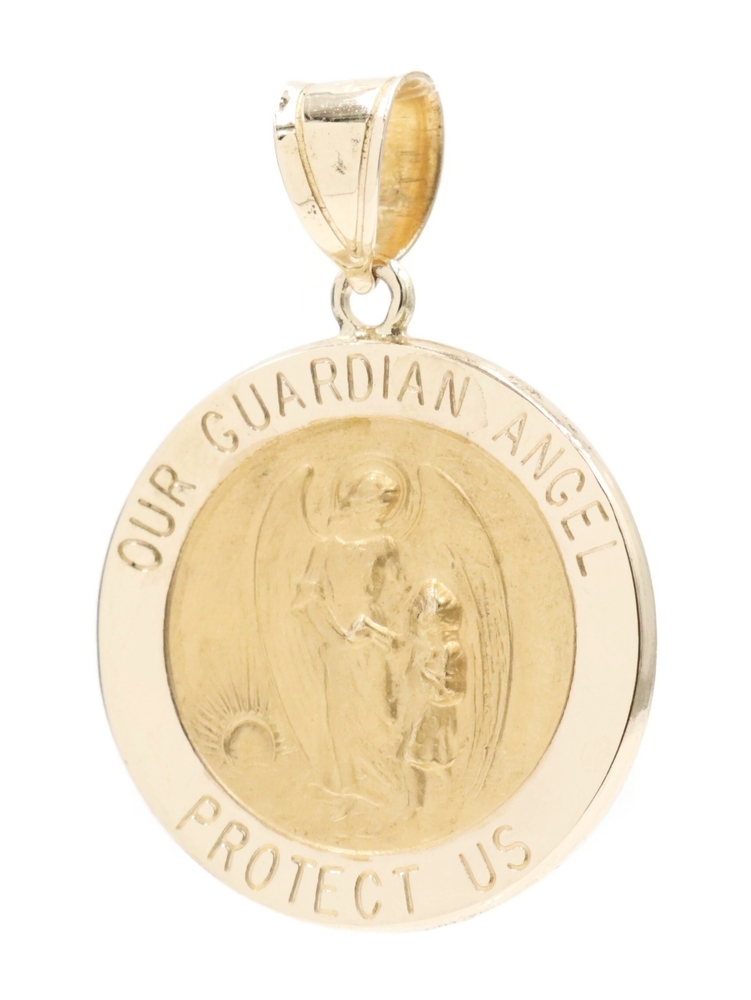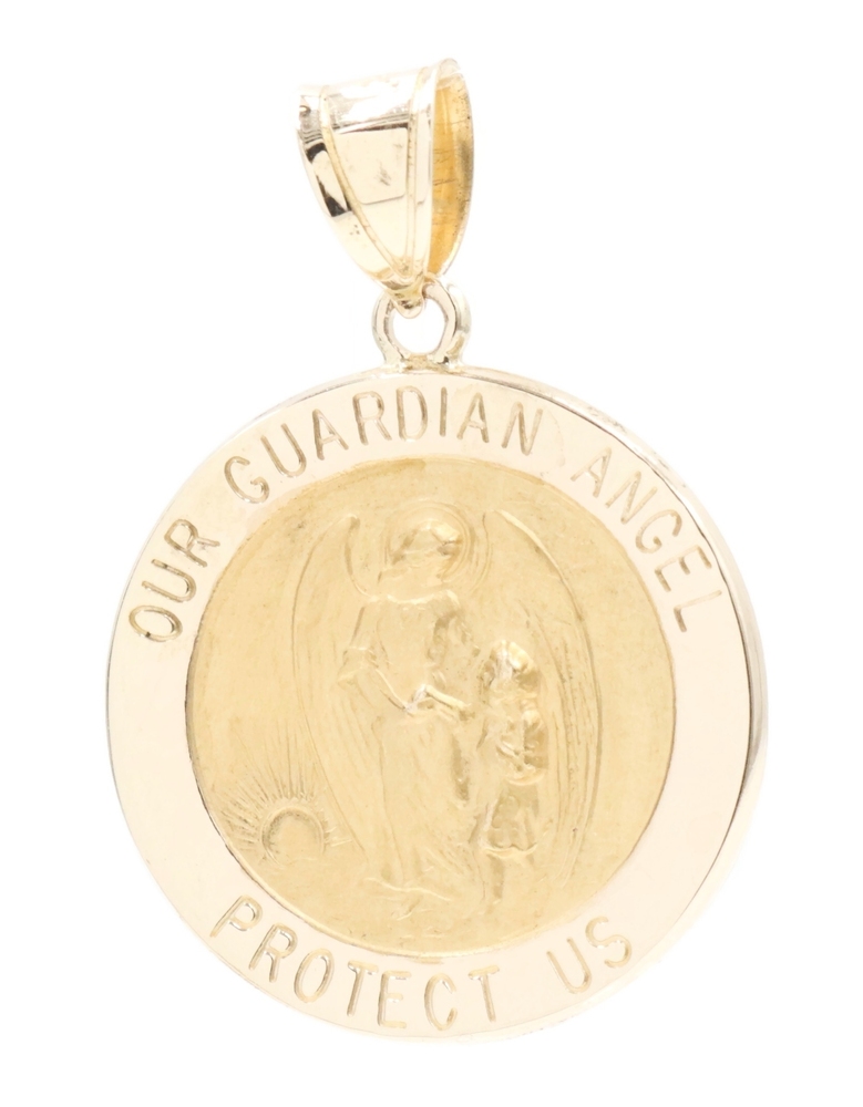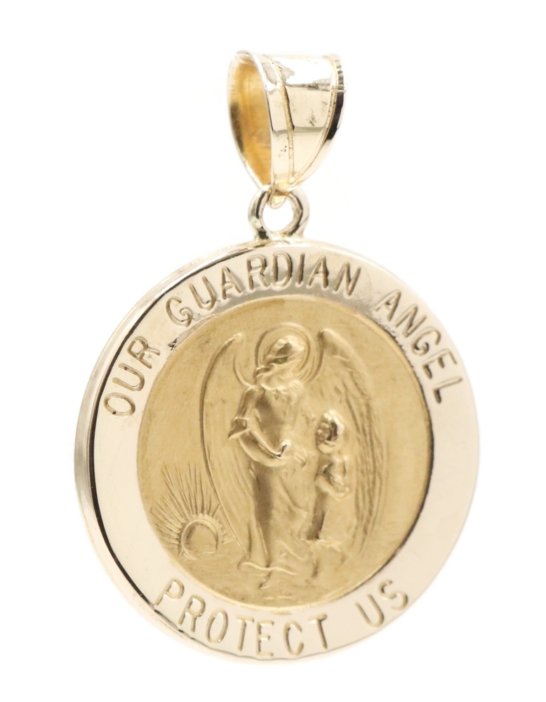 Matte Finish 14KT Yellow Gold "Our Guardian Angel Protect Us" Medal Pendant 1". This pendant is approximately 26.3mm in length (including the bail) and 18.2mm in width.