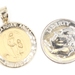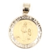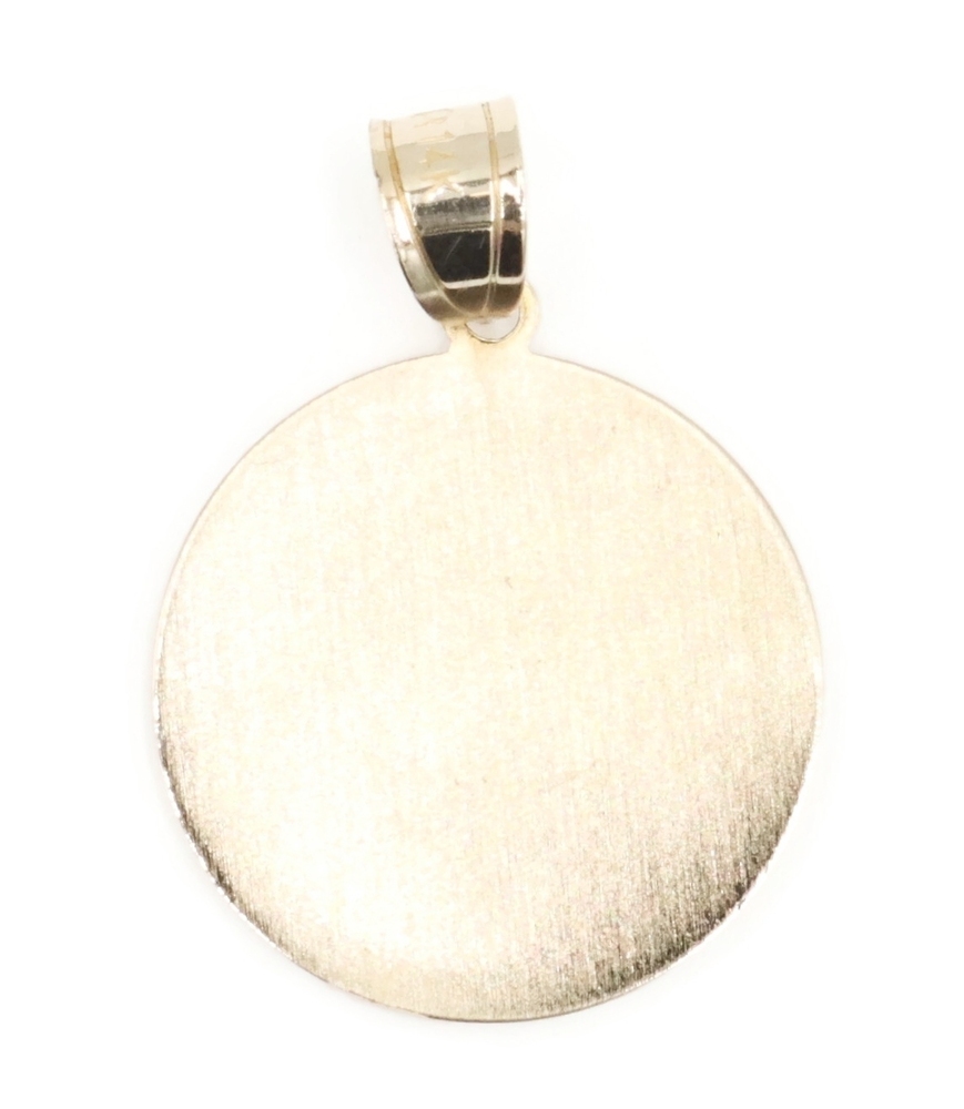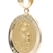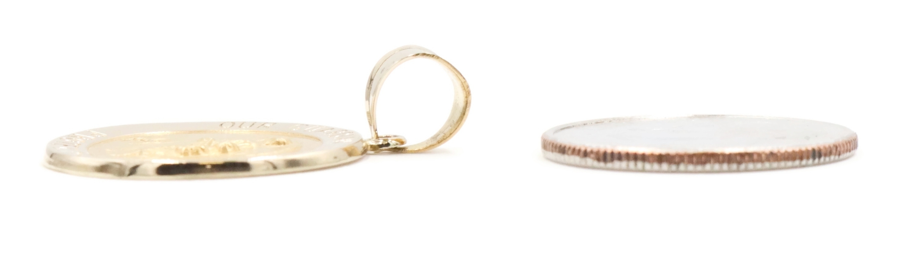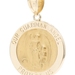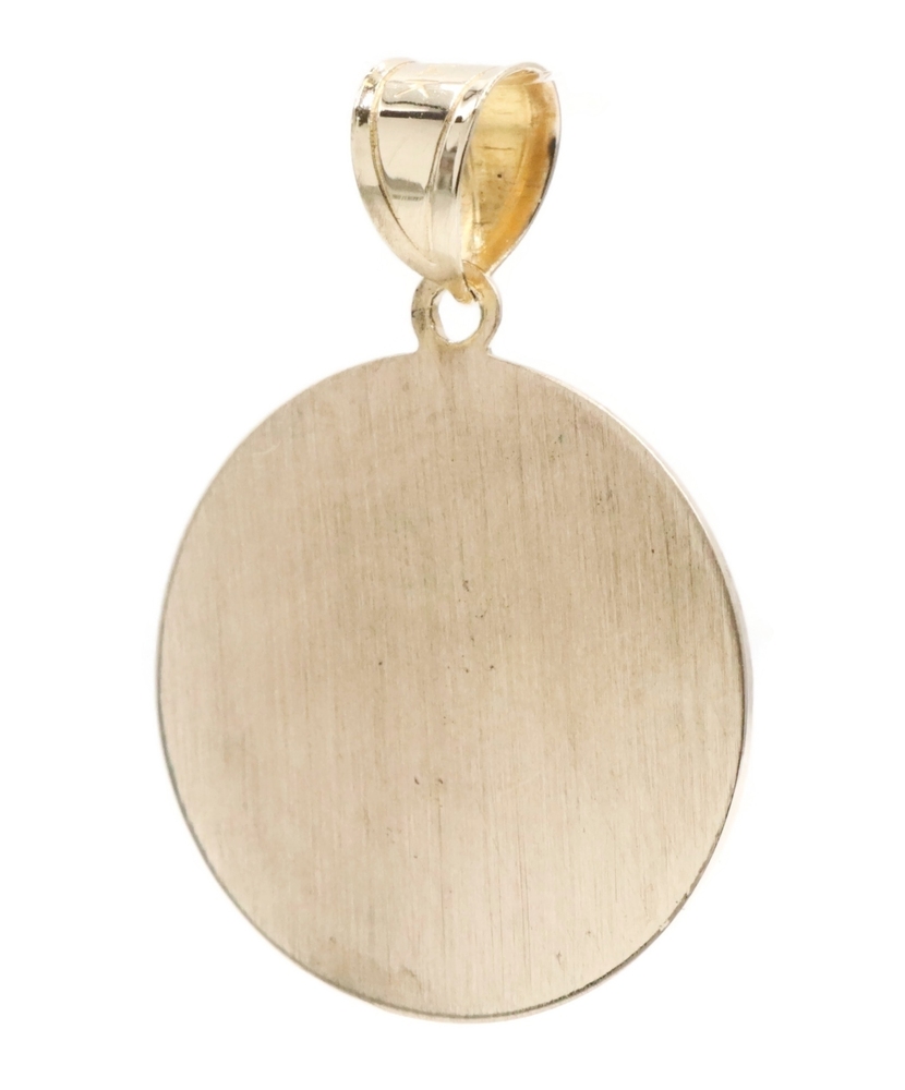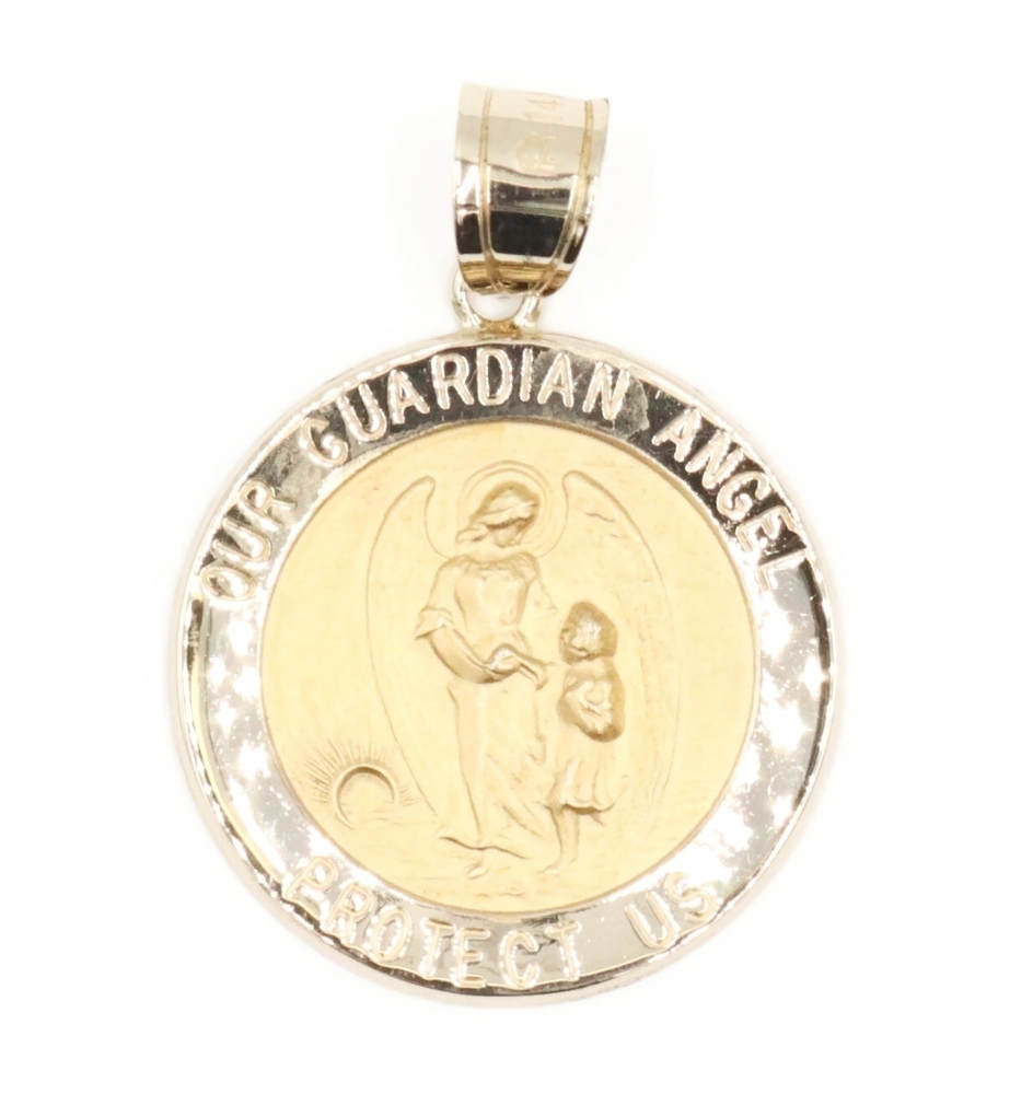 Matte Finish 14KT Yellow Gold "Our Guardian Angel Protect Us" Medal Pendant 1". This pendant is approximately 26.3mm in length (including the bail) and 18.2mm in width.