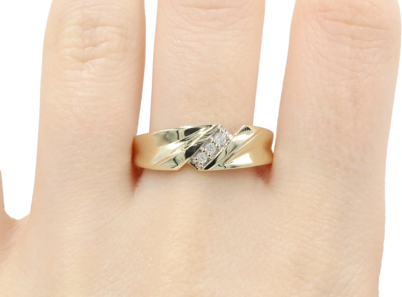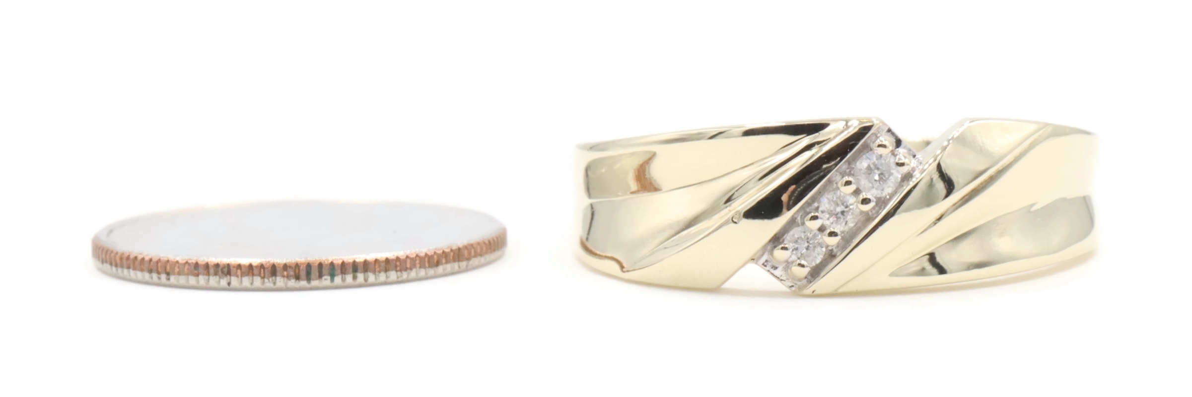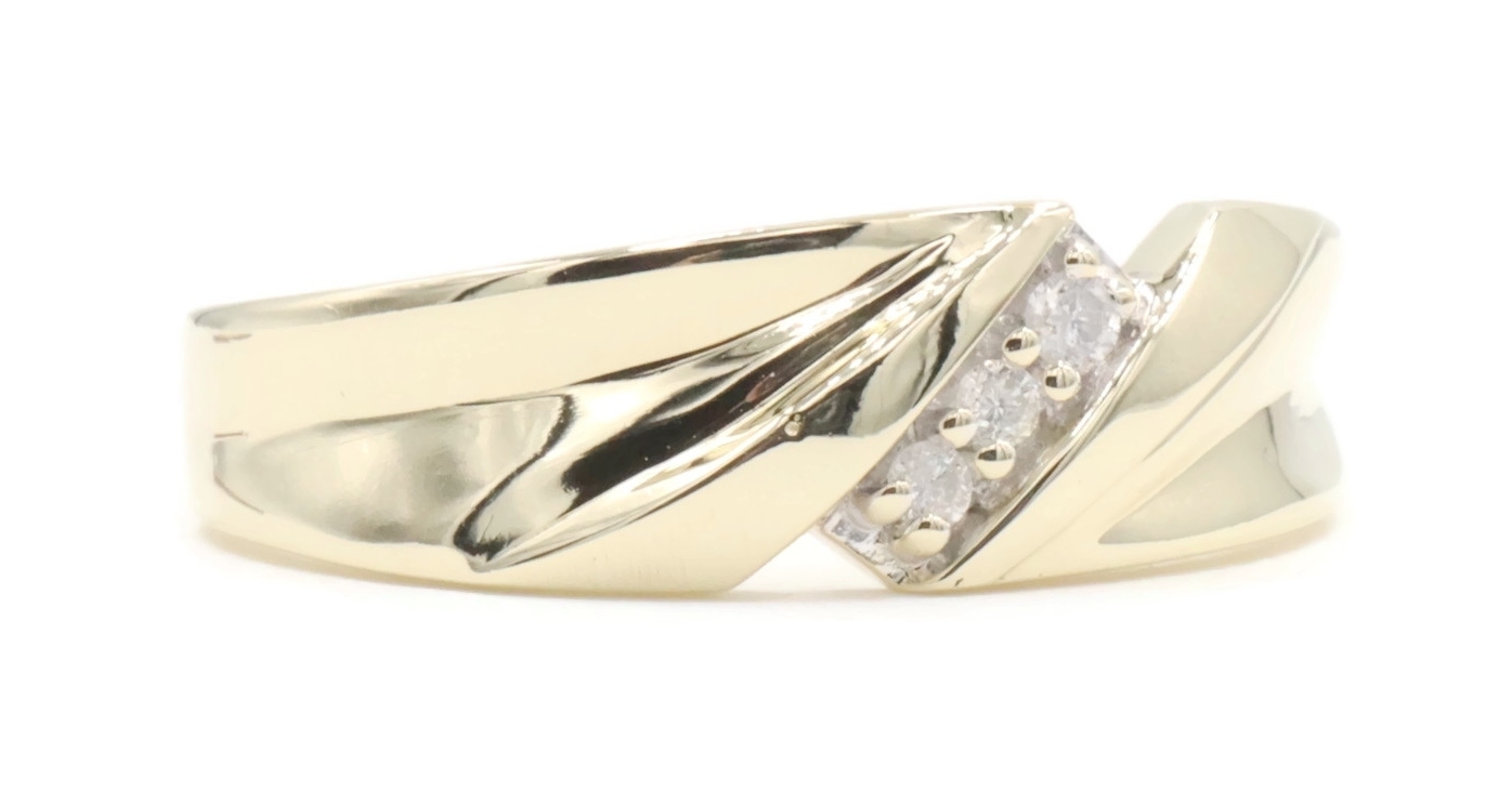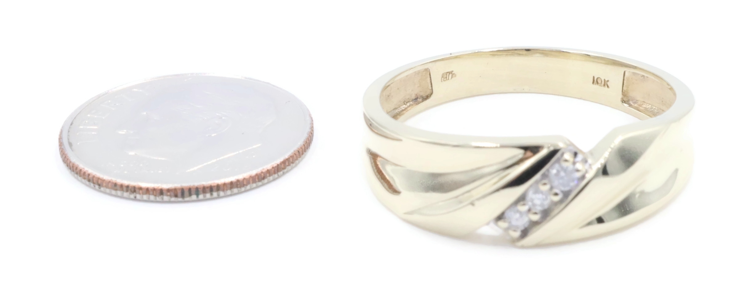 Men's 3-Stone 0.08 Ctw Round Diamond 10KT Yellow Gold Diagonal Wedding Band 2.6g. This ring is a size 10 1/4.