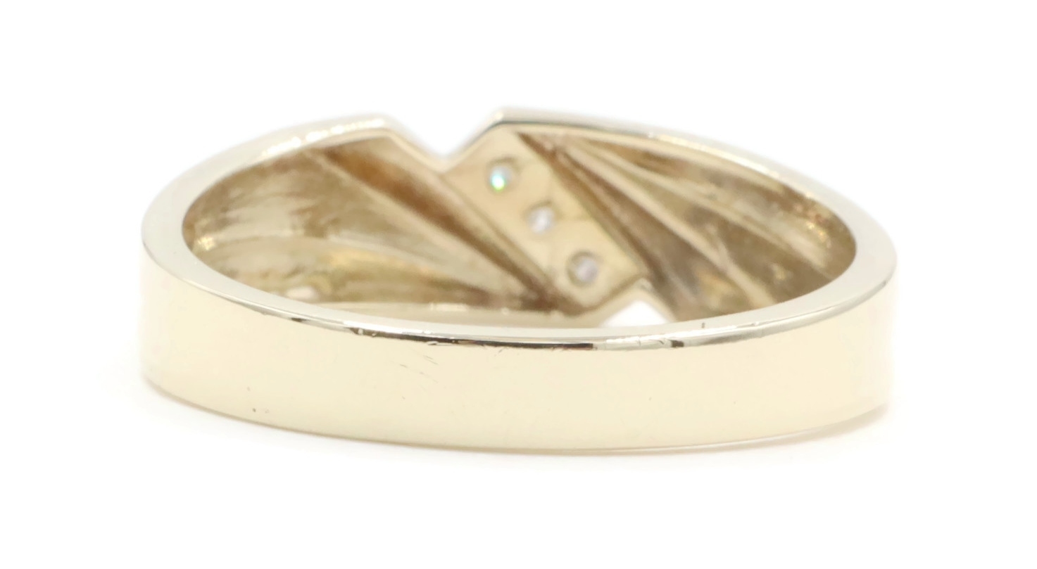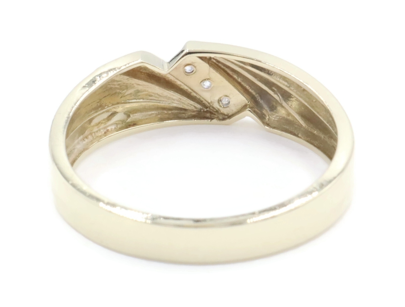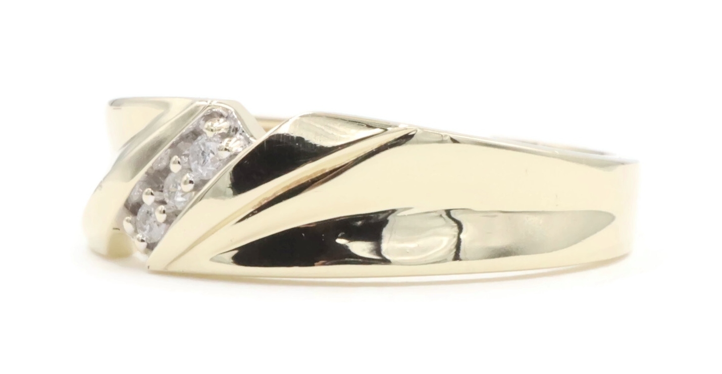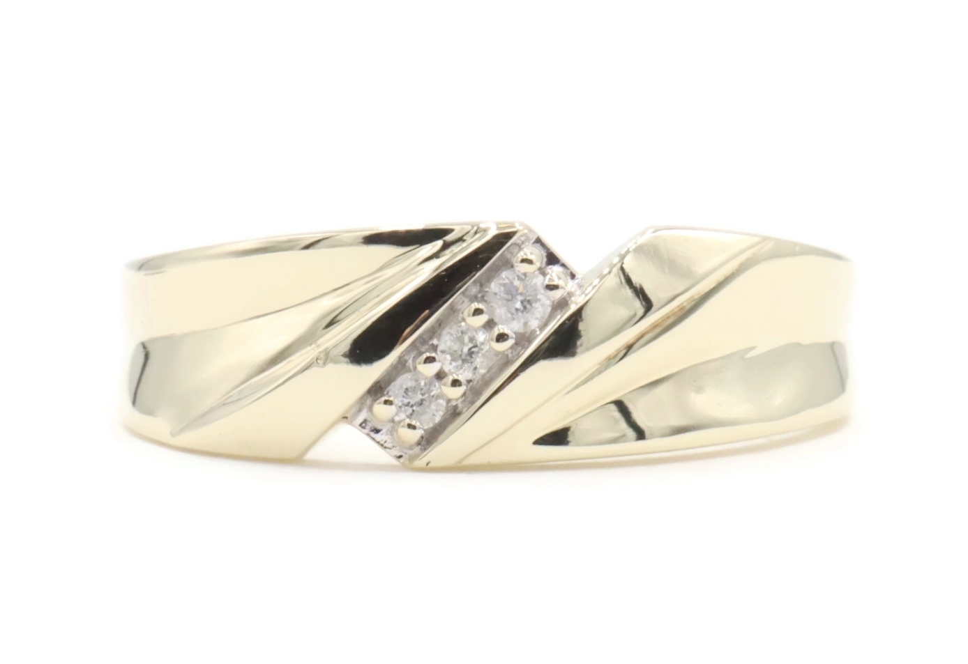Men's 3-Stone 0.08 Ctw Round Diamond 10KT Yellow Gold Diagonal Wedding Band 2.6g. This ring is a size 10 1/4.
