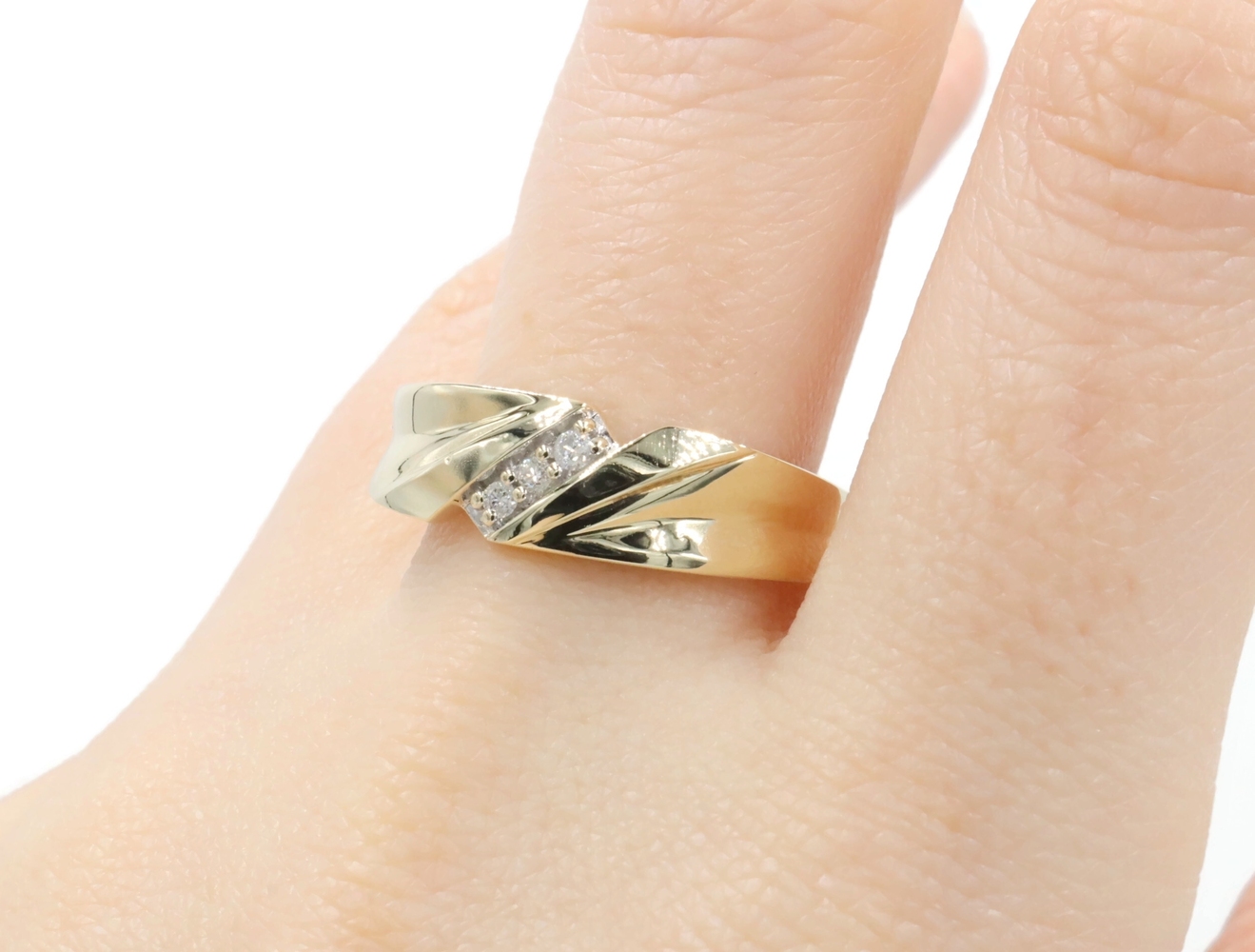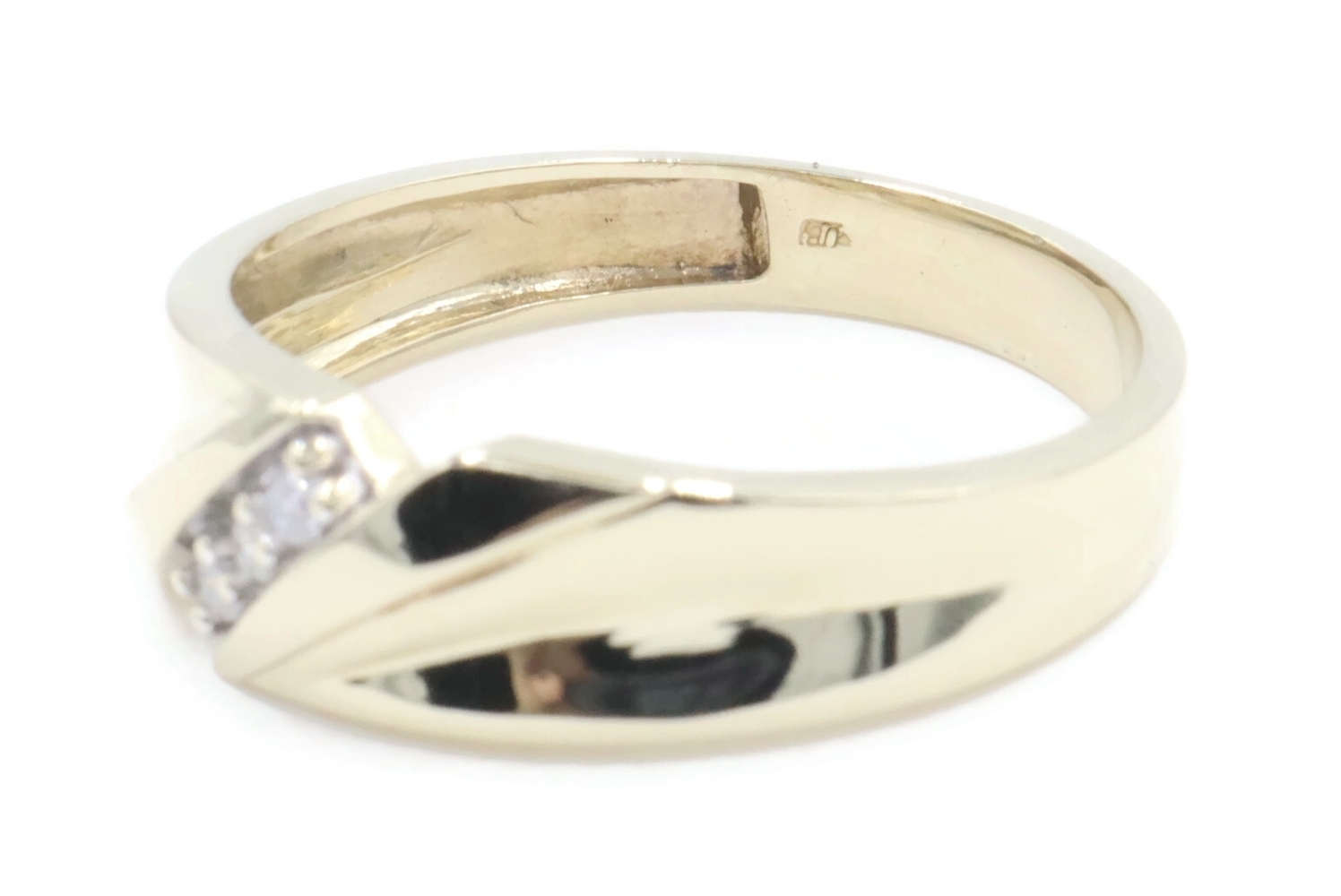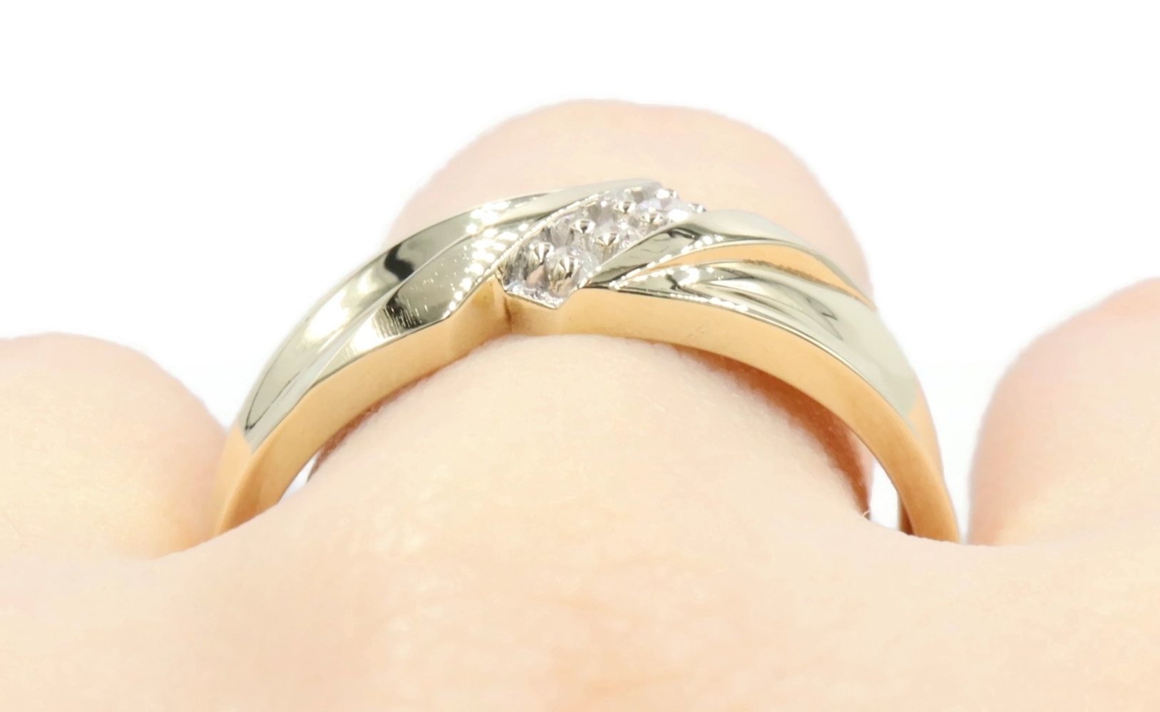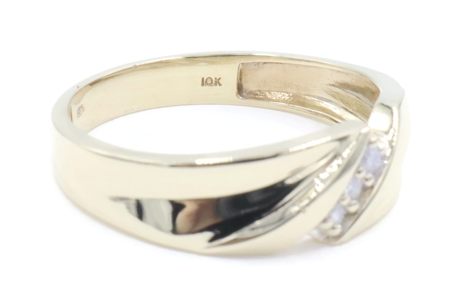 Men's 3-Stone 0.08 Ctw Round Diamond 10KT Yellow Gold Diagonal Wedding Band 2.6g. This ring is a size 10 1/4.