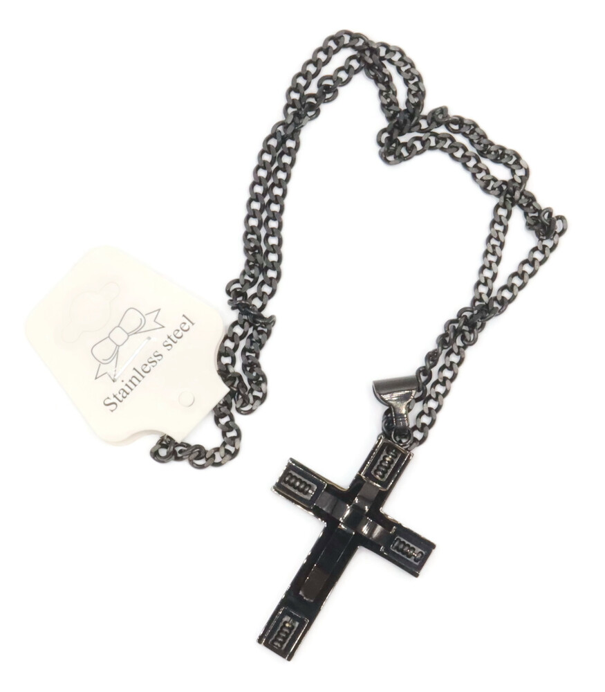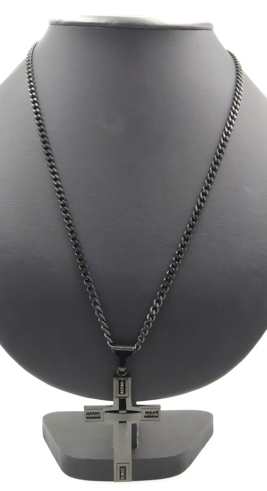 Men's Black Stainless Steel 2 3/4" Large Cross Pendant on 24" Curb Link Necklace. Both the necklace and the pendant are stainless steel.