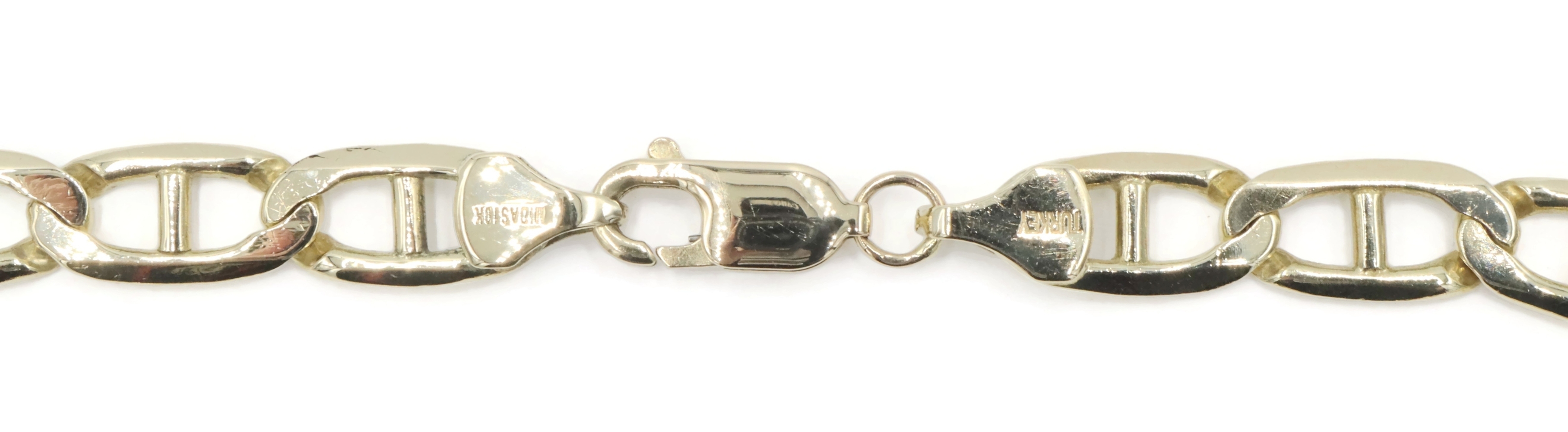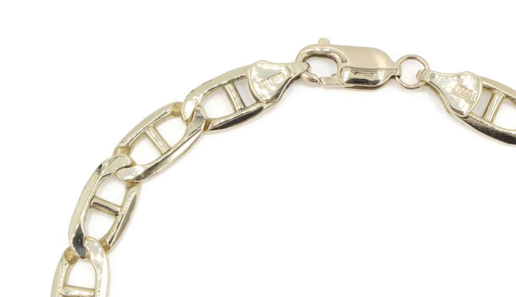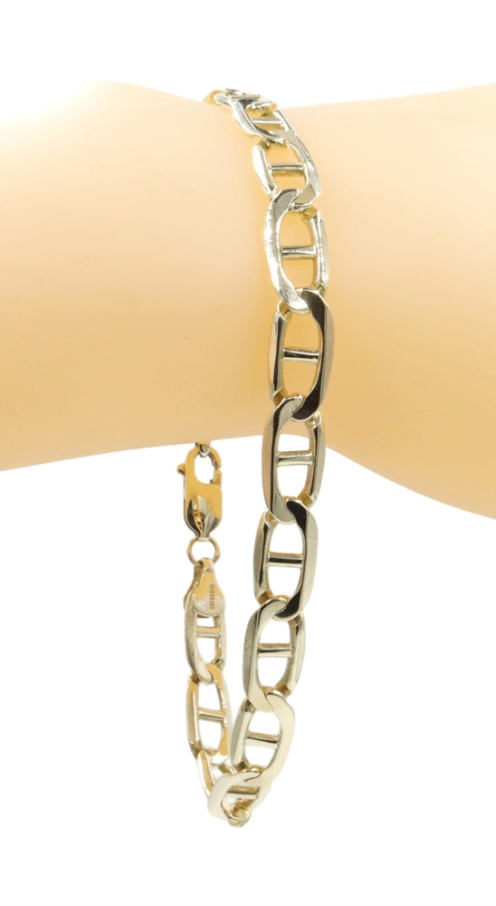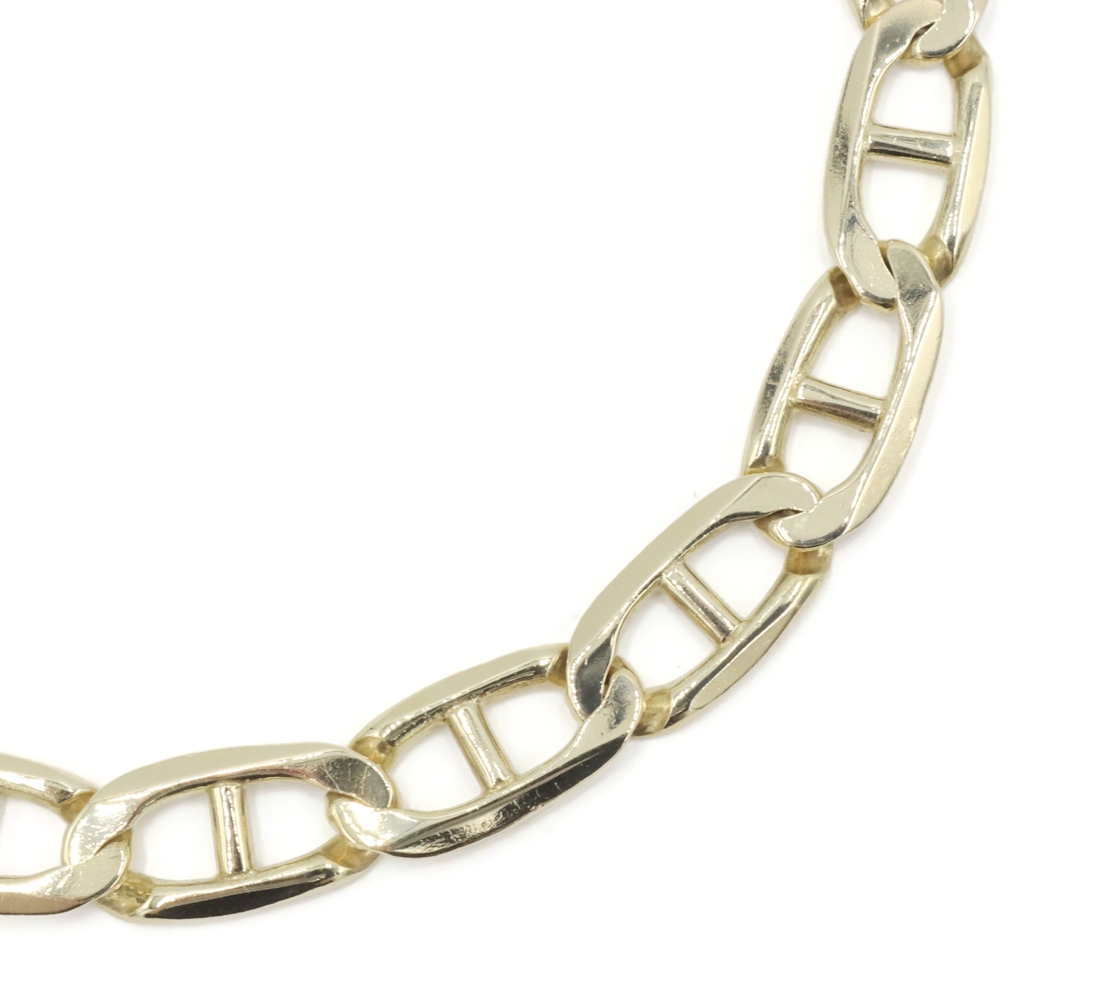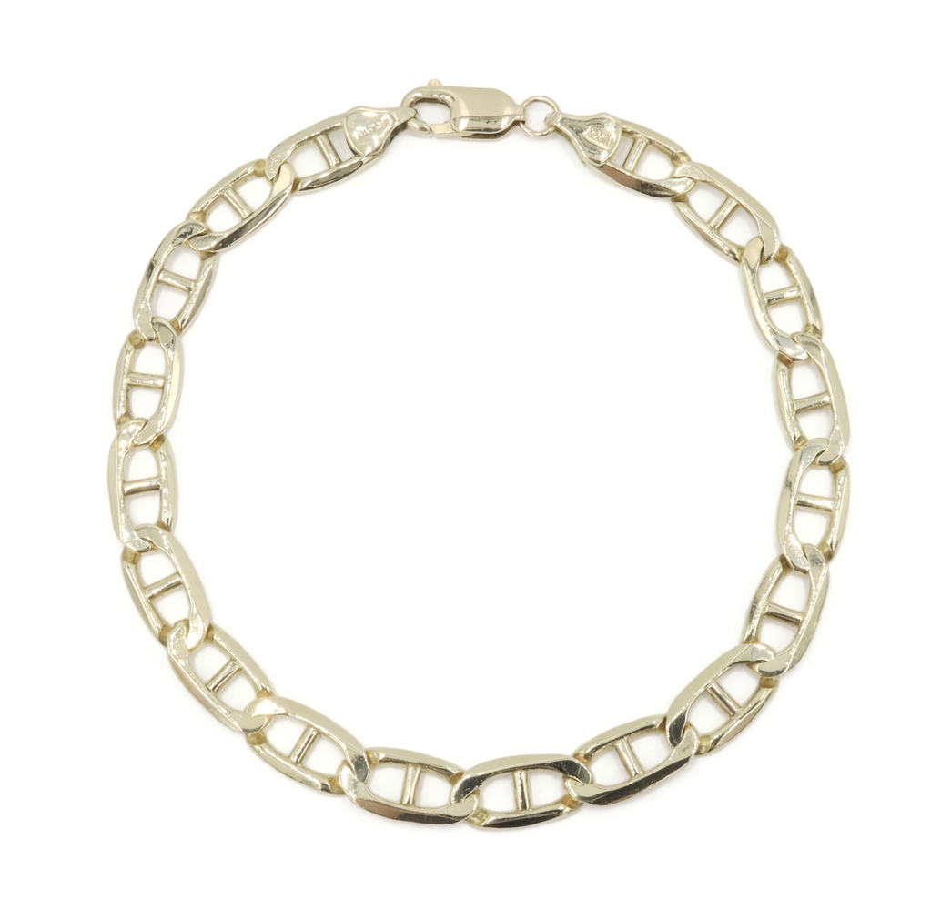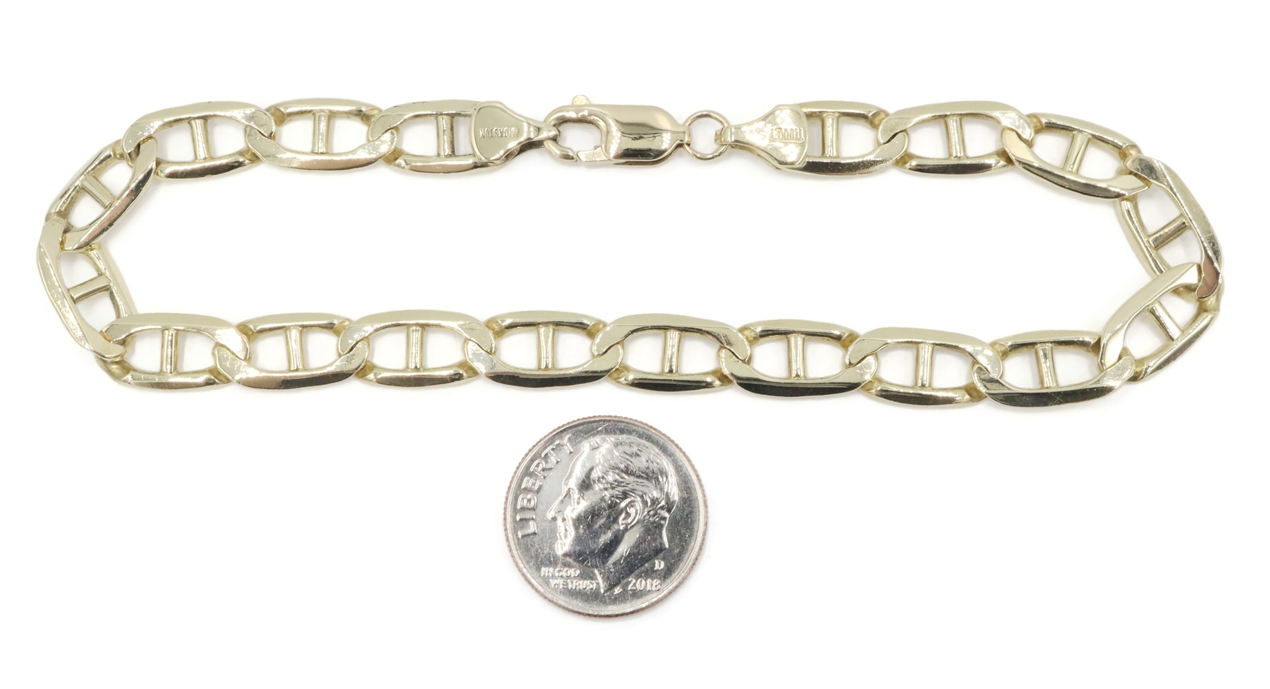 Men's High Shine 10KT Yellow Gold 6.8mm Wide Mariner Chain Bracelet 9" Midas 13g. This bracelet is approximately 9 inches in length and 6.8mm in width. The chain ends are marked "10K" and the clasp lever is marked "585."