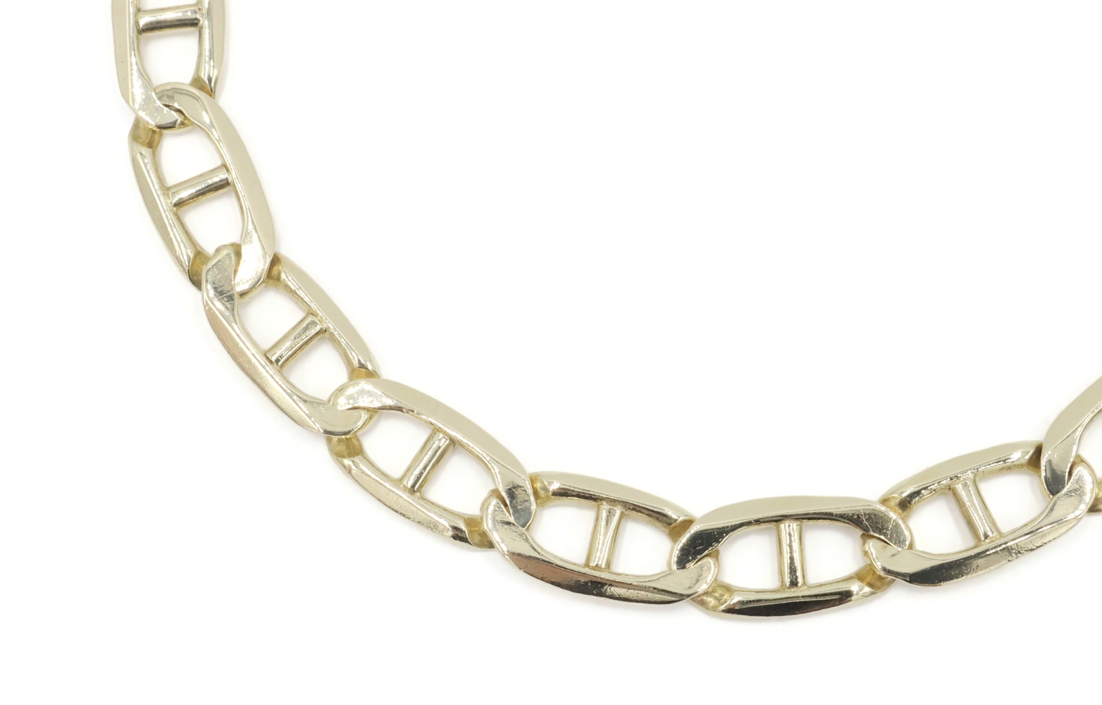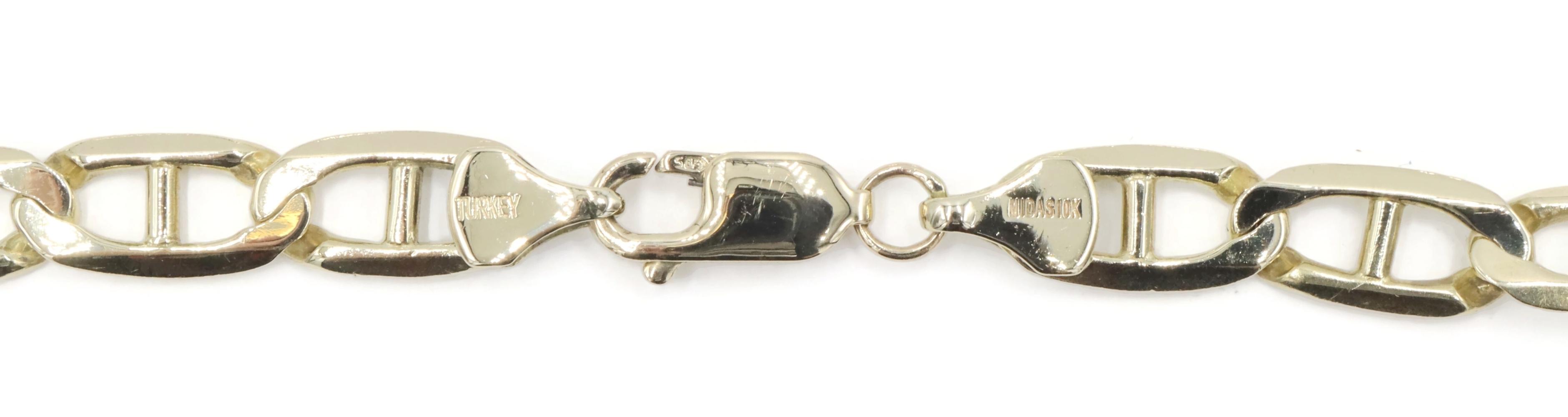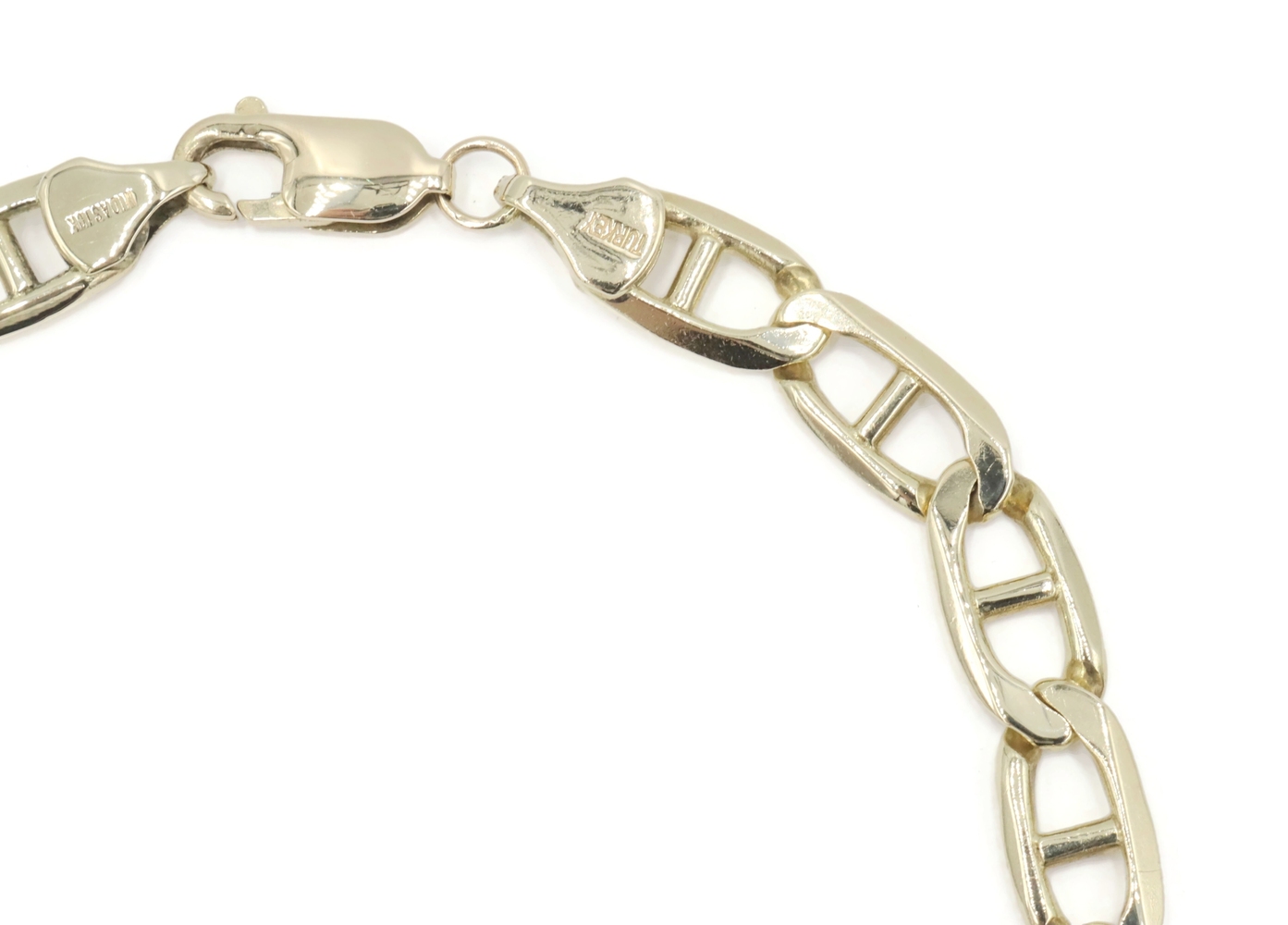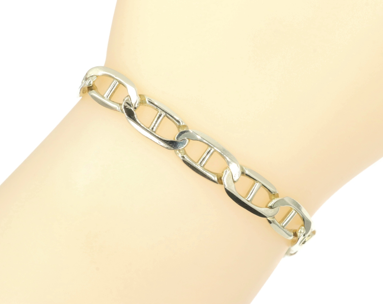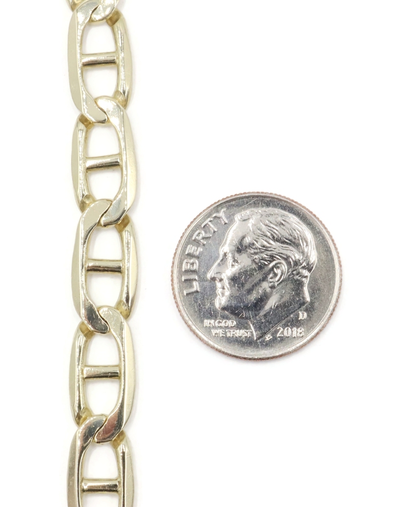 Men's High Shine 10KT Yellow Gold 6.8mm Wide Mariner Chain Bracelet 9" Midas 13g. This bracelet is approximately 9 inches in length and 6.8mm in width. The chain ends are marked "10K" and the clasp lever is marked "585."