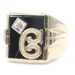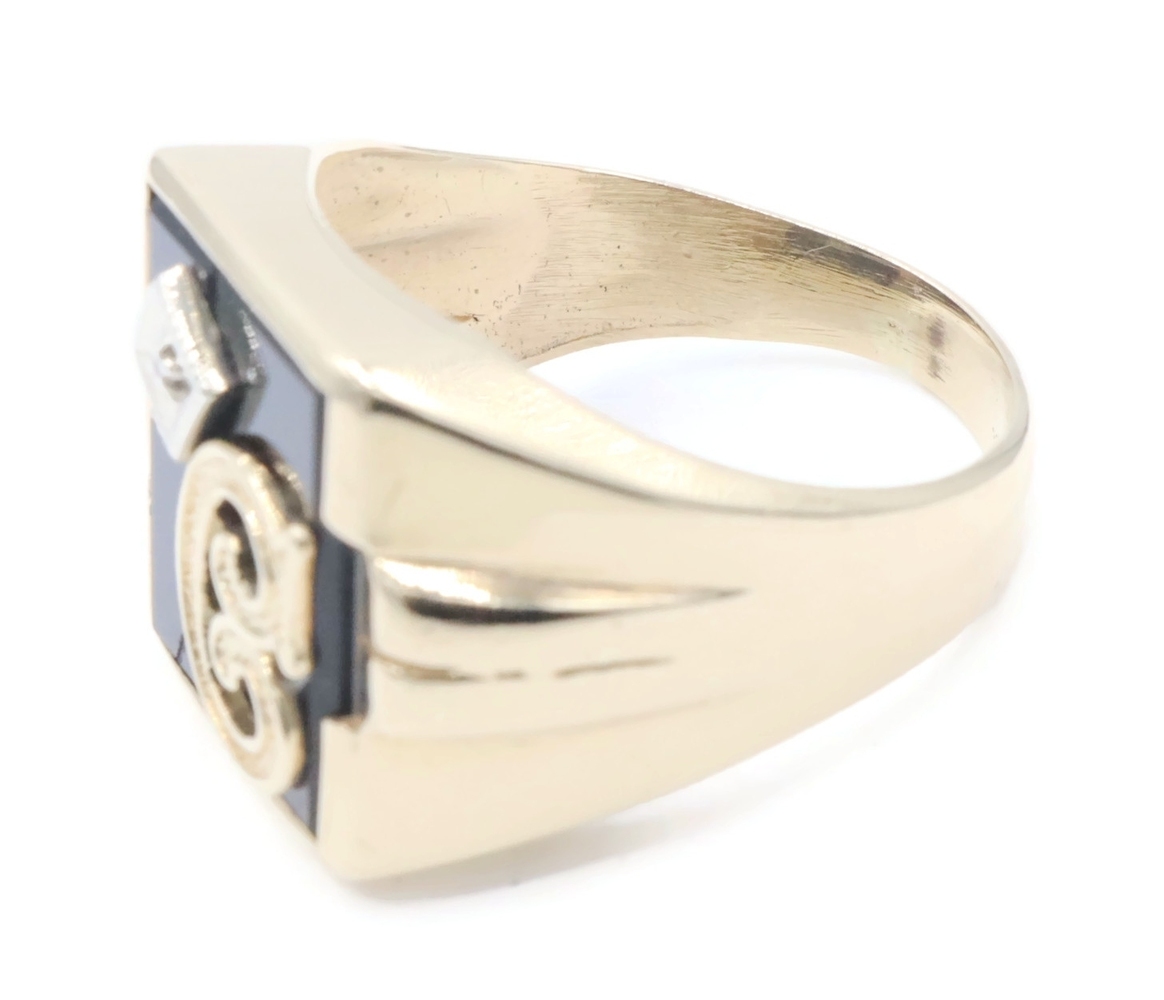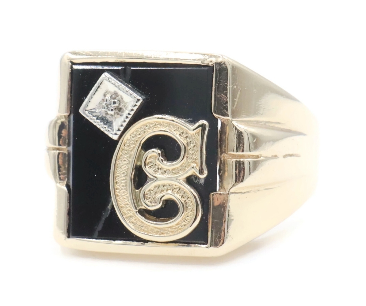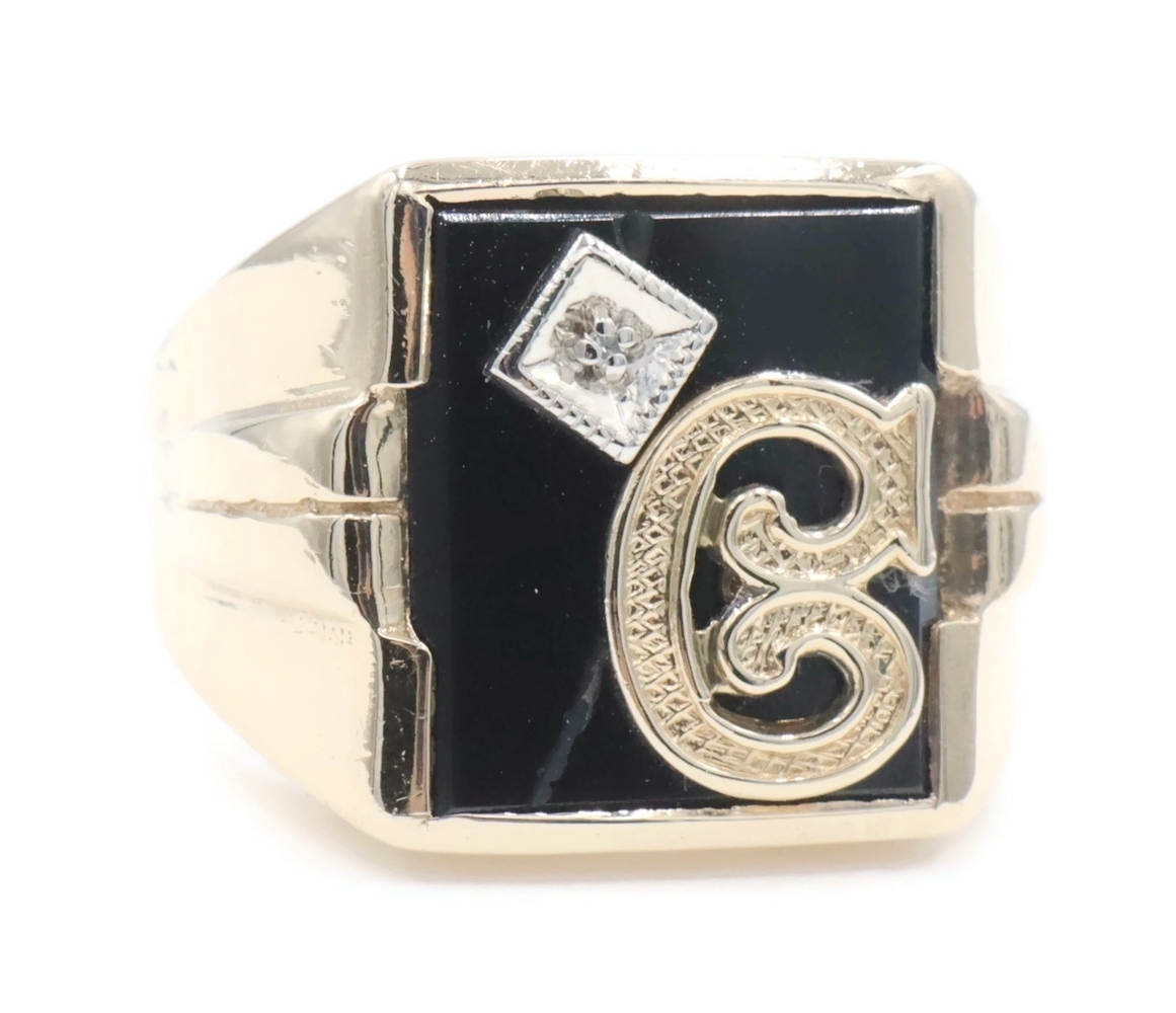 Men's Initial "G" 10KT Yellow Gold Black Onyx Inlay & Round Diamond Accent Ring. This ring is a size 7 3/4.