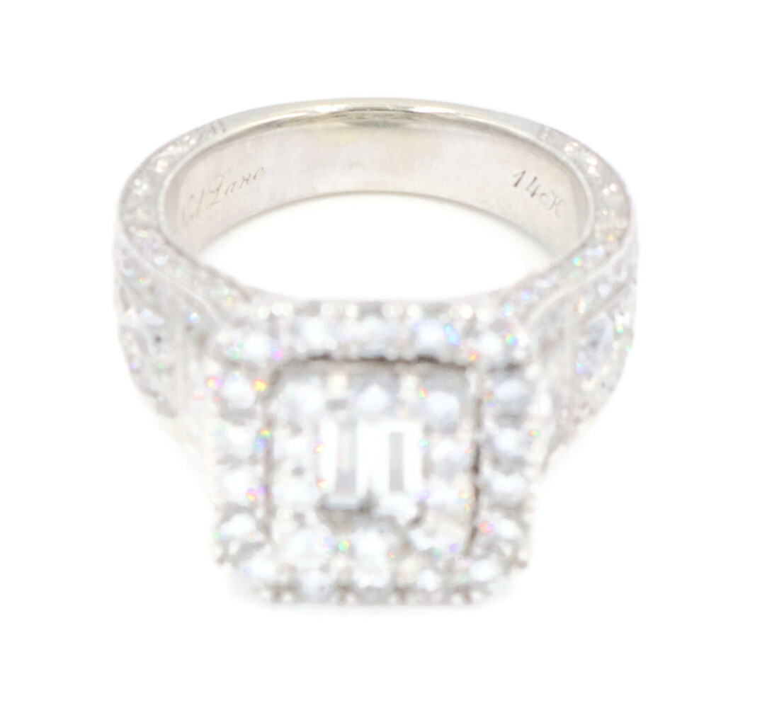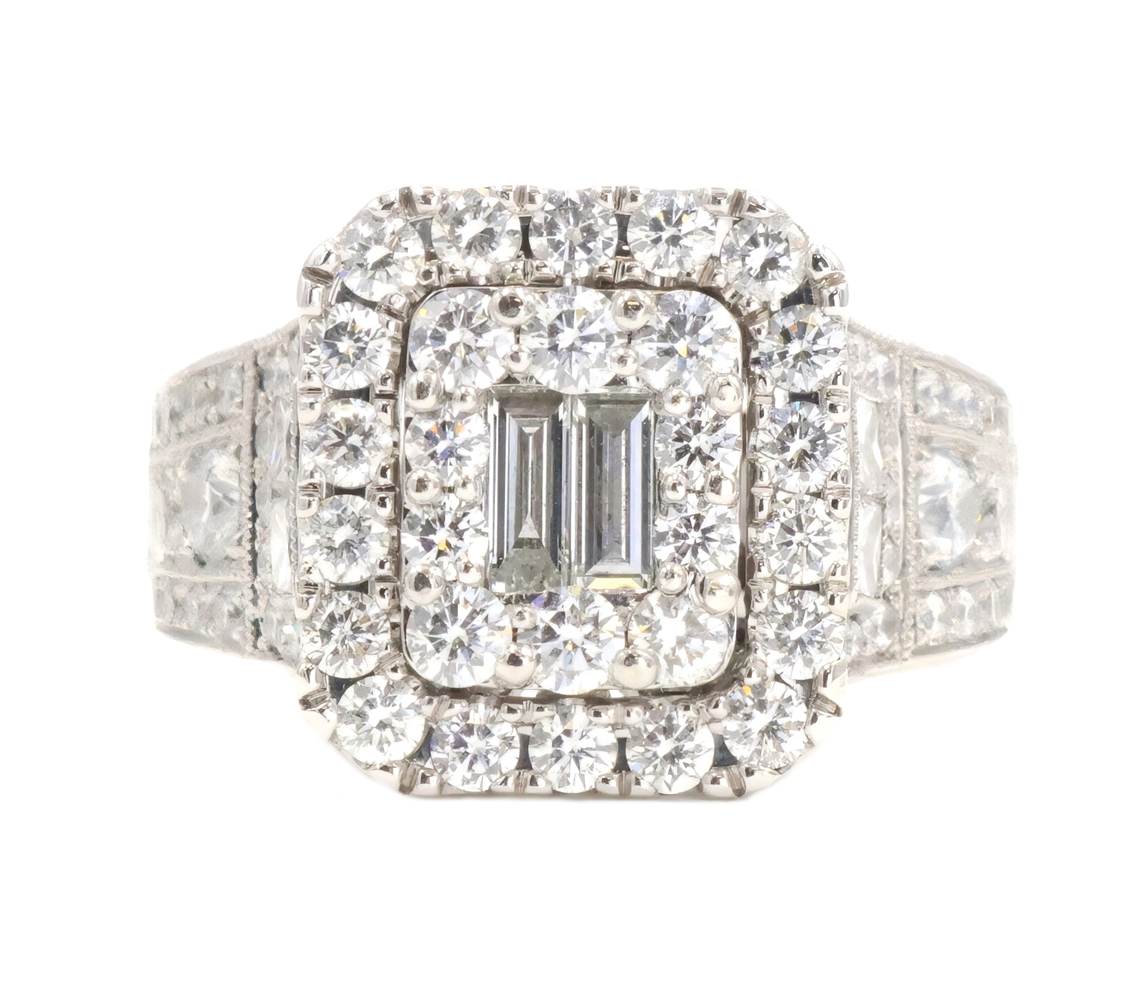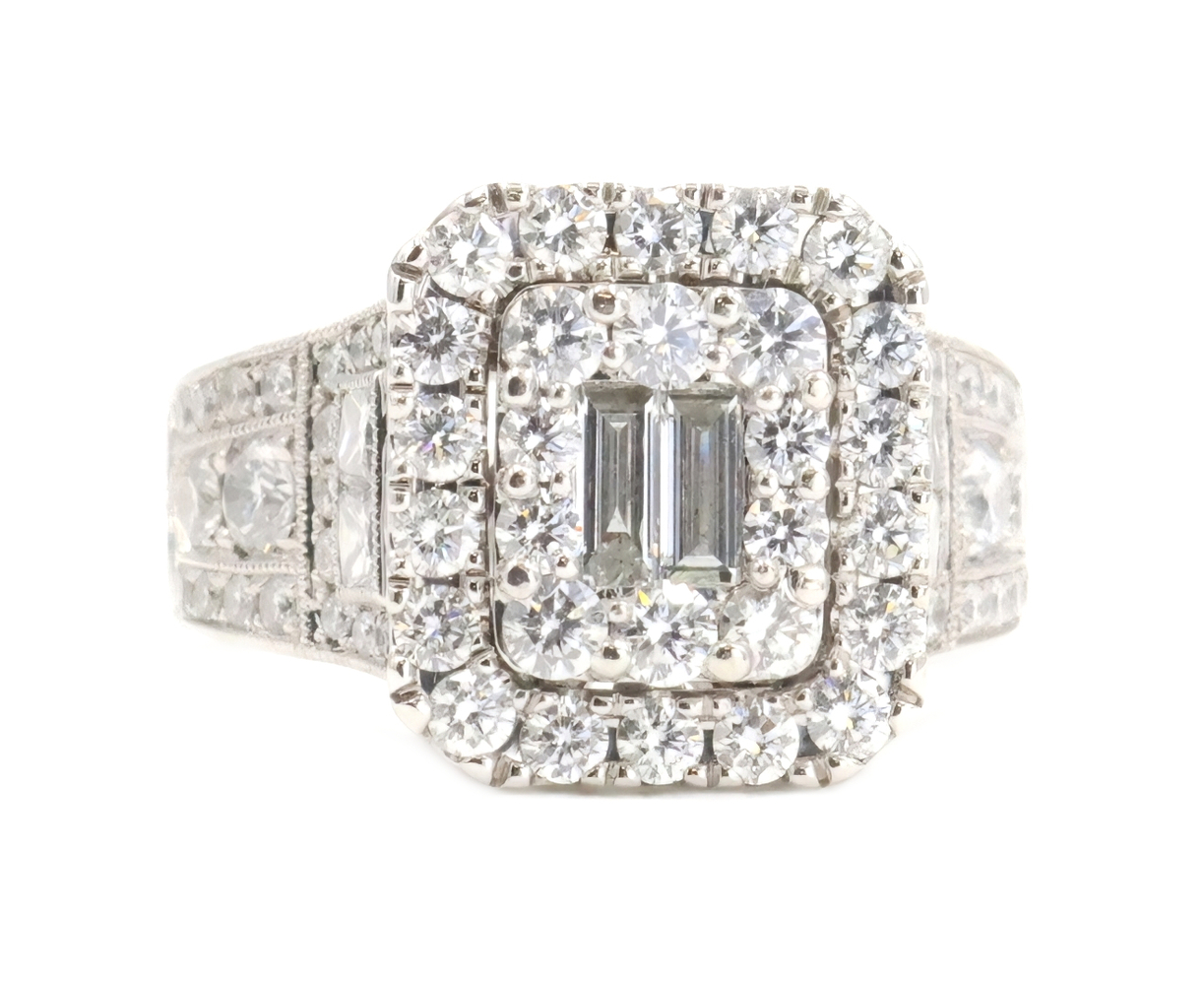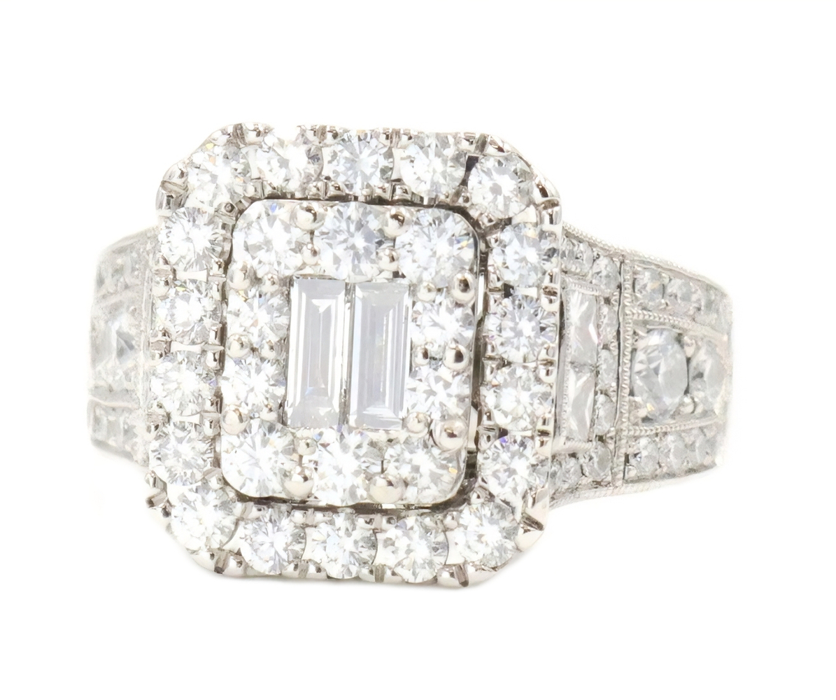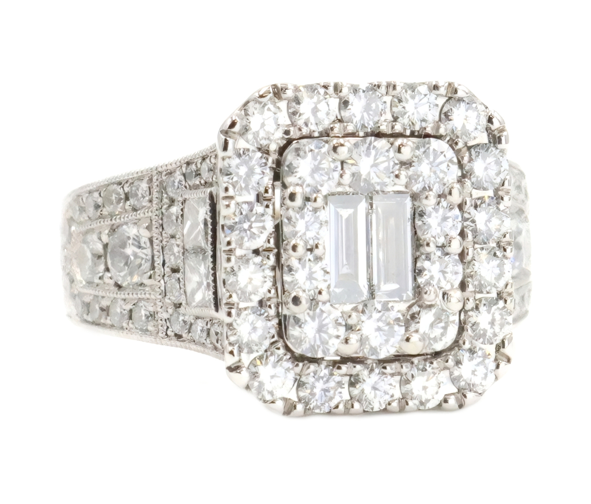 Neil Lane 2.48 cttw Baguette Round Diamond 14KT Double Halo Engagement Ring. This ring is a size 7. In the center of the engagement ring are 2 baguette cut diamonds with a total carat weight of 0.26 cttw. These baguette cut diamonds have a clarity range of SI1 to SI2 with a color range of H to I. This engagement ring also features an additional 4 princess cut diamonds and 146 round brilliant cut diamonds with a approximate carat weight of 2.22 cttw. These diamonds have a clairty range of SI1 to sI2 with a color range of H to I.