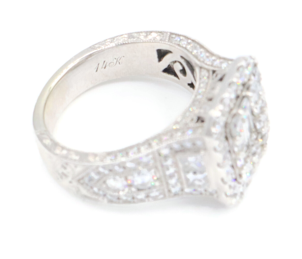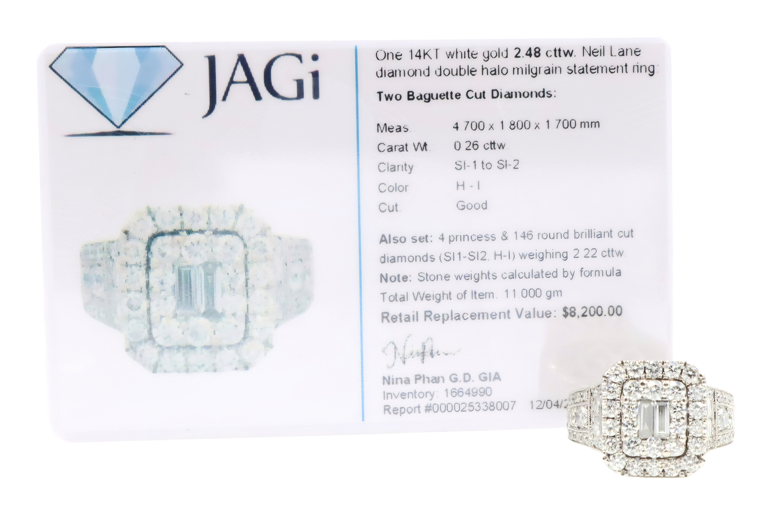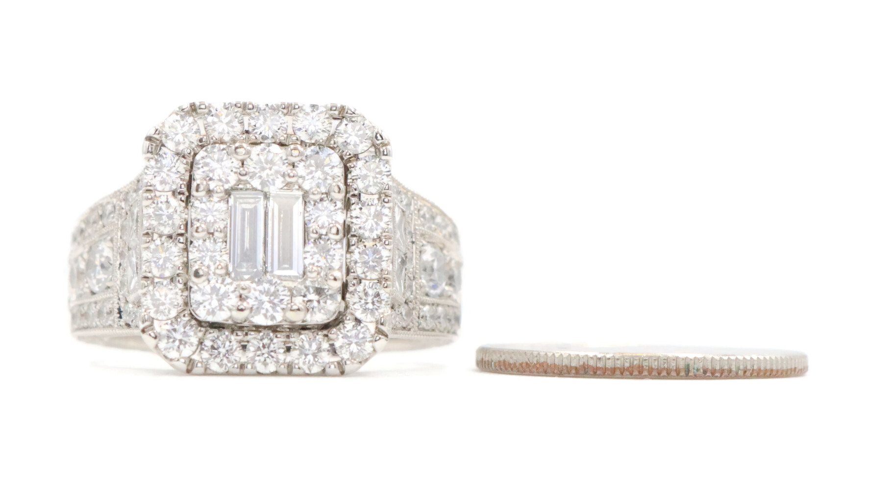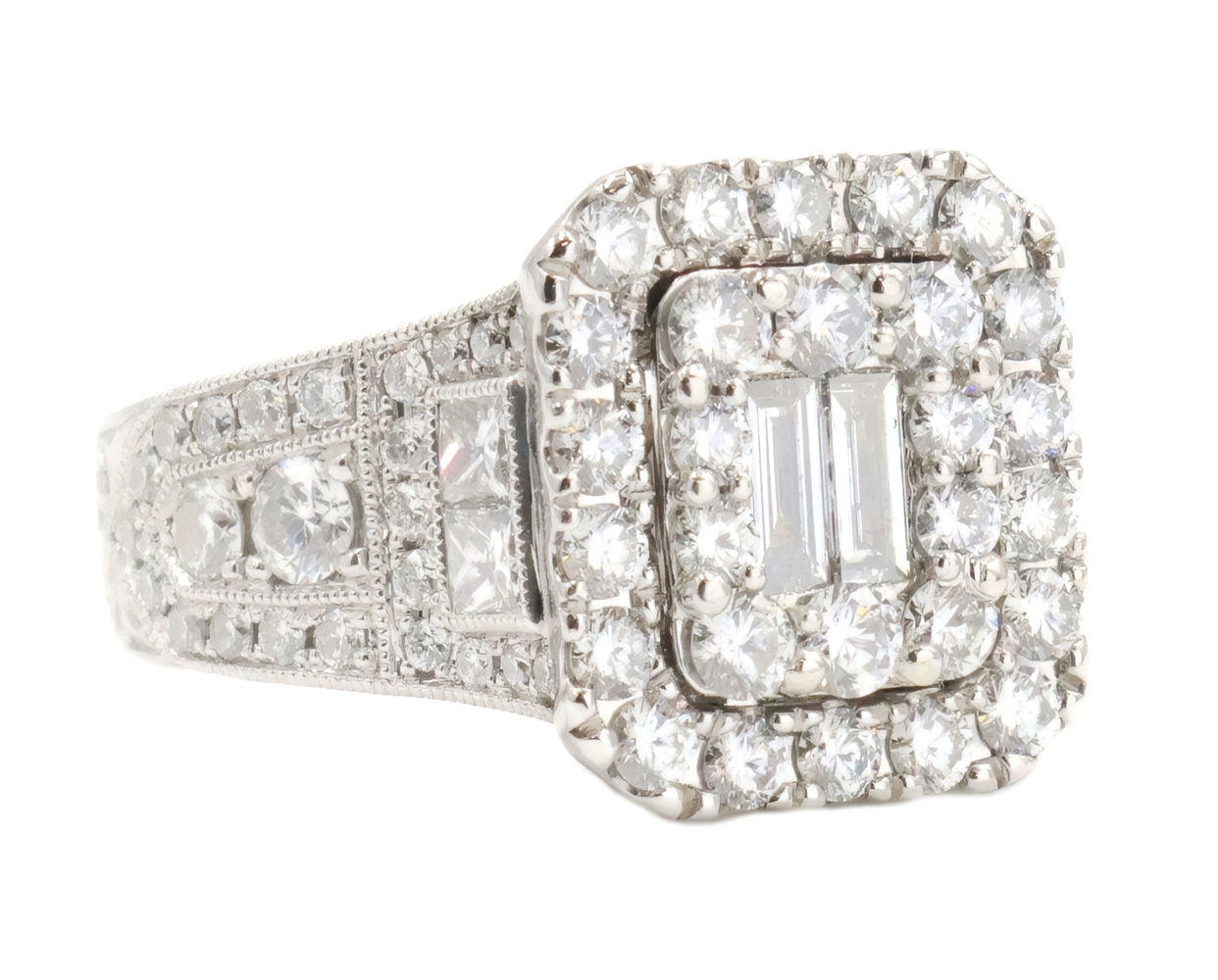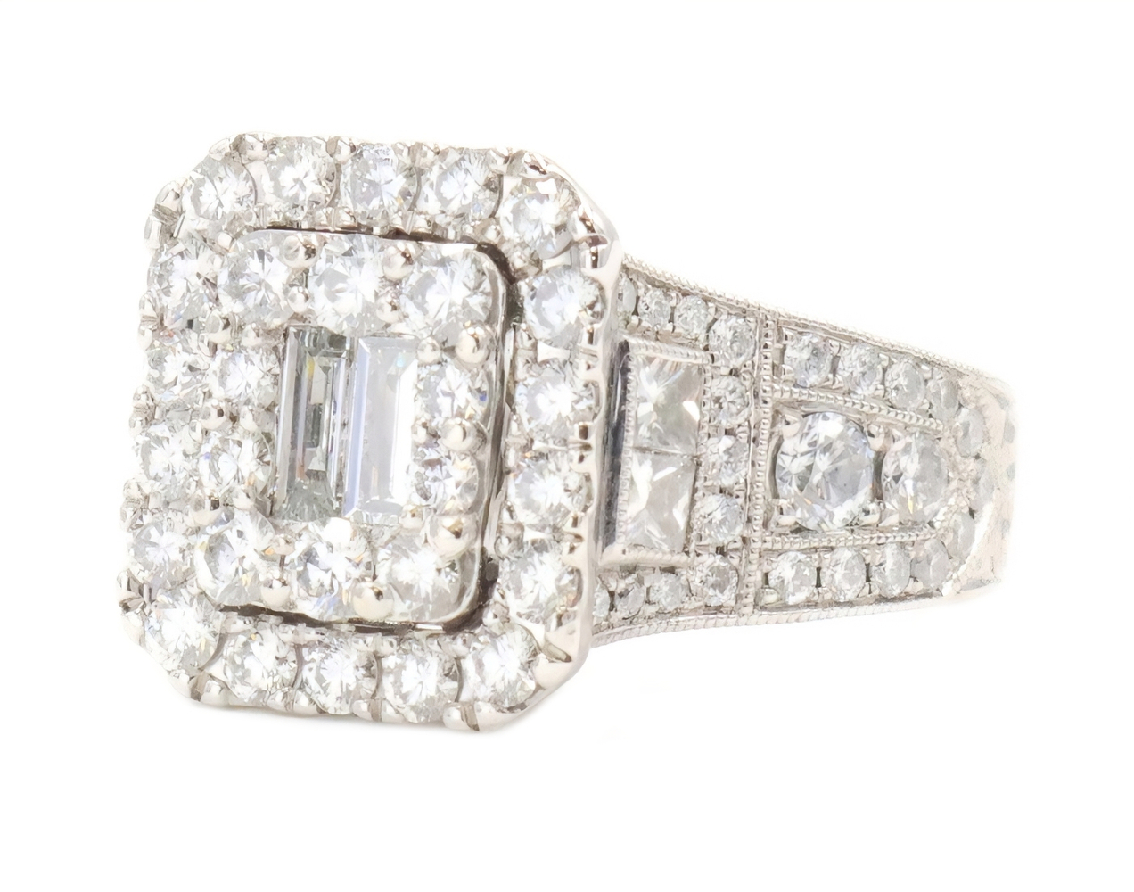 Neil Lane 2.48 cttw Baguette Round Diamond 14KT Double Halo Engagement Ring. This ring is a size 7. In the center of the engagement ring are 2 baguette cut diamonds with a total carat weight of 0.26 cttw. These baguette cut diamonds have a clarity range of SI1 to SI2 with a color range of H to I. This engagement ring also features an additional 4 princess cut diamonds and 146 round brilliant cut diamonds with a approximate carat weight of 2.22 cttw. These diamonds have a clairty range of SI1 to sI2 with a color range of H to I.