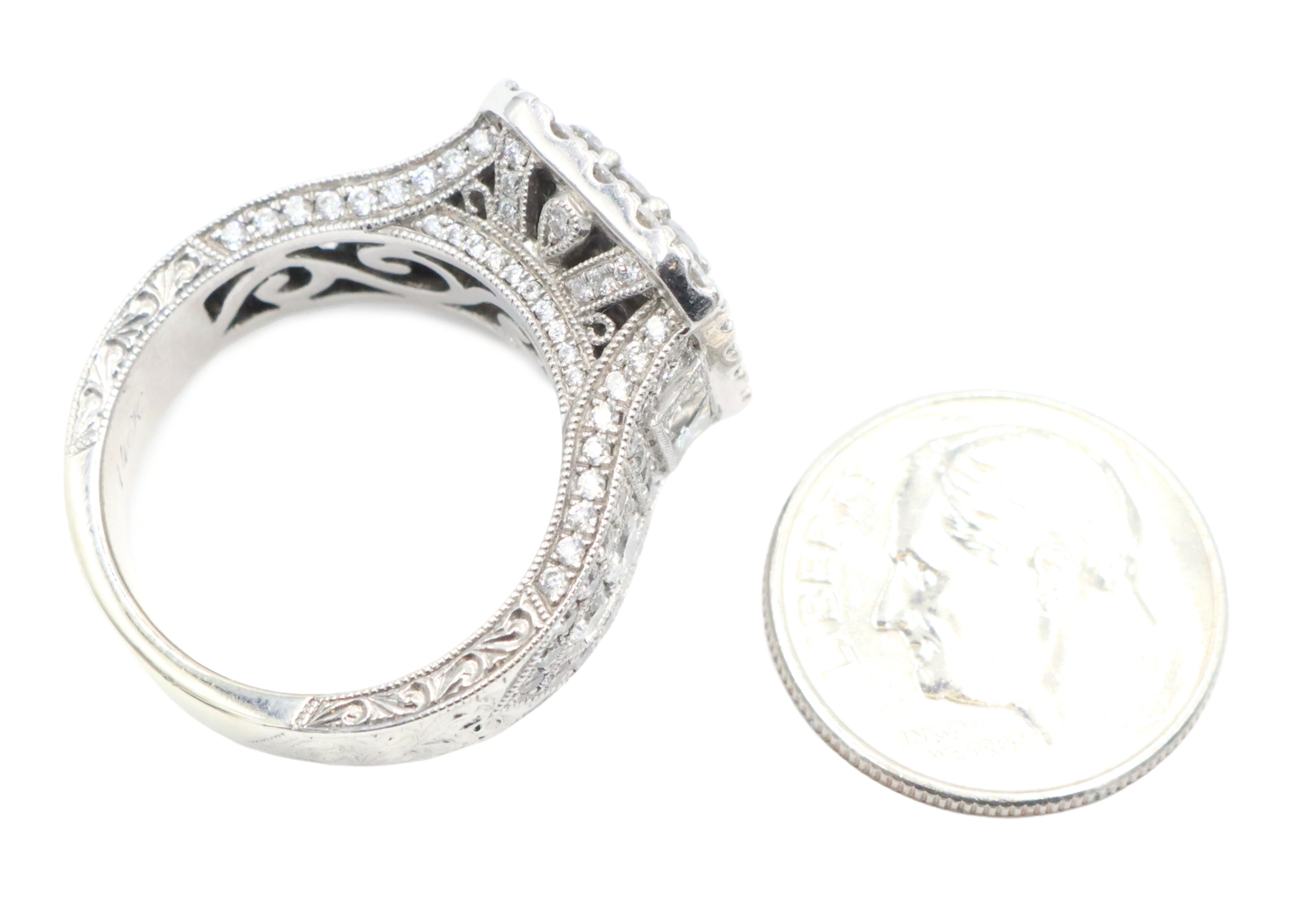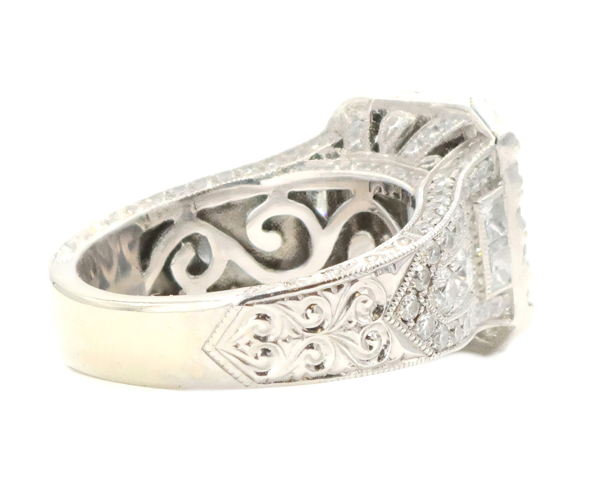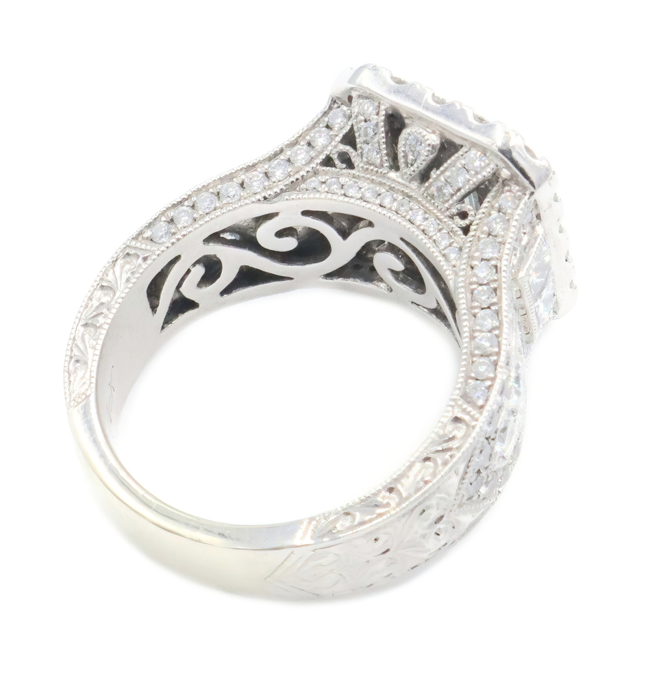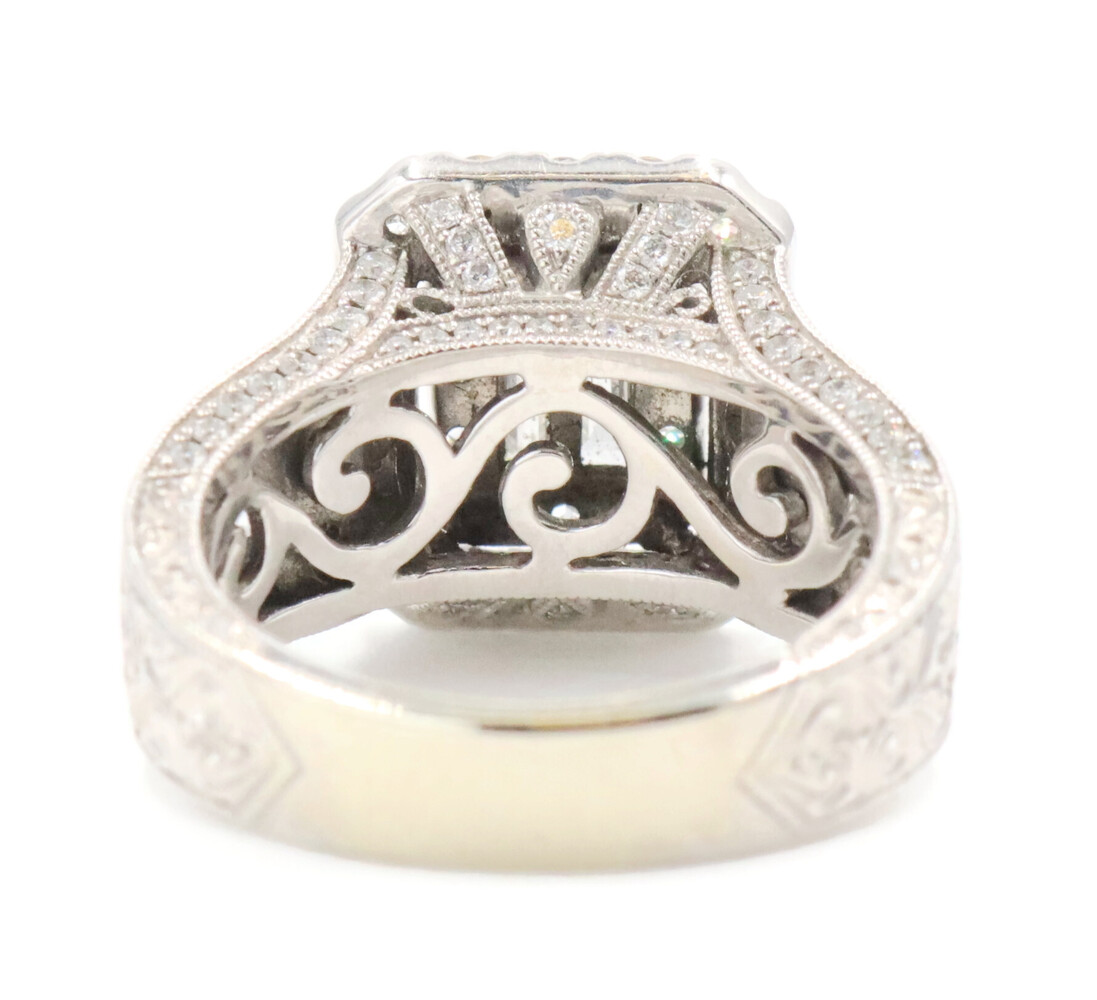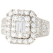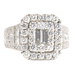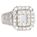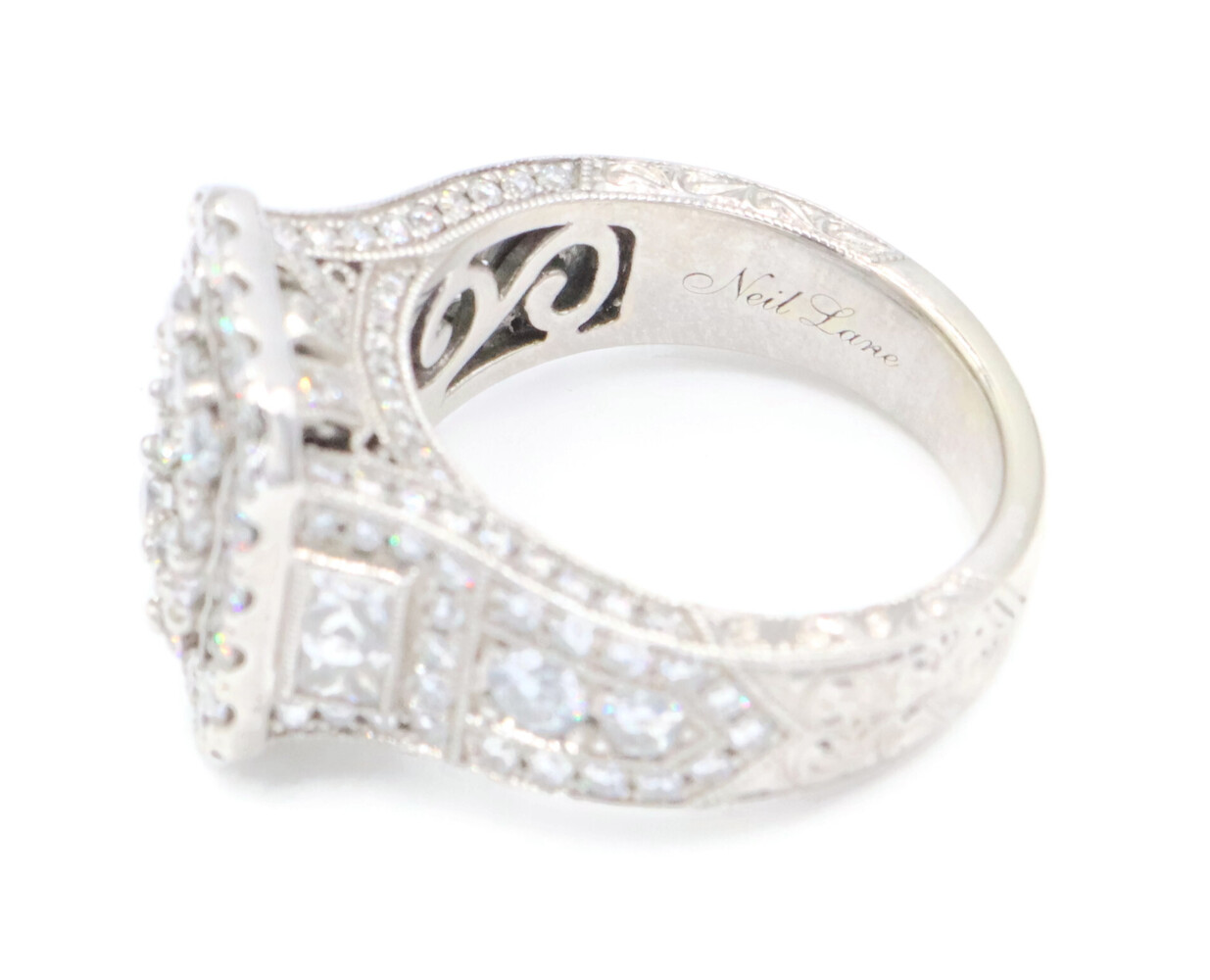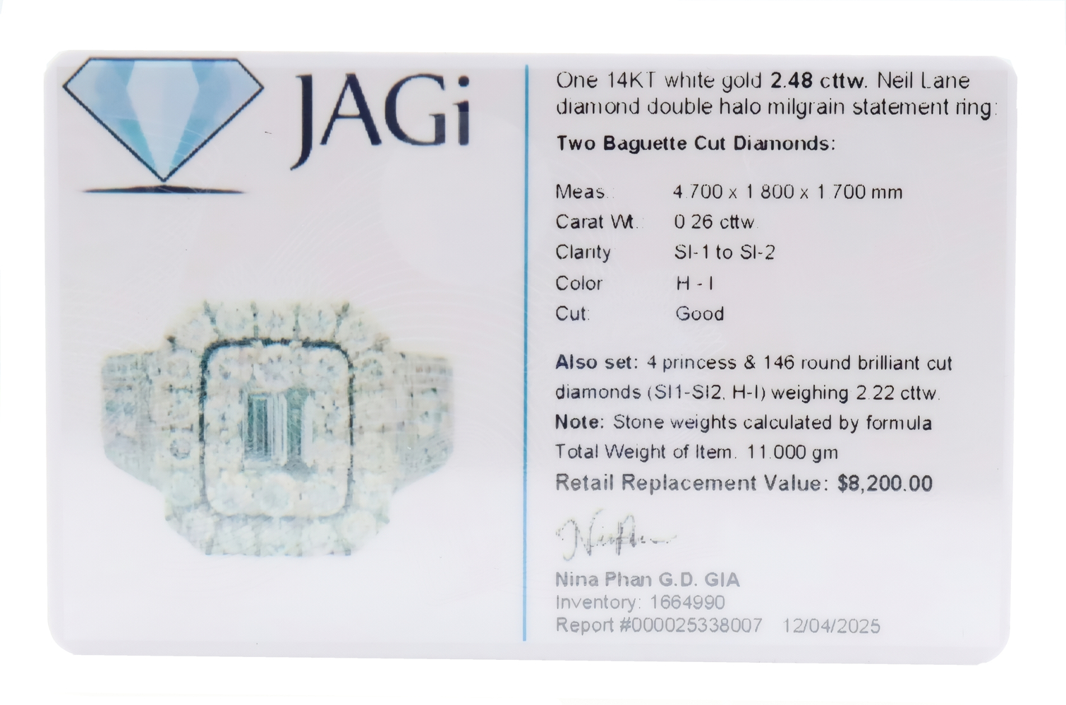 Neil Lane 2.48 cttw Baguette Round Diamond 14KT Double Halo Engagement Ring. This ring is a size 7. In the center of the engagement ring are 2 baguette cut diamonds with a total carat weight of 0.26 cttw. These baguette cut diamonds have a clarity range of SI1 to SI2 with a color range of H to I. This engagement ring also features an additional 4 princess cut diamonds and 146 round brilliant cut diamonds with a approximate carat weight of 2.22 cttw. These diamonds have a clairty range of SI1 to sI2 with a color range of H to I.