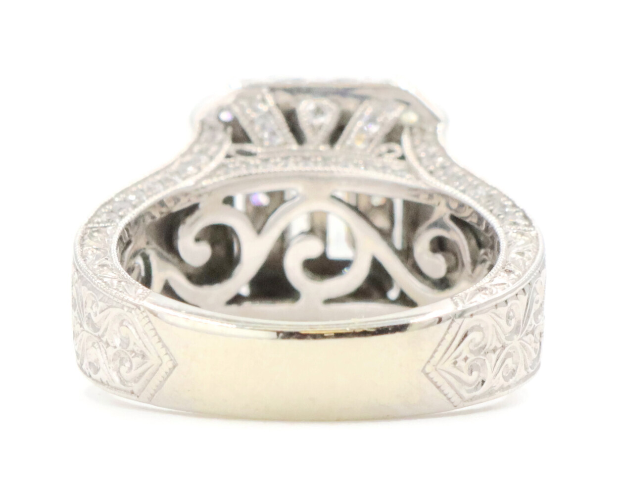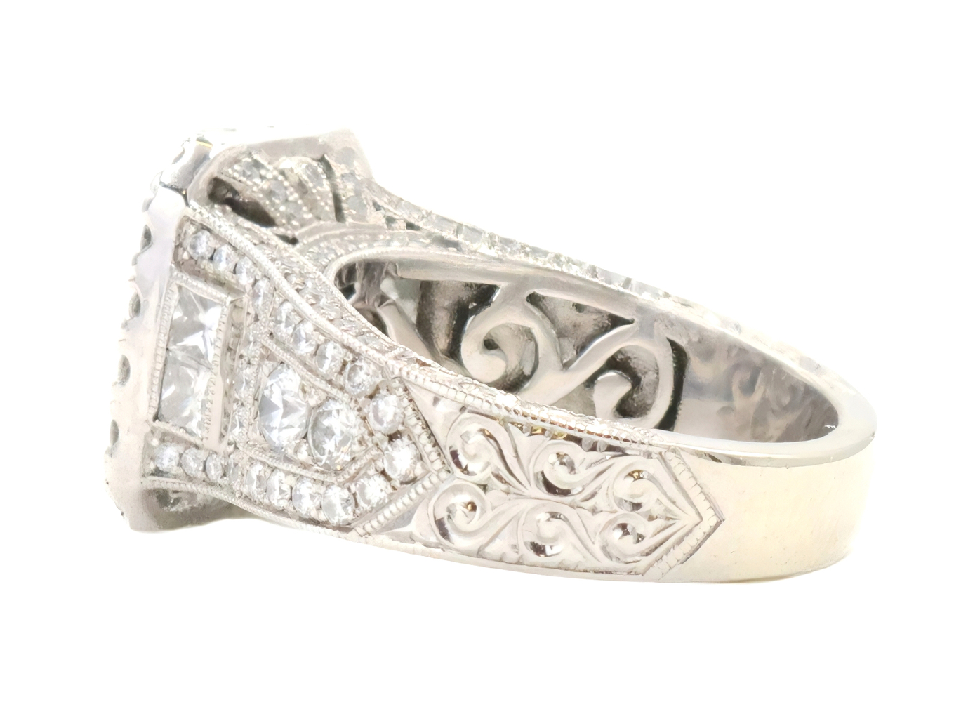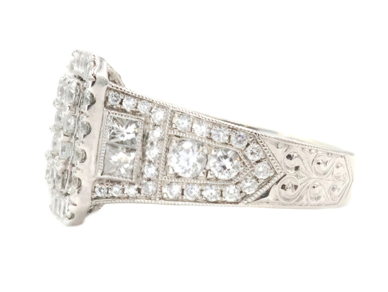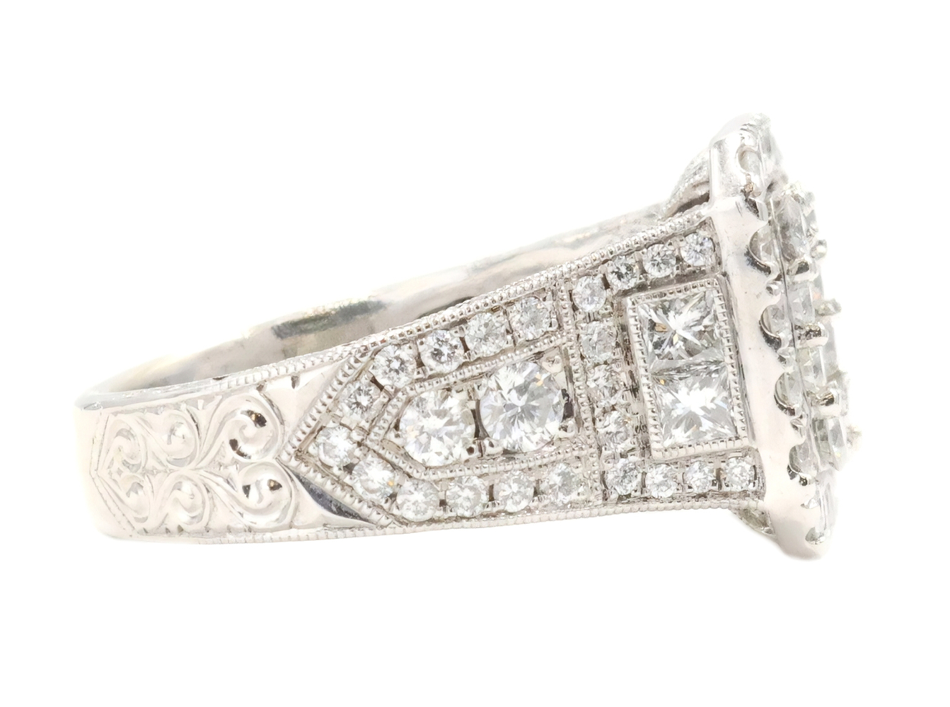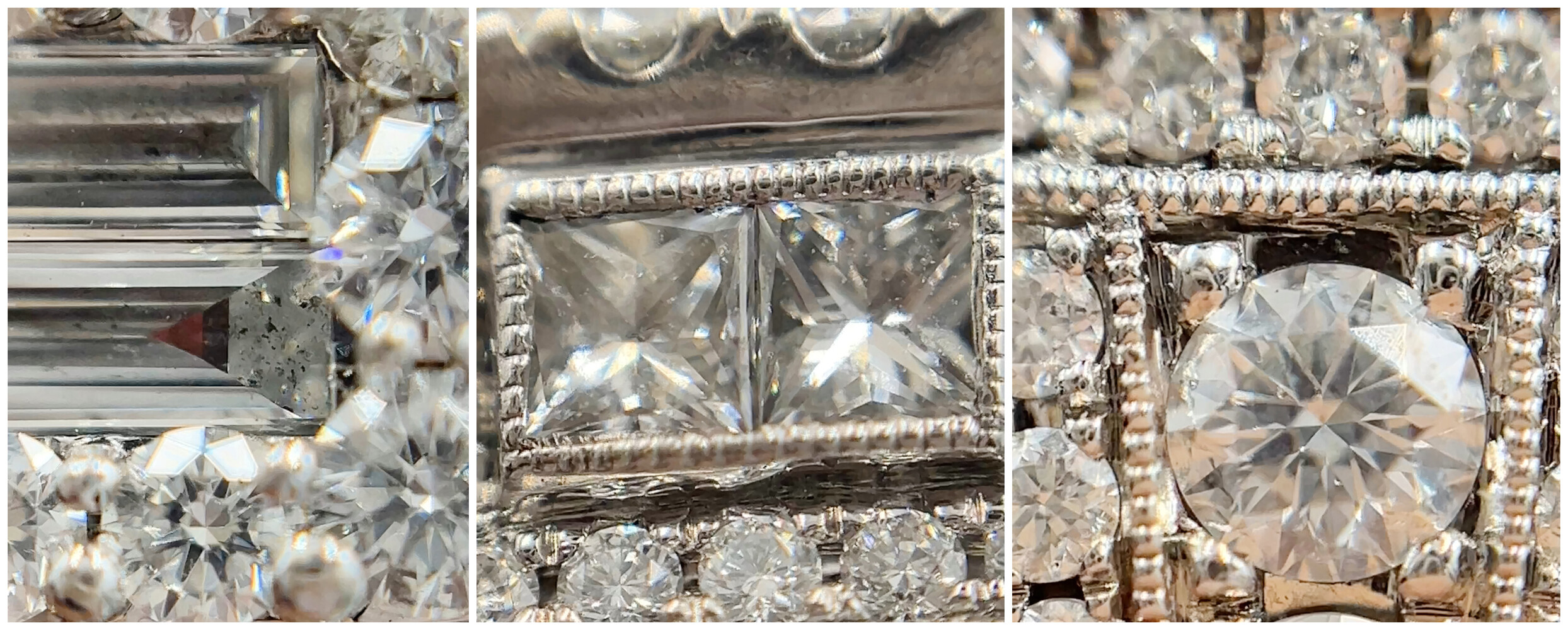 Neil Lane 2.48 cttw Baguette Round Diamond 14KT Double Halo Engagement Ring. This ring is a size 7. In the center of the engagement ring are 2 baguette cut diamonds with a total carat weight of 0.26 cttw. These baguette cut diamonds have a clarity range of SI1 to SI2 with a color range of H to I. This engagement ring also features an additional 4 princess cut diamonds and 146 round brilliant cut diamonds with a approximate carat weight of 2.22 cttw. These diamonds have a clairty range of SI1 to sI2 with a color range of H to I.