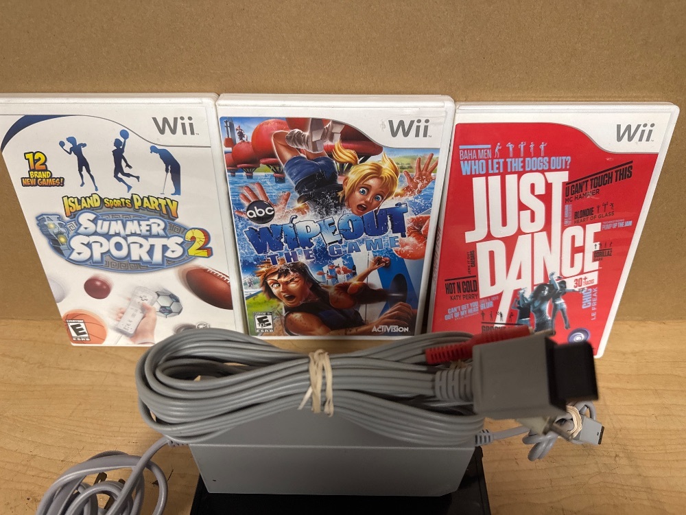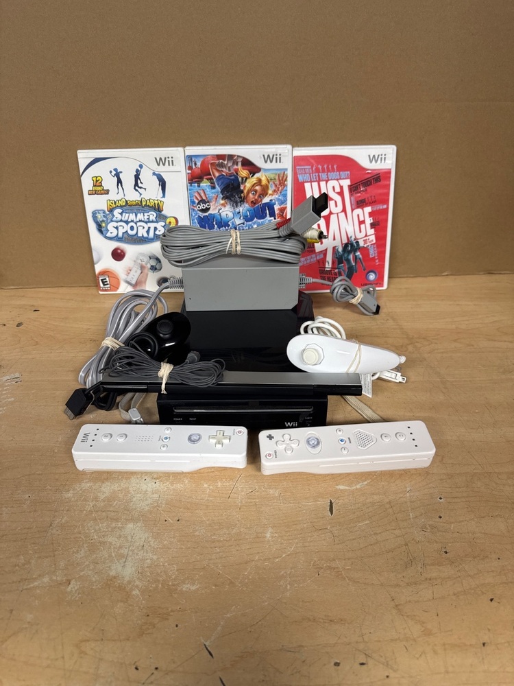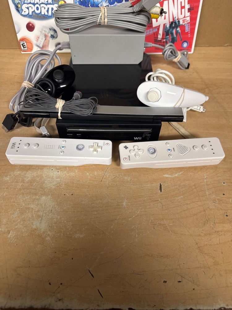 NINTENDO RVL-101 WII GAMING CONSOLE / POWER CORD / VIDEO CABLE / (2) REMOTES / (2) NUNCHUCKS / SENSOR BAR / GAMES