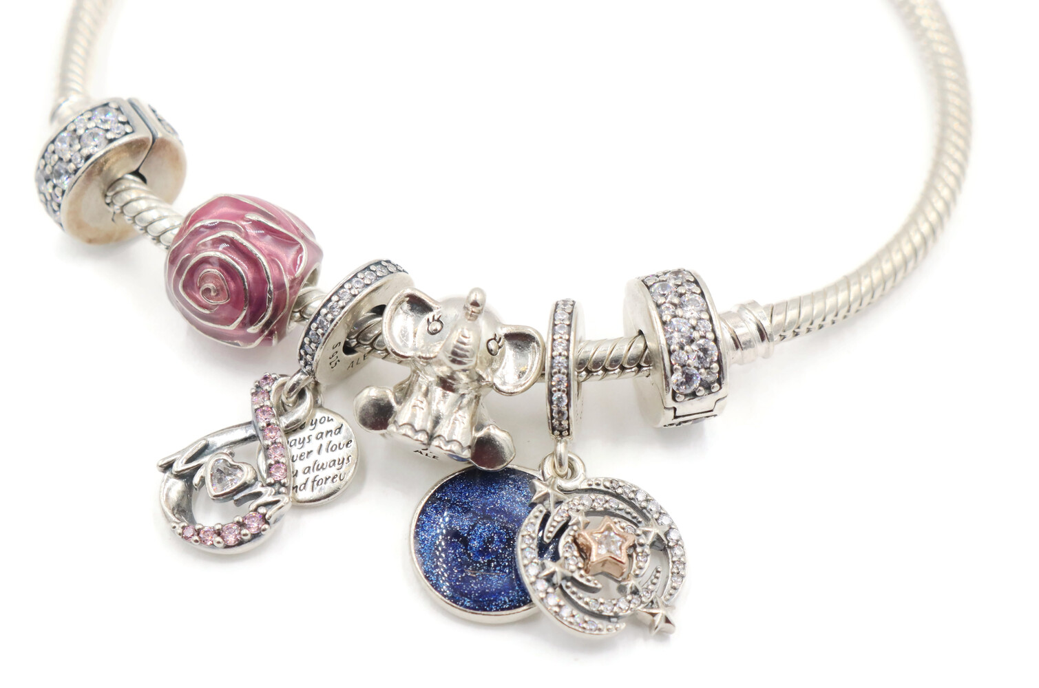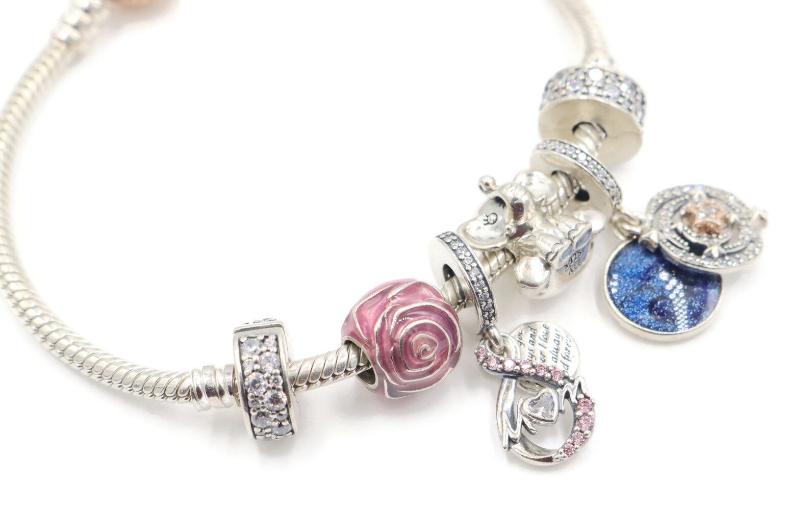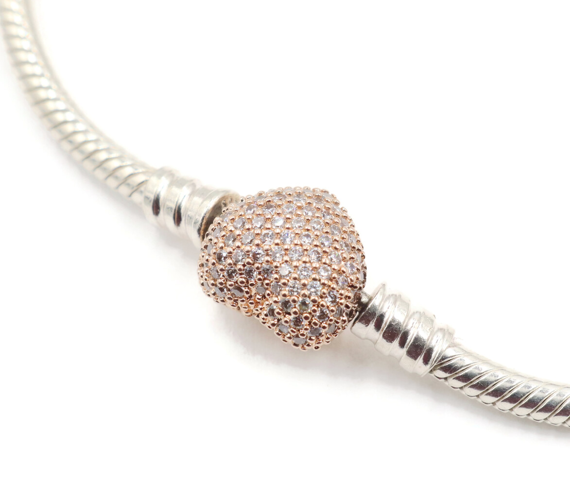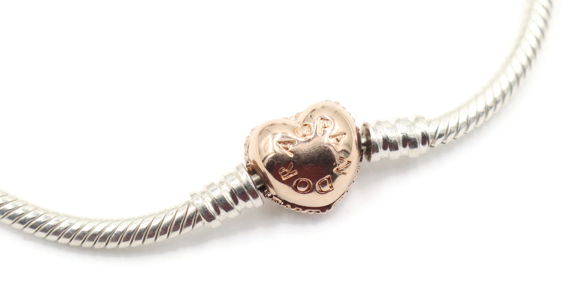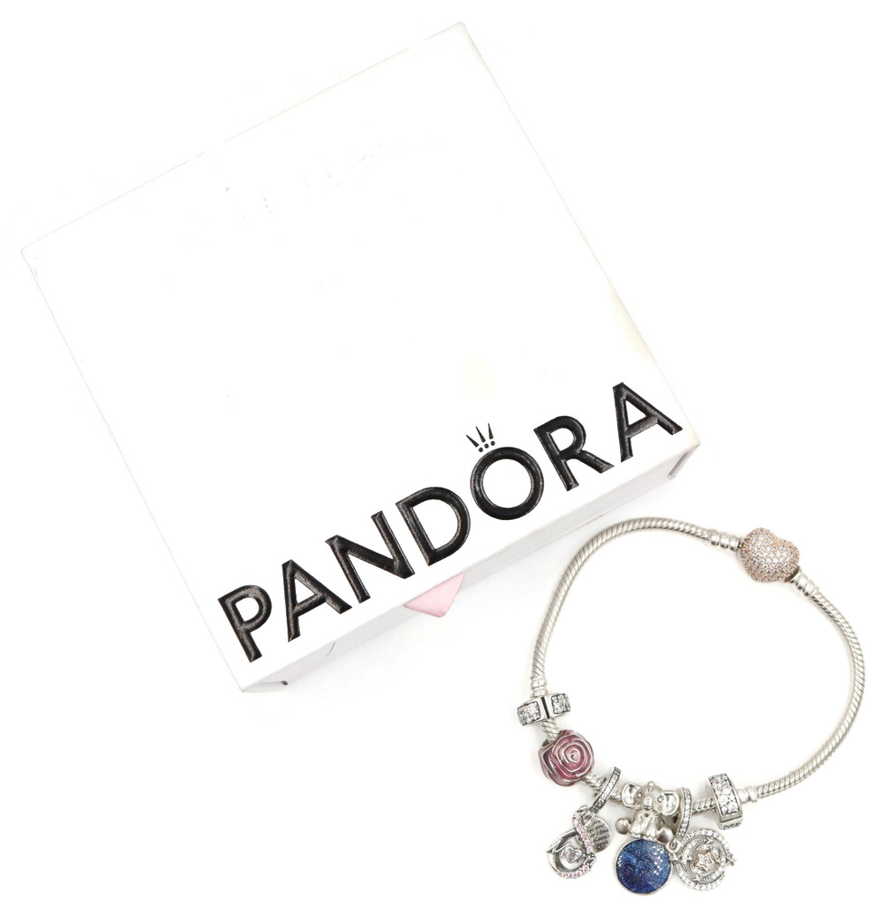 Pandora Moments Pavé Heart Clasp Snake Chain Bracelet 7" with 6 Charms in Box | USA Pawn