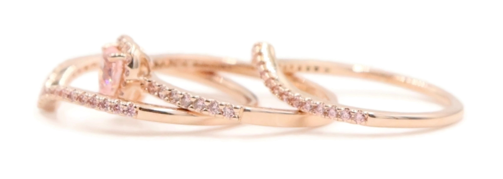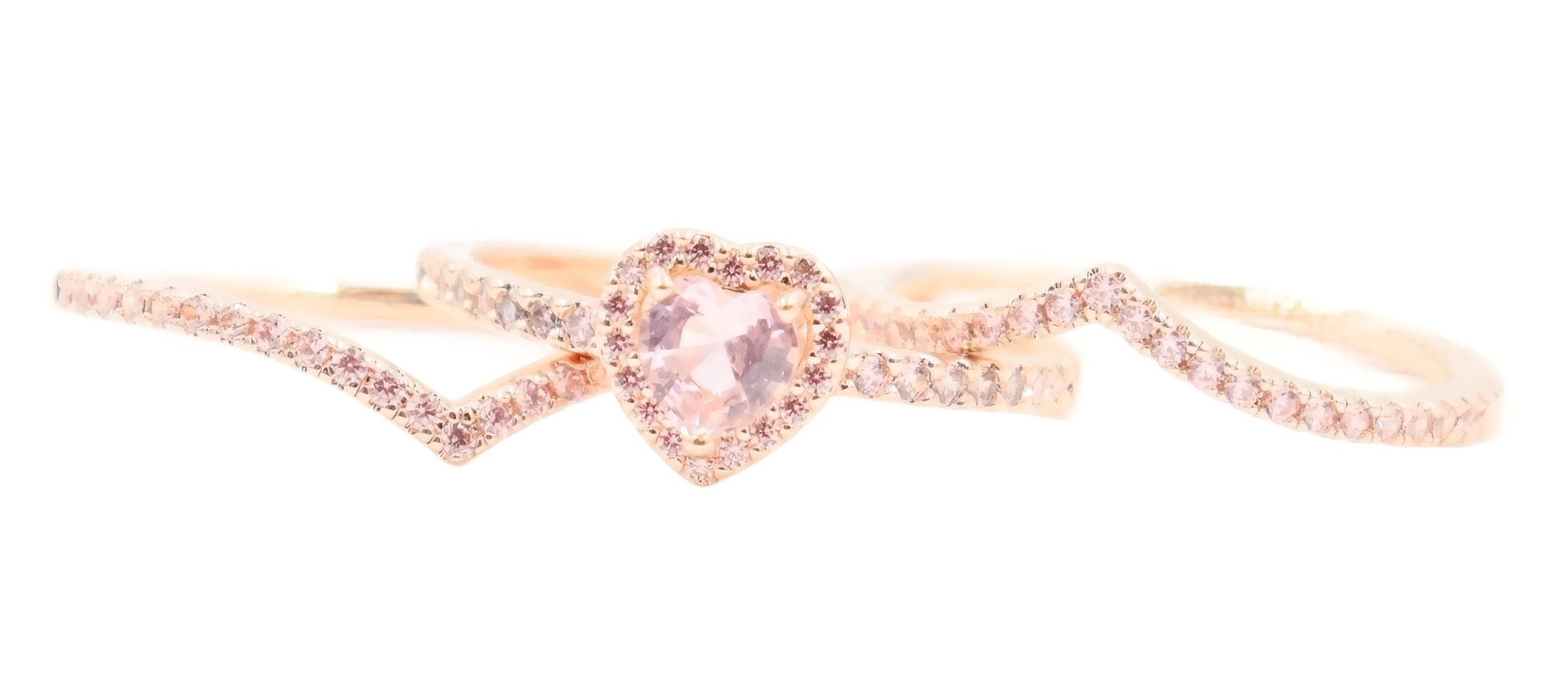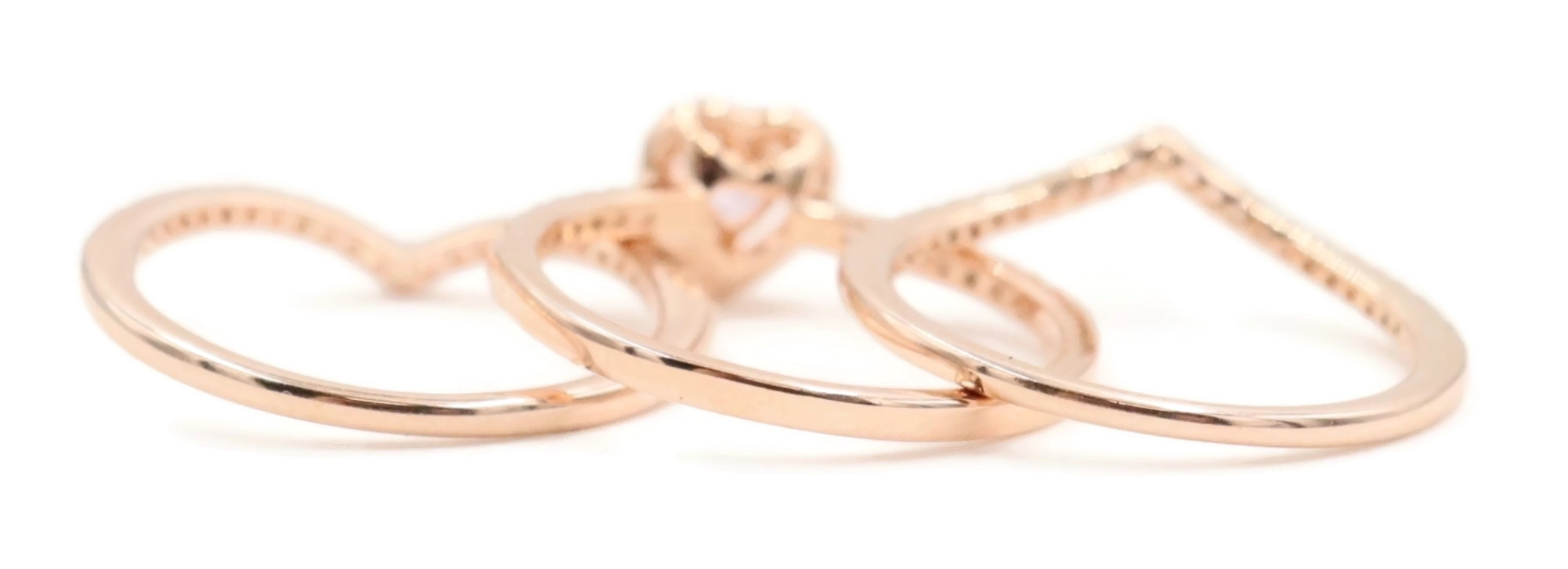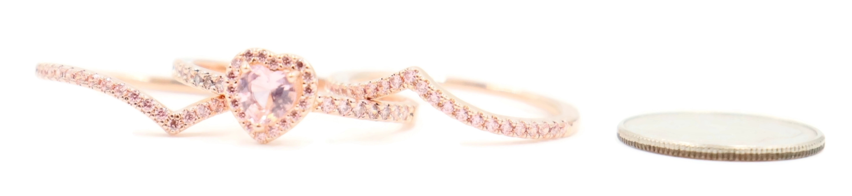 Pandora Sparkling Elevated Heart Ring with 2 Timeless Wish Sparkling Pink Rings. All three rings are a size 9. All three rings are 14K Rose Gold plated with CZs (Cubic Zirconia).