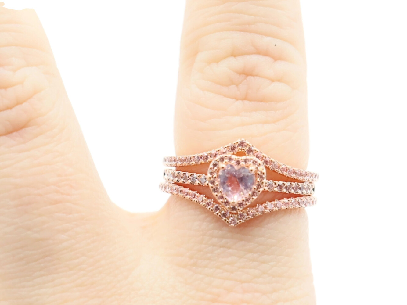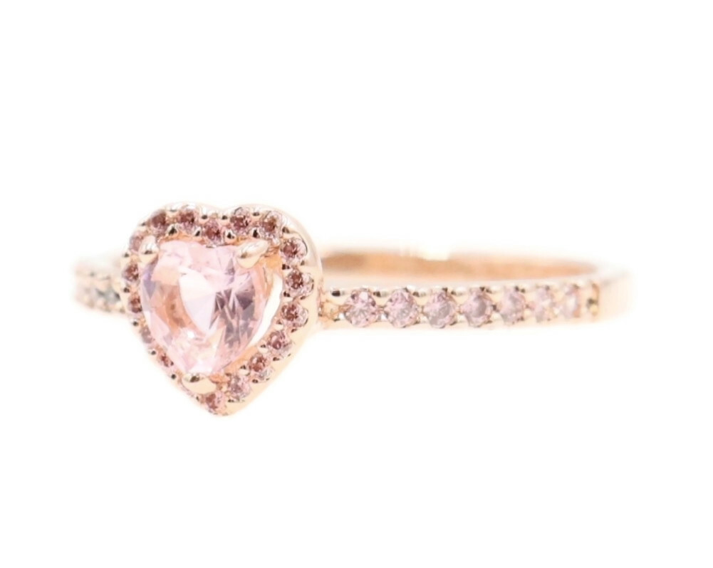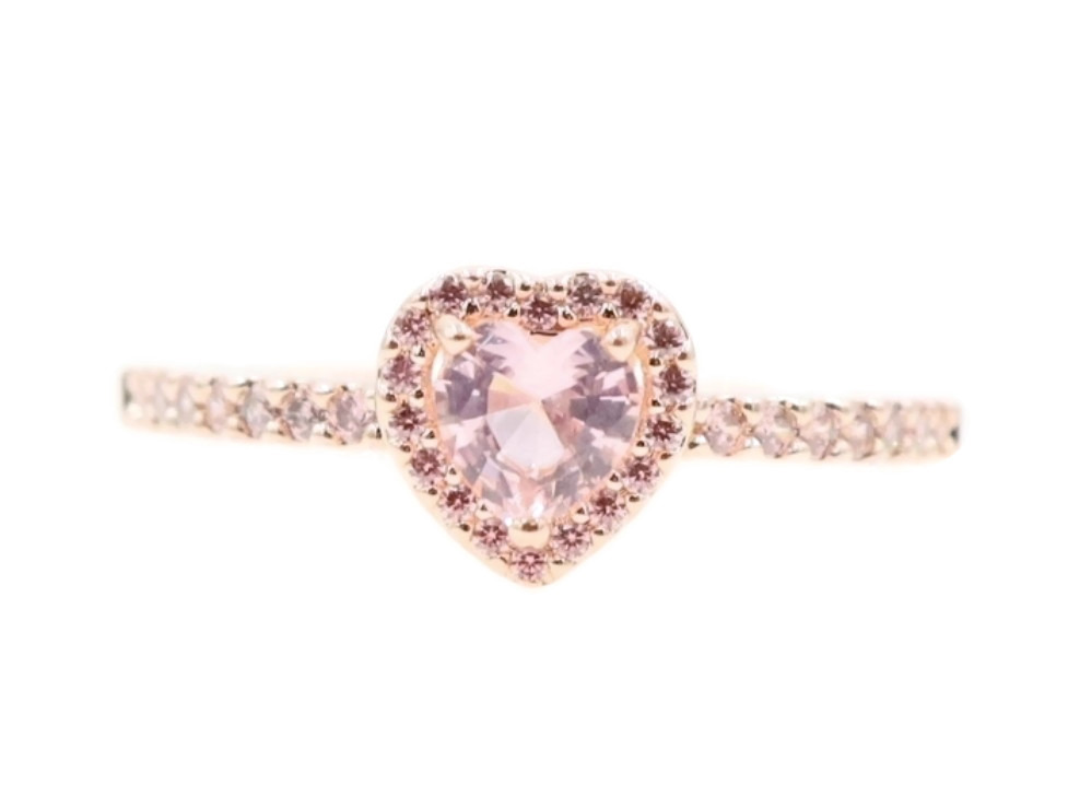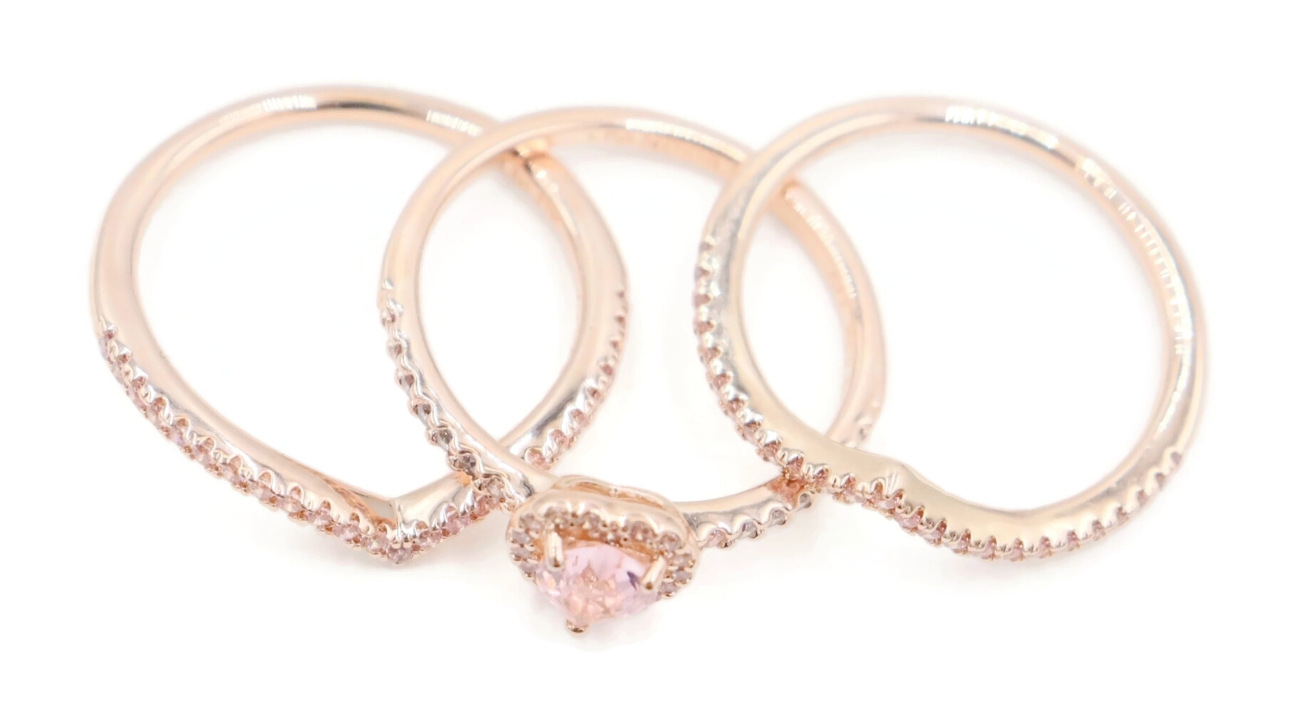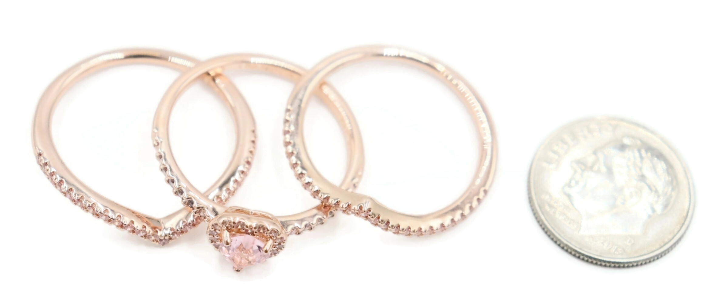 Pandora Sparkling Elevated Heart Ring with 2 Timeless Wish Sparkling Pink Rings. All three rings are a size 9. All three rings are 14K Rose Gold plated with CZs (Cubic Zirconia).