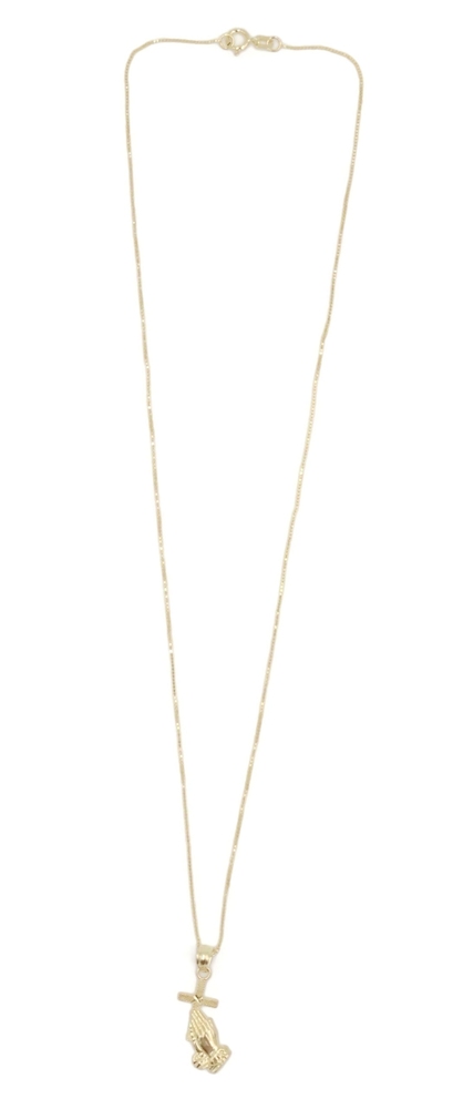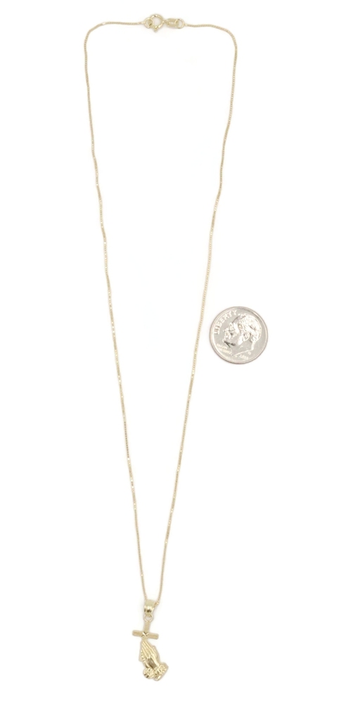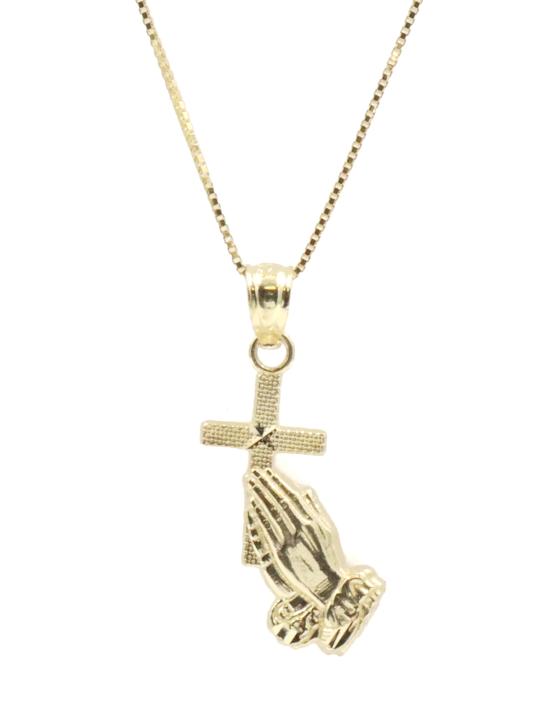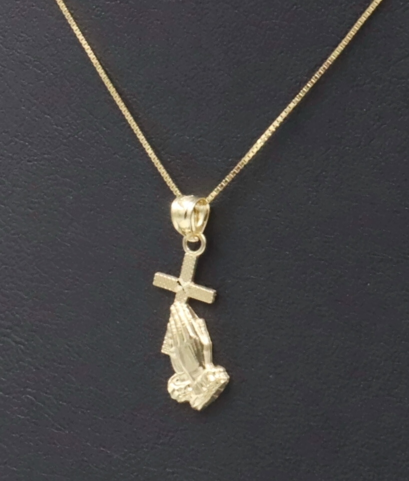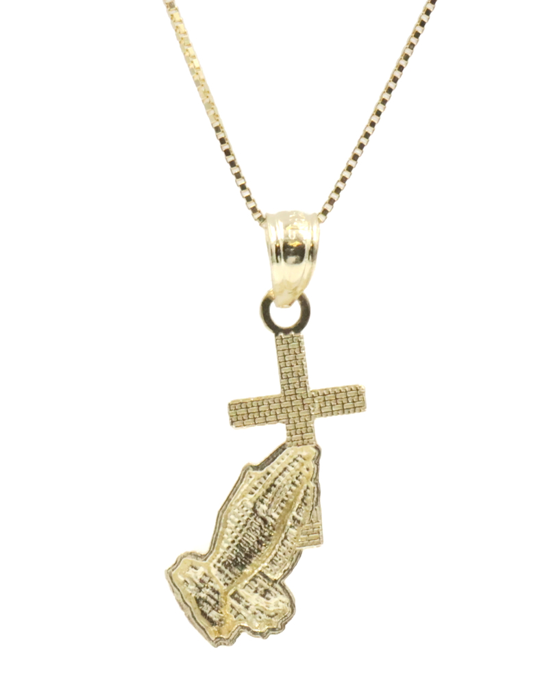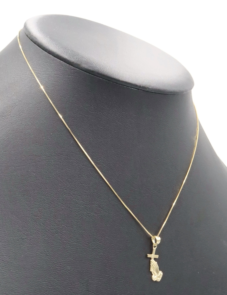 Praying Hands & Cross 10KT Yellow Gold Pendant on 16.5" Box Chain Necklace 1.4g. Both the necklace and pendant are 10KT yellow gold.