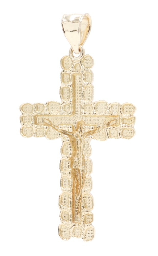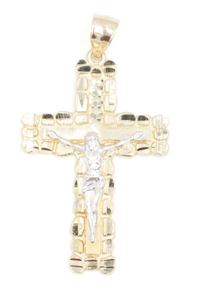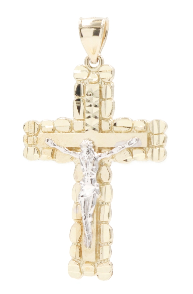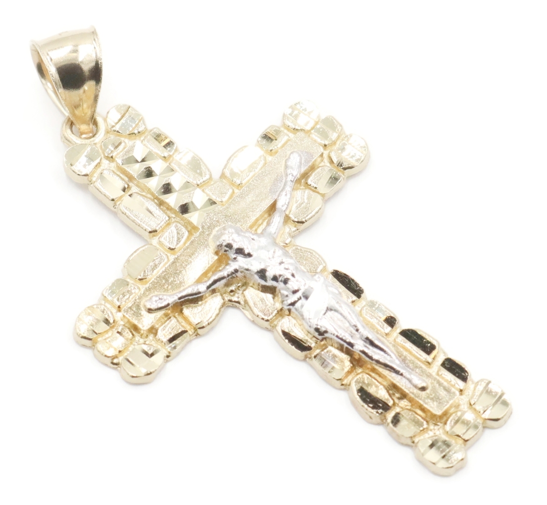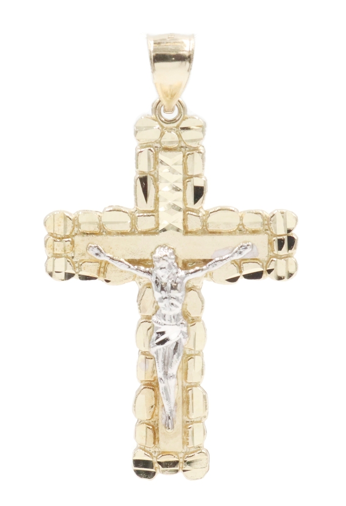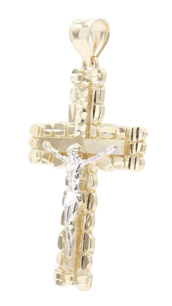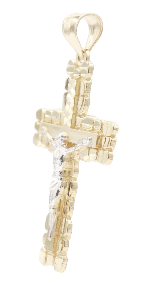 Religious 10KT Two-Tone Gold Diamond-Cut Nugget Crucifix Pendant 2" RL - 4.33g. This pendant is approximately 51.5mm in length (including the bail) and 29.1mm in width.