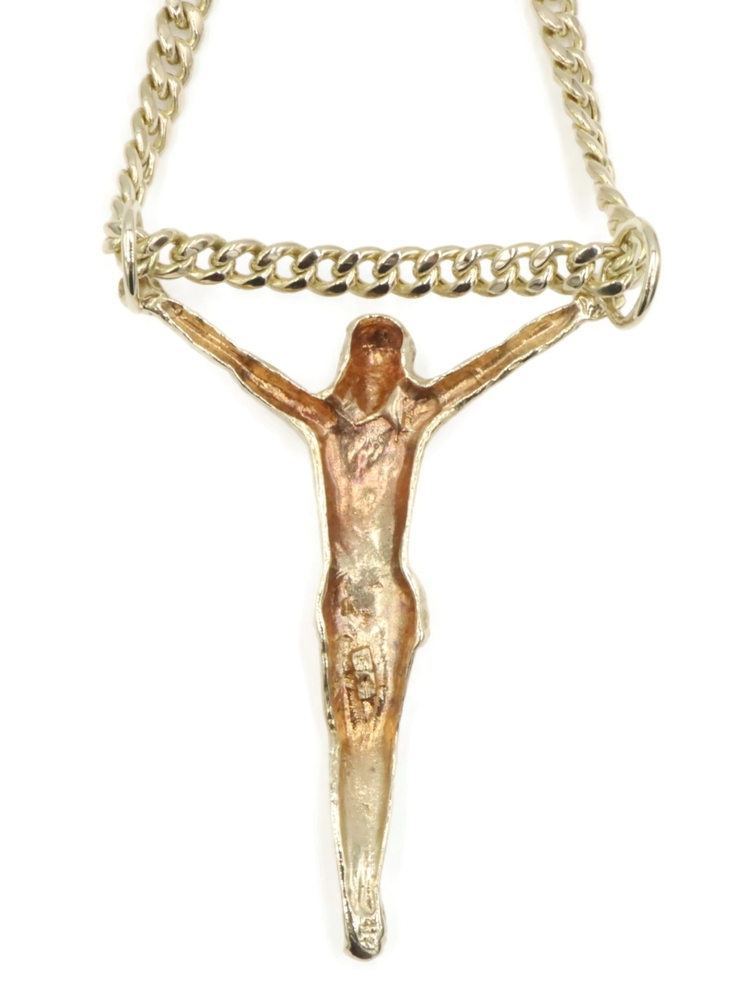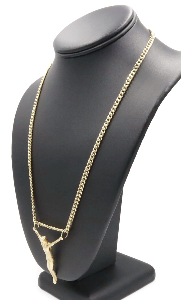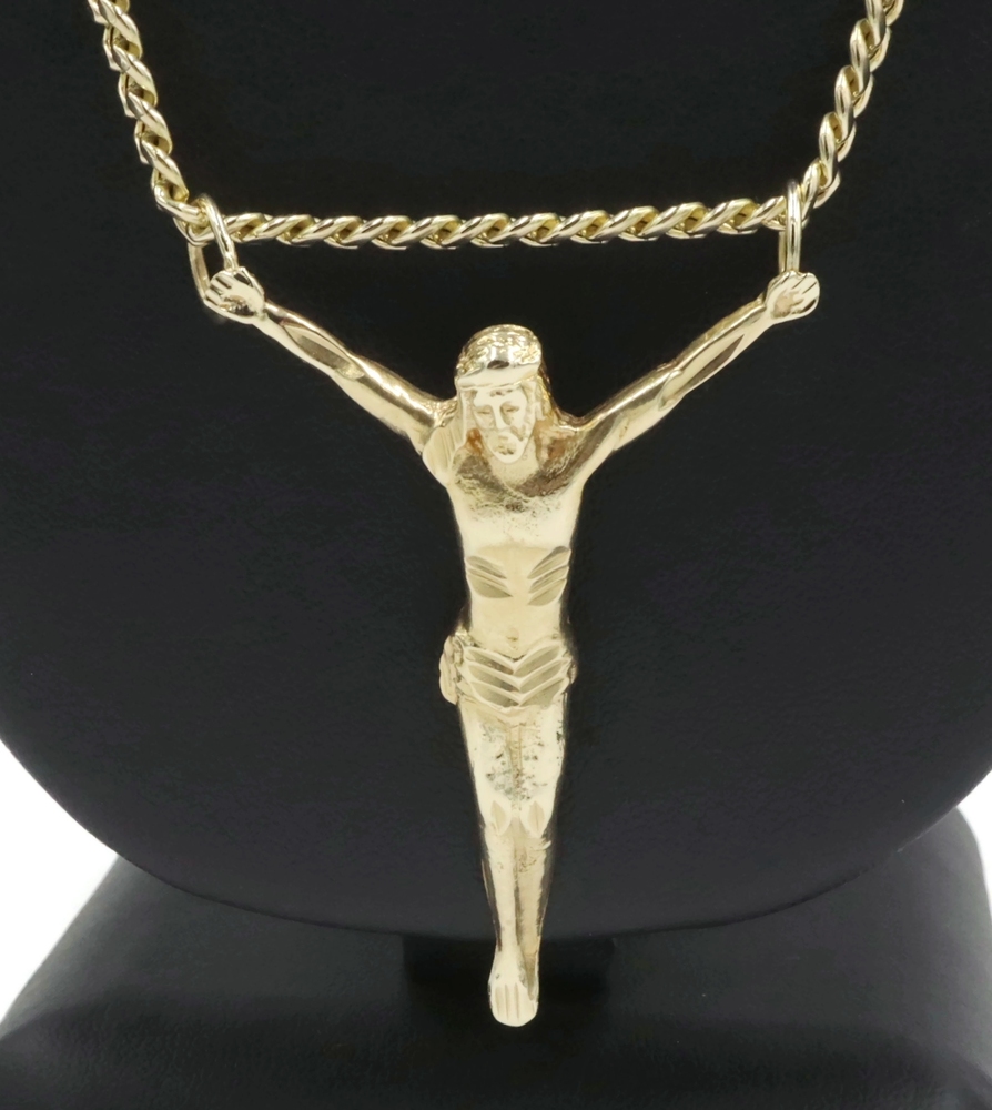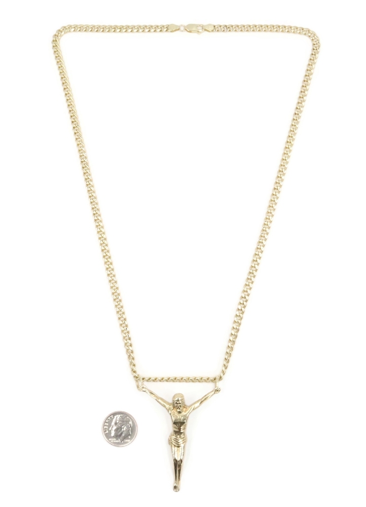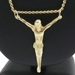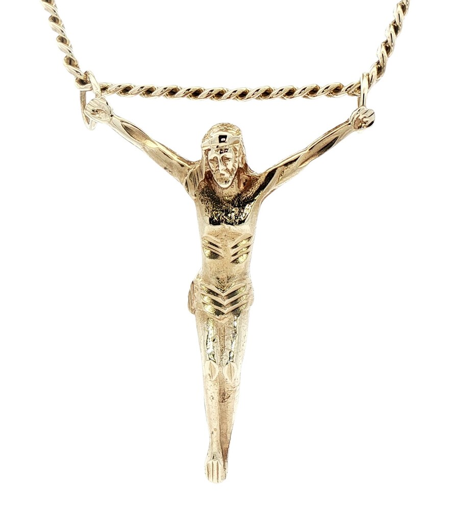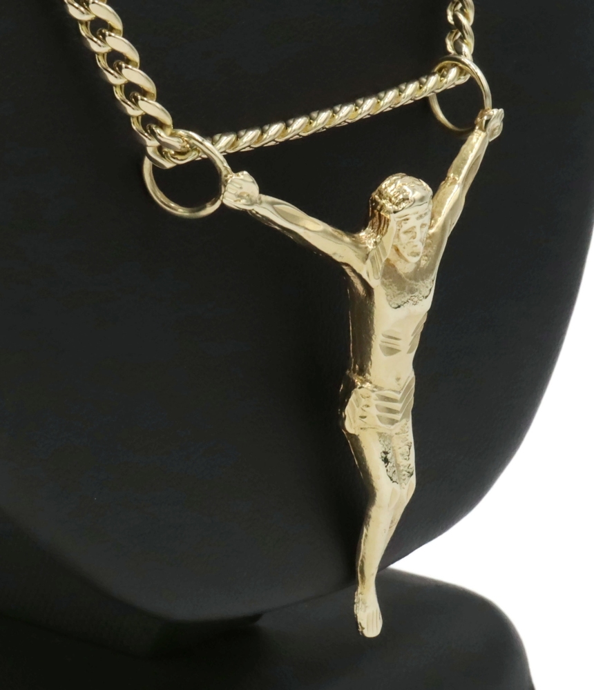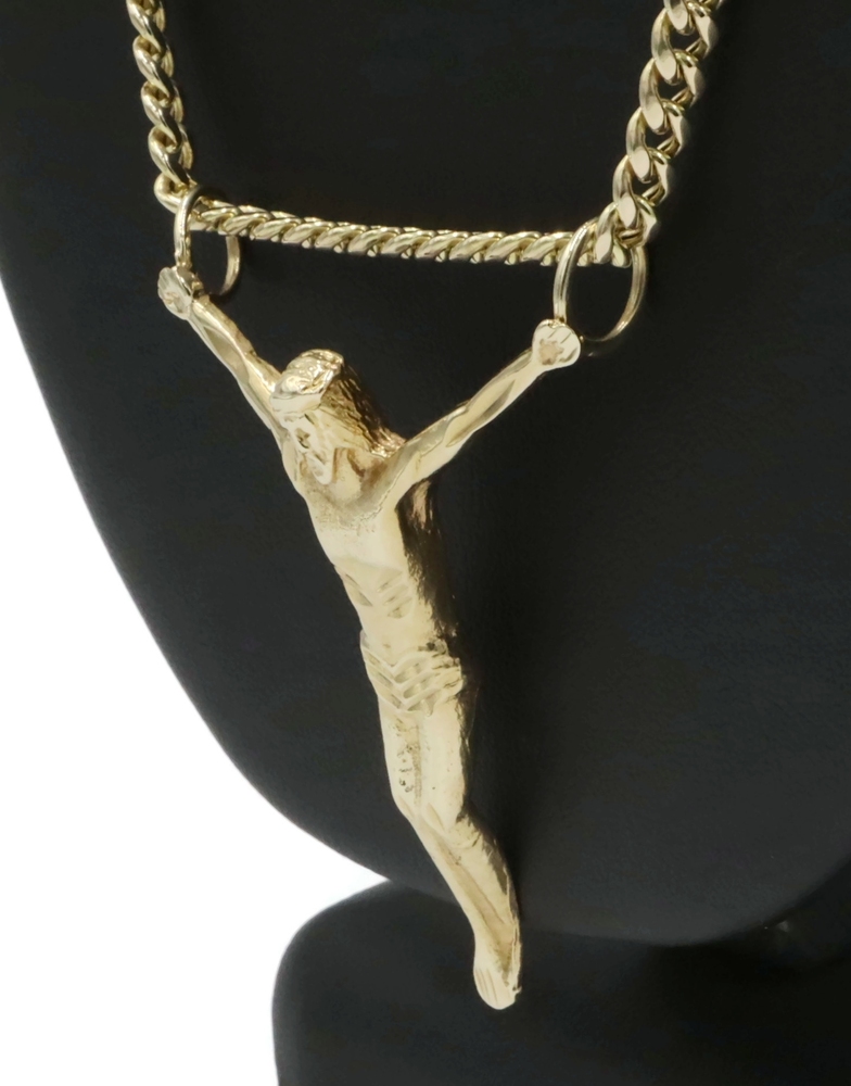 Religious 10KT Yellow Gold 2" Jesus Corpus Pendant on 10KT Curb Chain 22" 17.57g. This pendant is approximately 57.2mm in length (including the bail/s) and the curb necklace is approximately 22 1/4 inches in length.