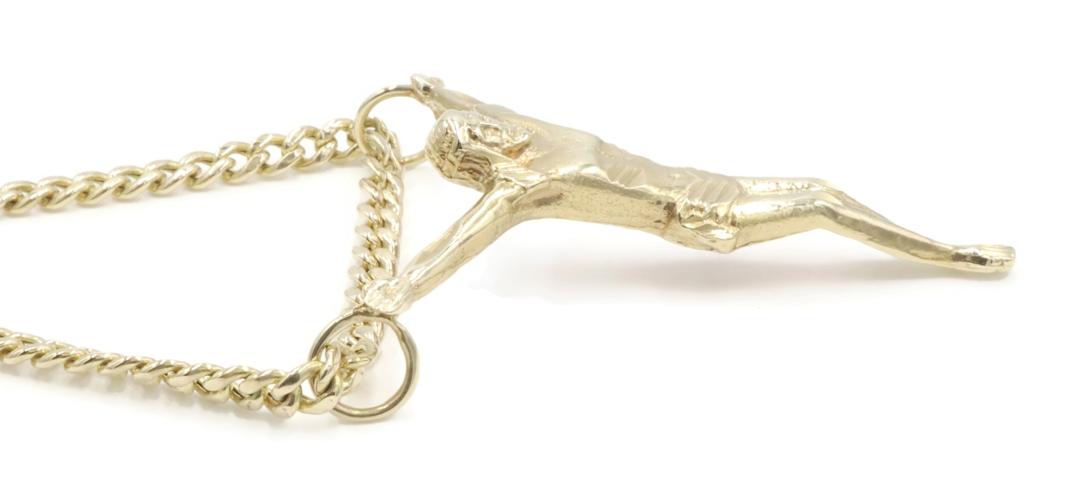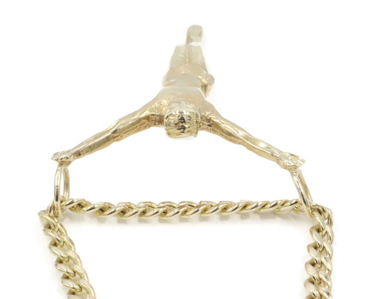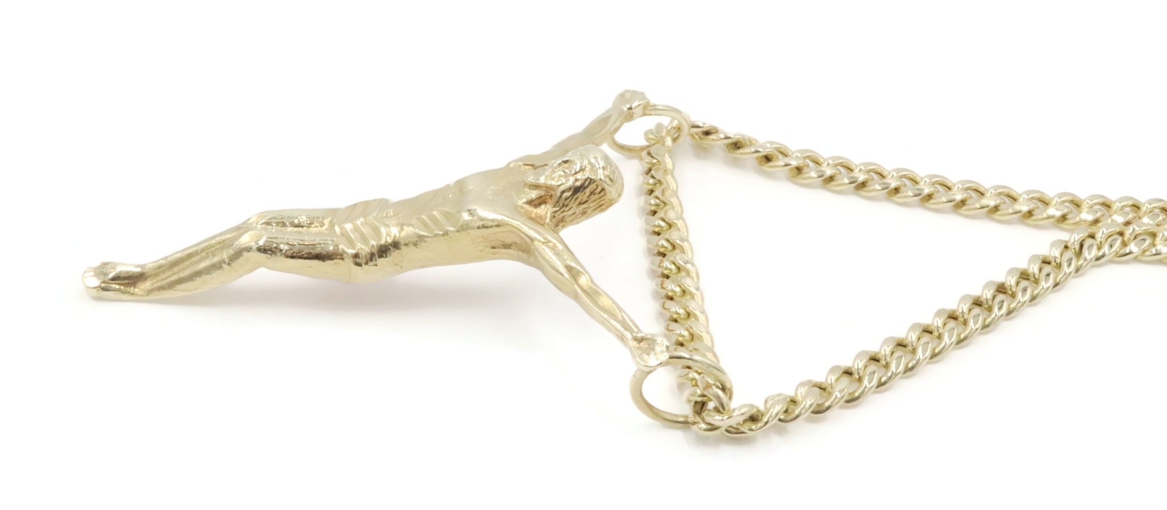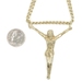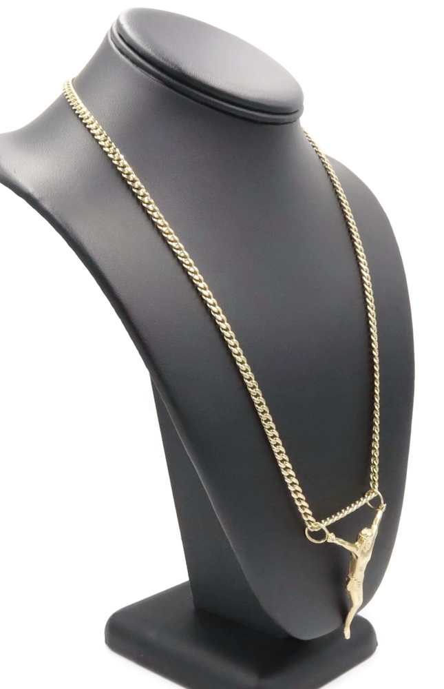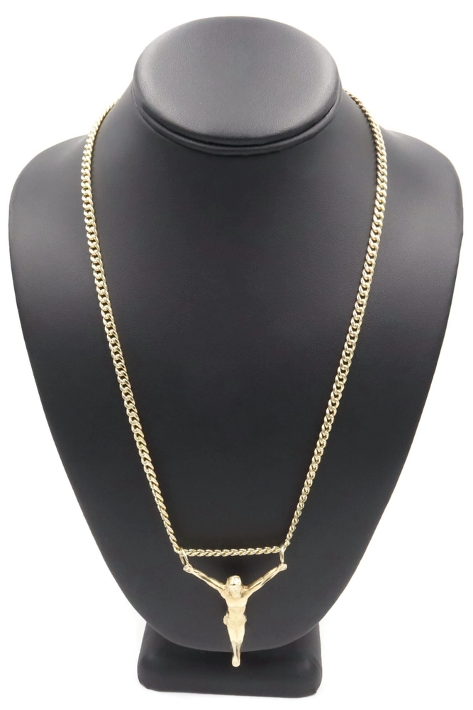 Religious 10KT Yellow Gold 2" Jesus Corpus Pendant on 10KT Curb Chain 22" 17.57g. This pendant is approximately 57.2mm in length (including the bail/s) and the curb necklace is approximately 22 1/4 inches in length.