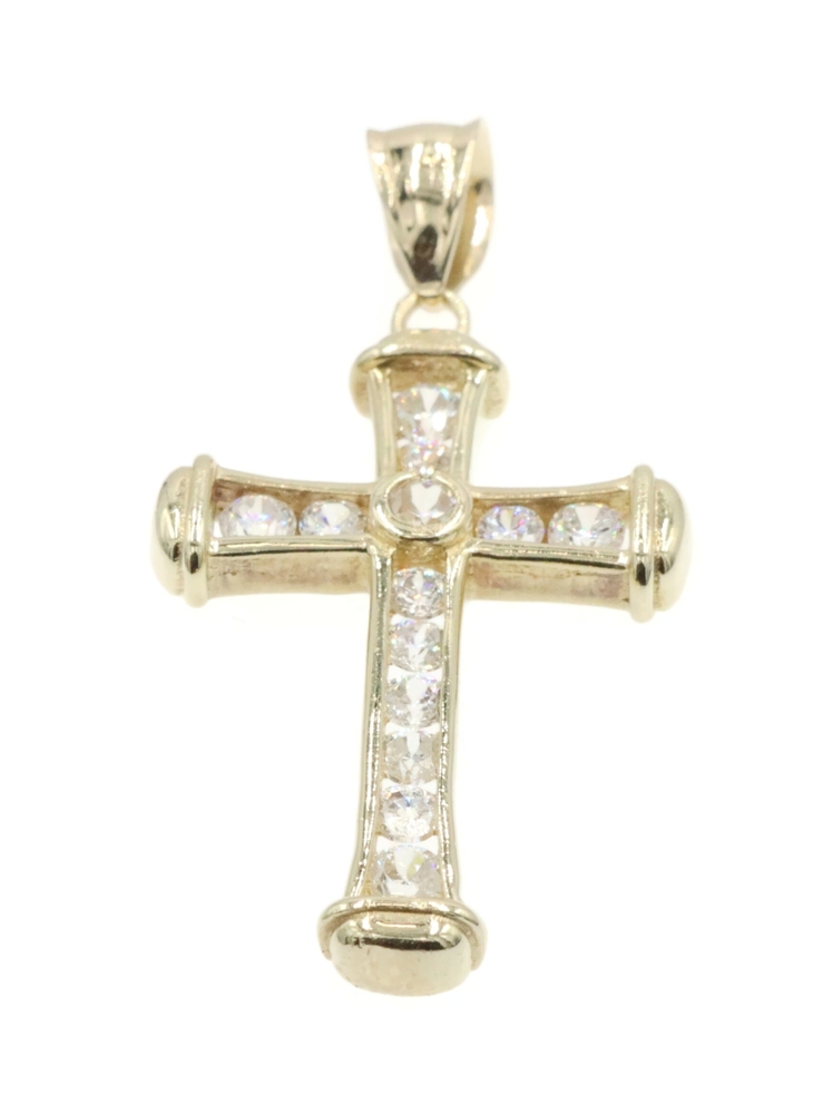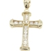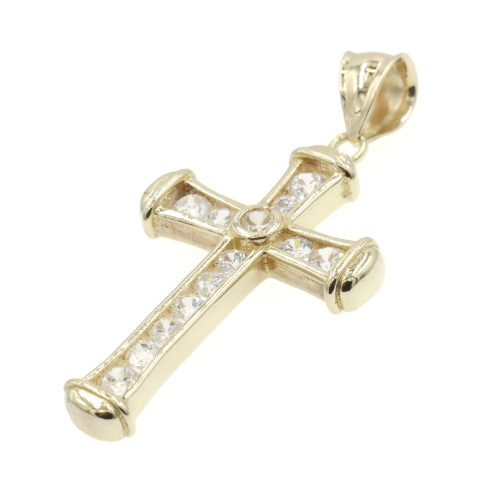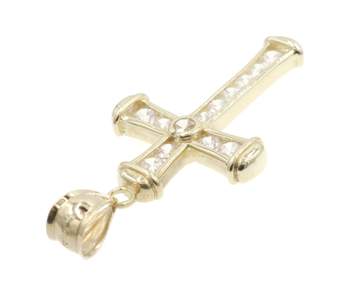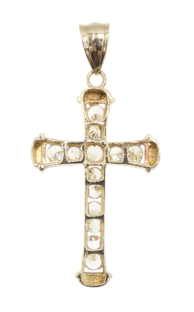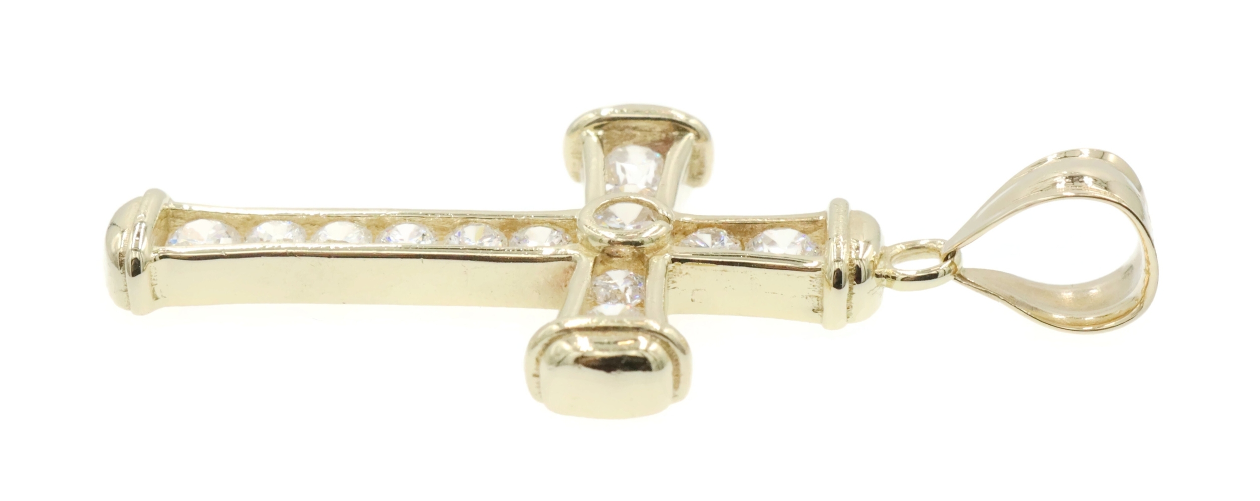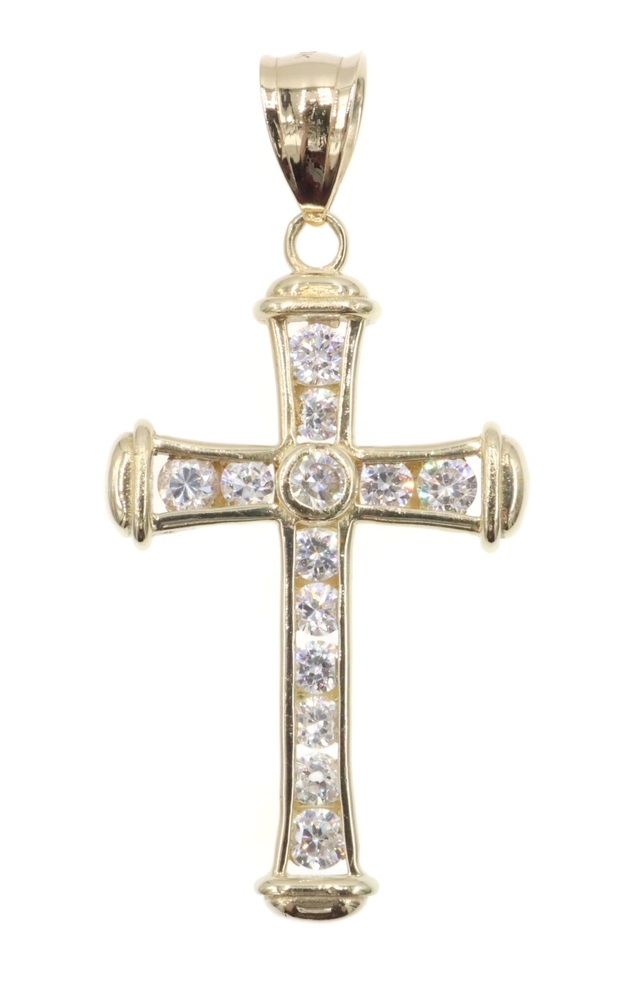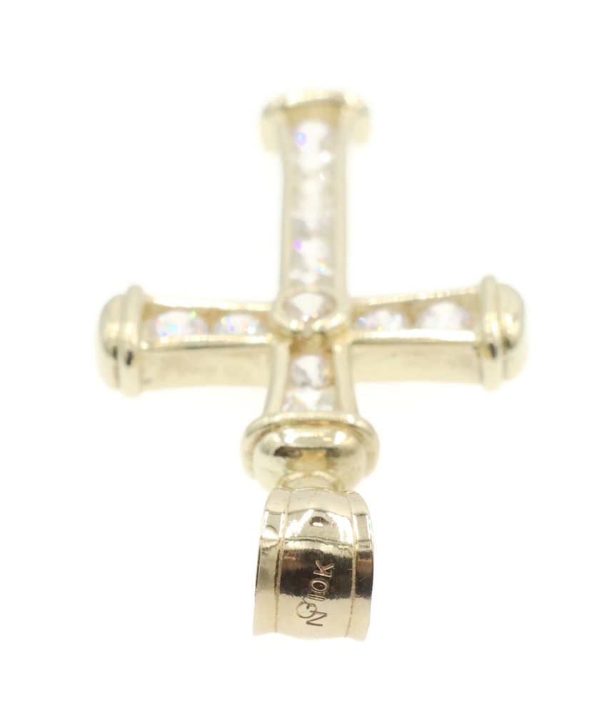Religious 10KT Yellow Gold Channel-Set Round CZ Cross Pendant 1.7" NG - 3.67g. This pendant is approximately 43.5mm in length (including the bail) and 21.3mm in width.