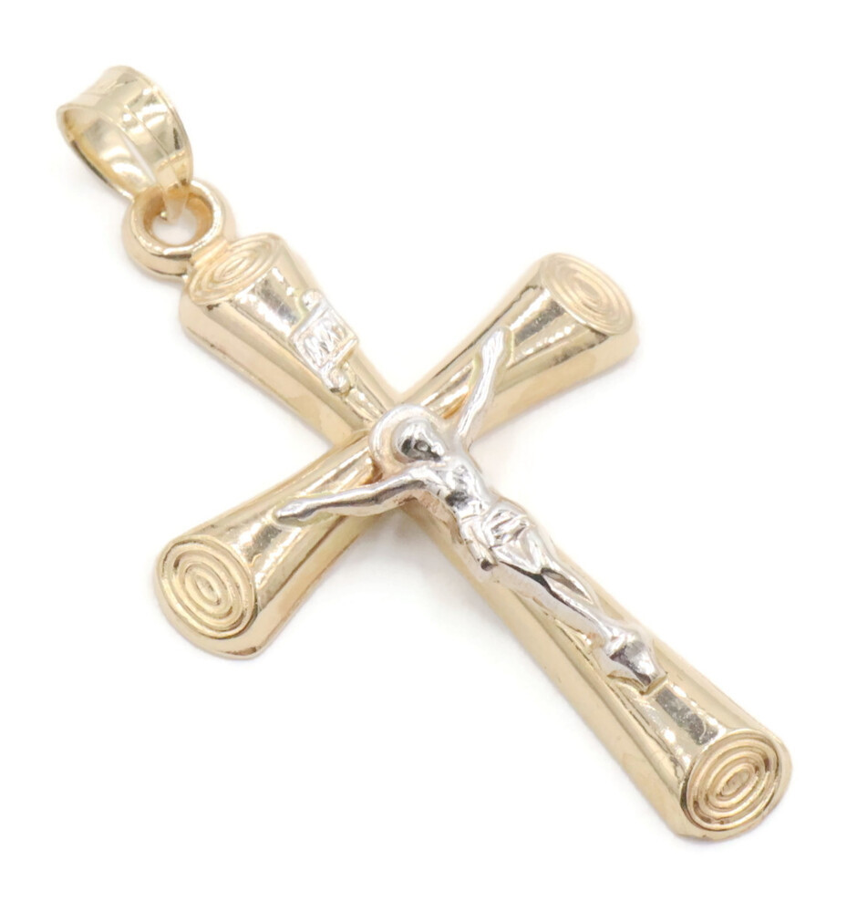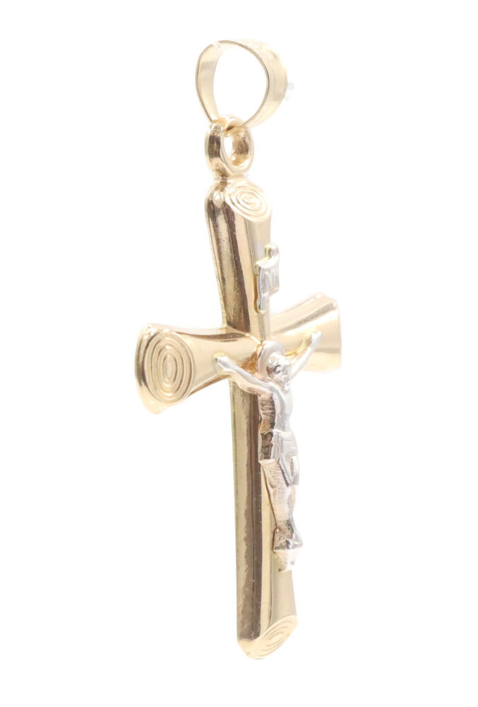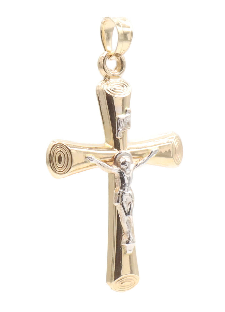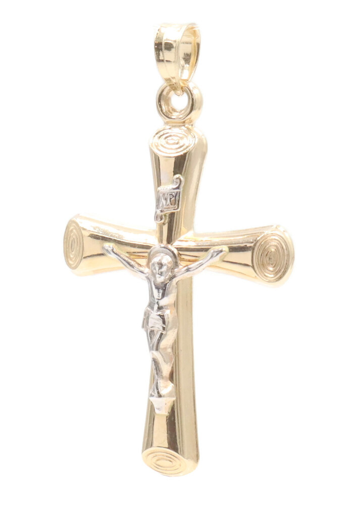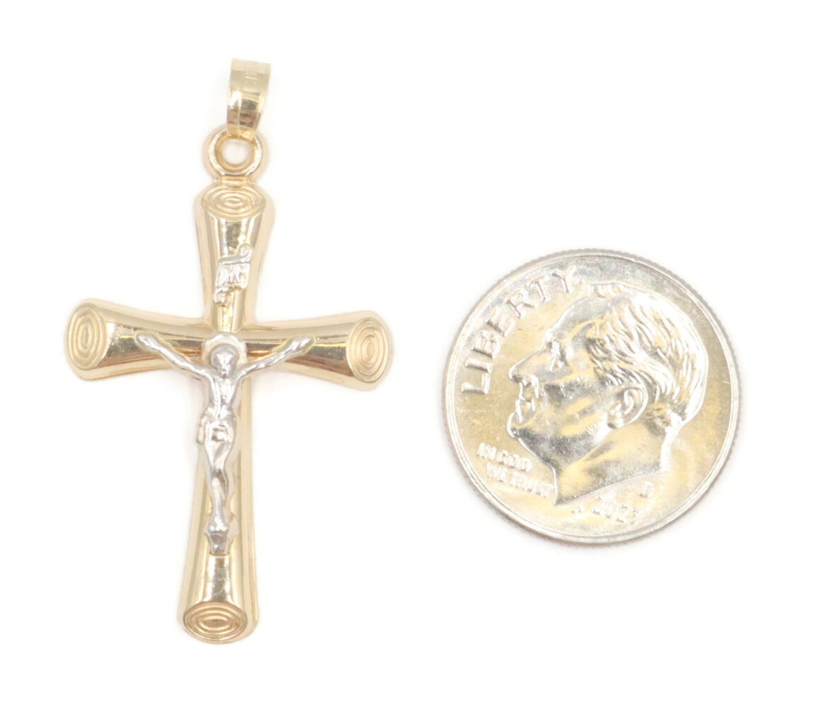 Religious 14KT Two-Tone Gold Inri Crucifix Cross Circle Motif Pendant 1.3" 1.15g. This pendant is approximately 35.2mm in length (including the bail) and 19.6mm in width.