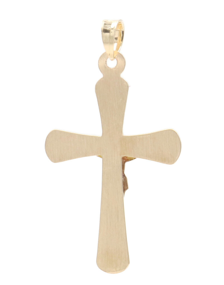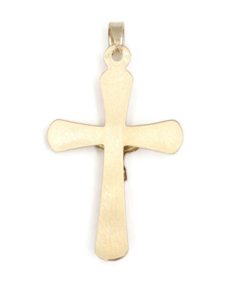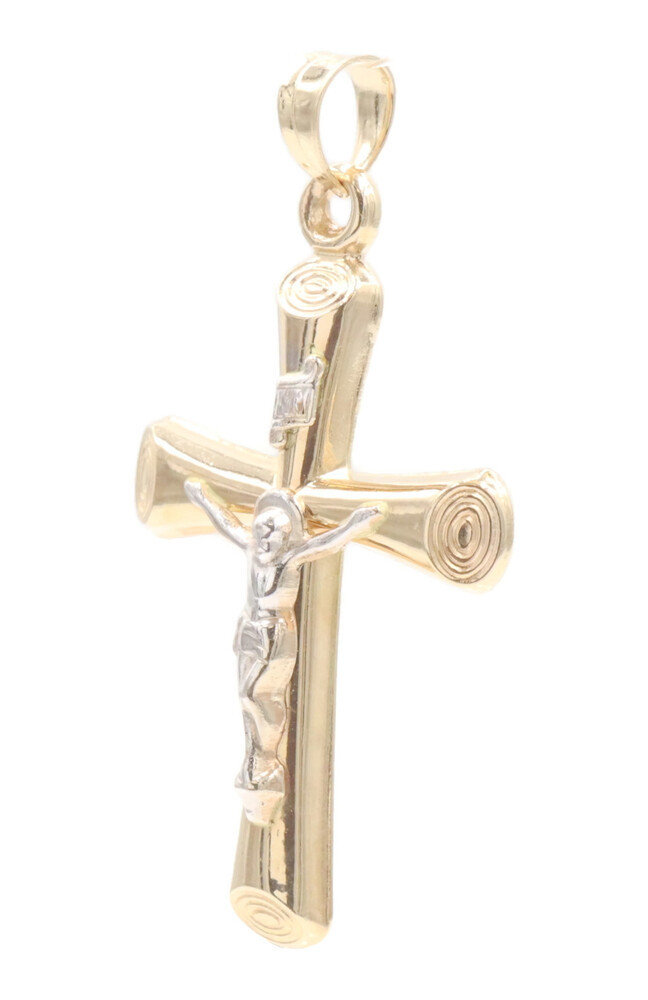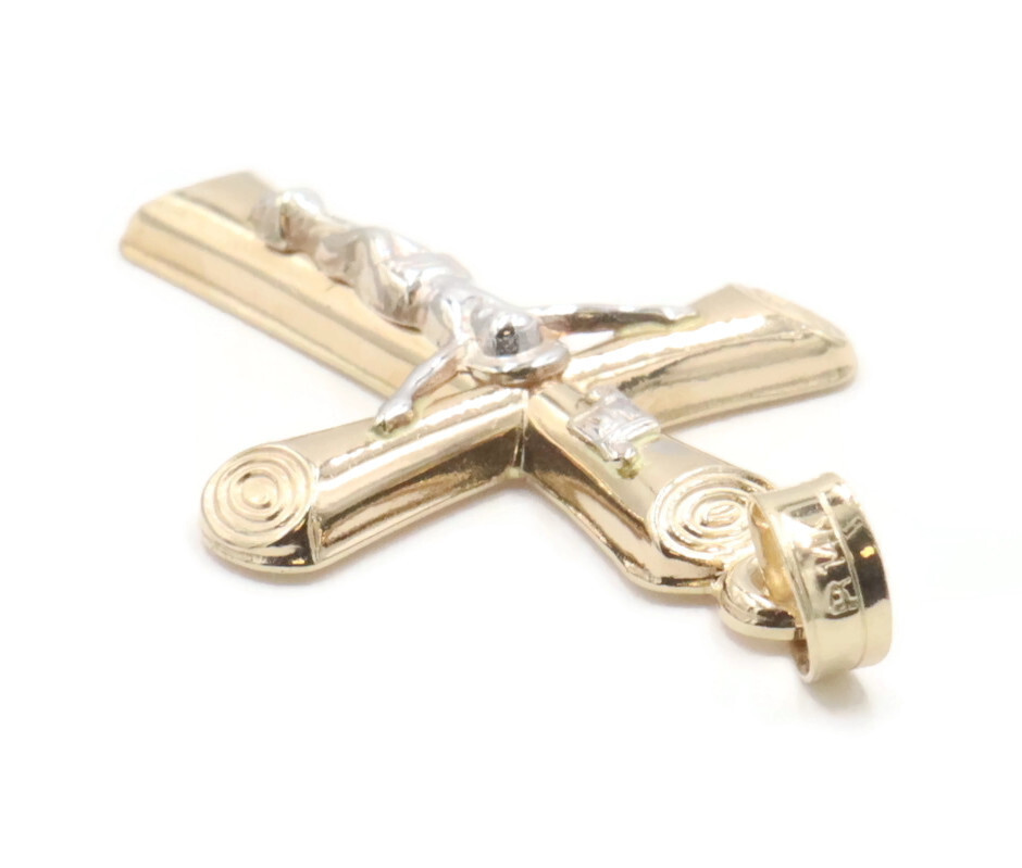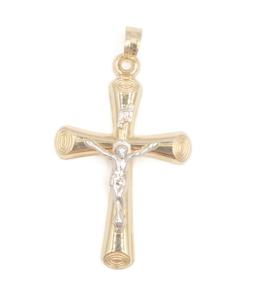 Religious 14KT Two-Tone Gold Inri Crucifix Cross Circle Motif Pendant 1.3" 1.15g. This pendant is approximately 35.2mm in length (including the bail) and 19.6mm in width.