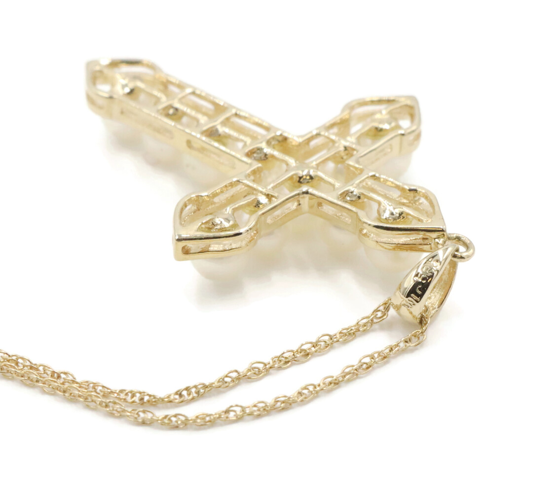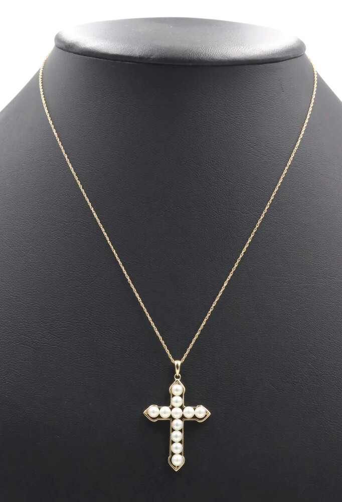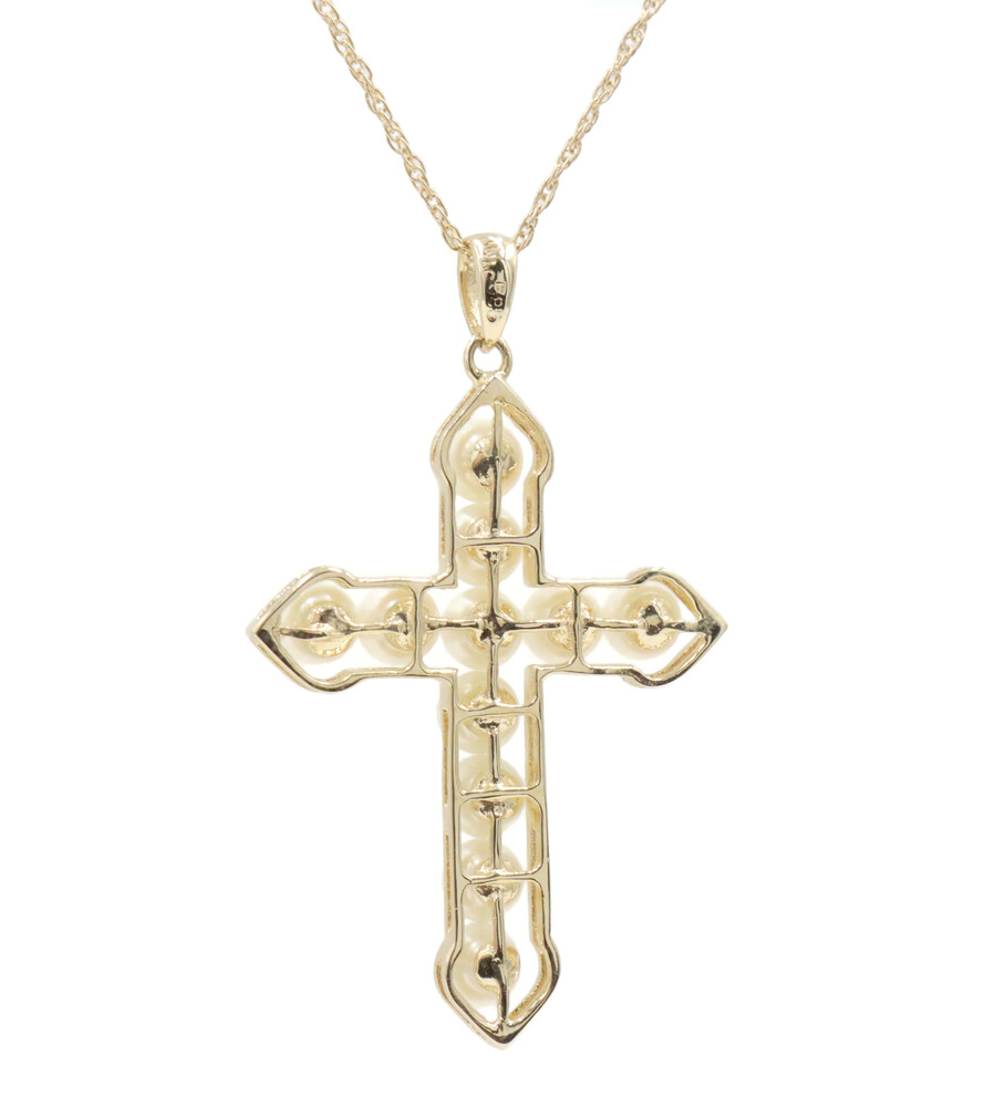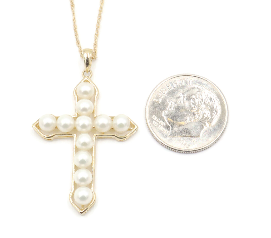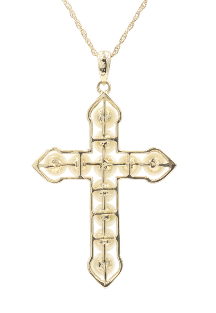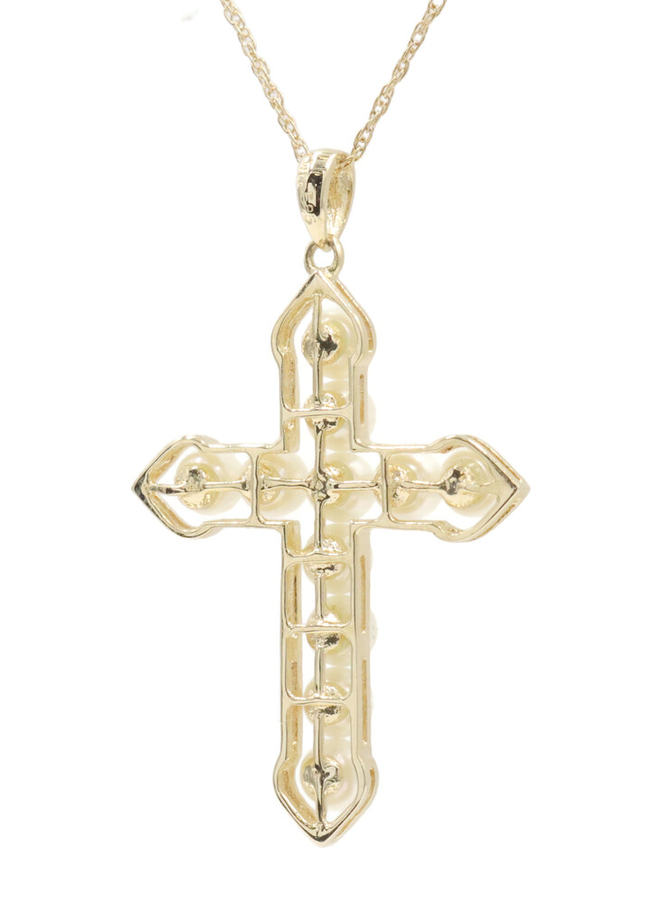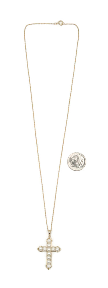 Religious 14KT Yellow Gold Cultured Pearl 1.4" Cross Pendant on 14KT Chain 18". This pendant is approximately 37mm in length (including the bail) and the rope necklace is approximately 18 1/4 inches in length.