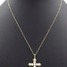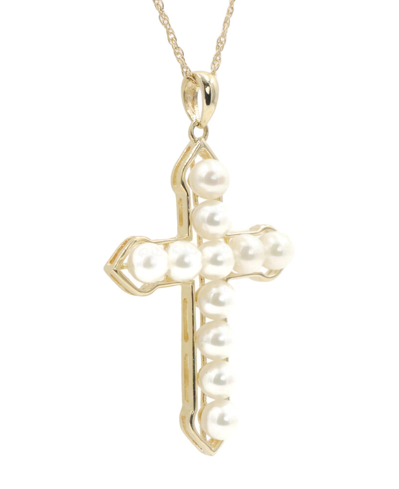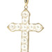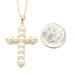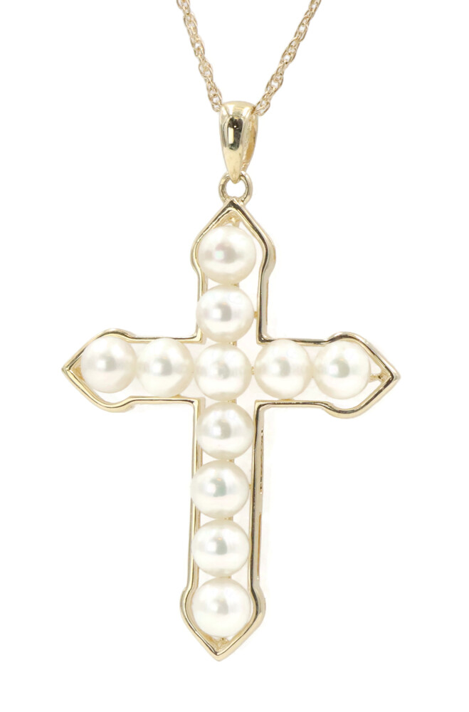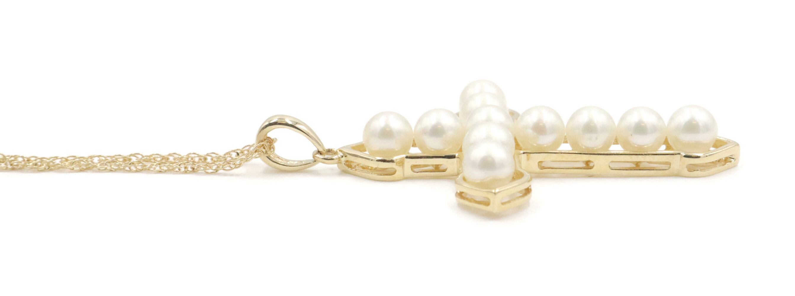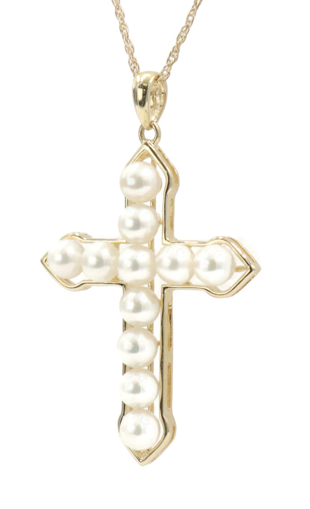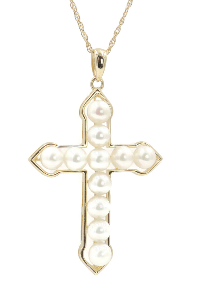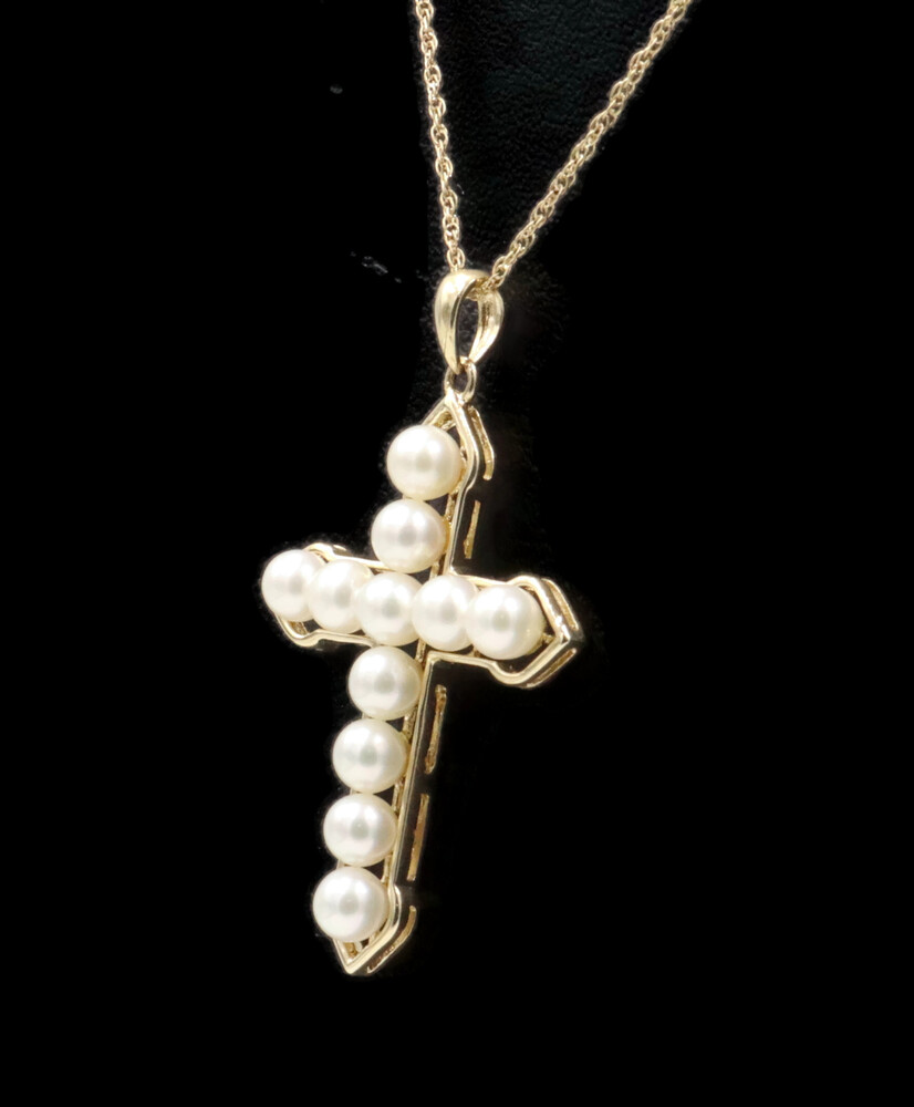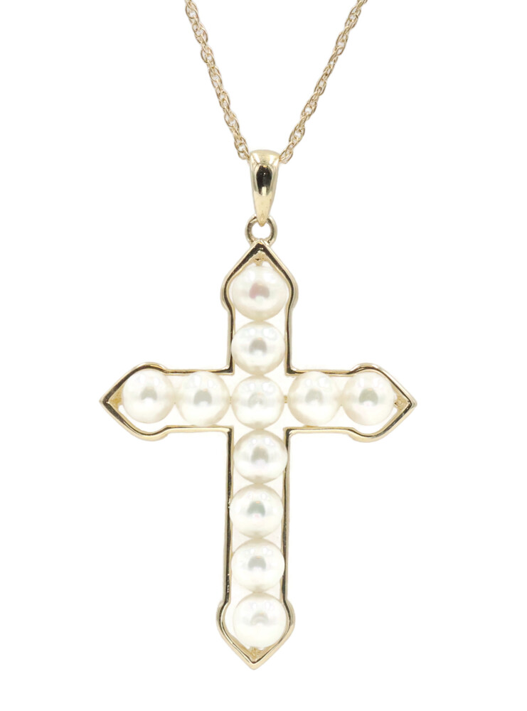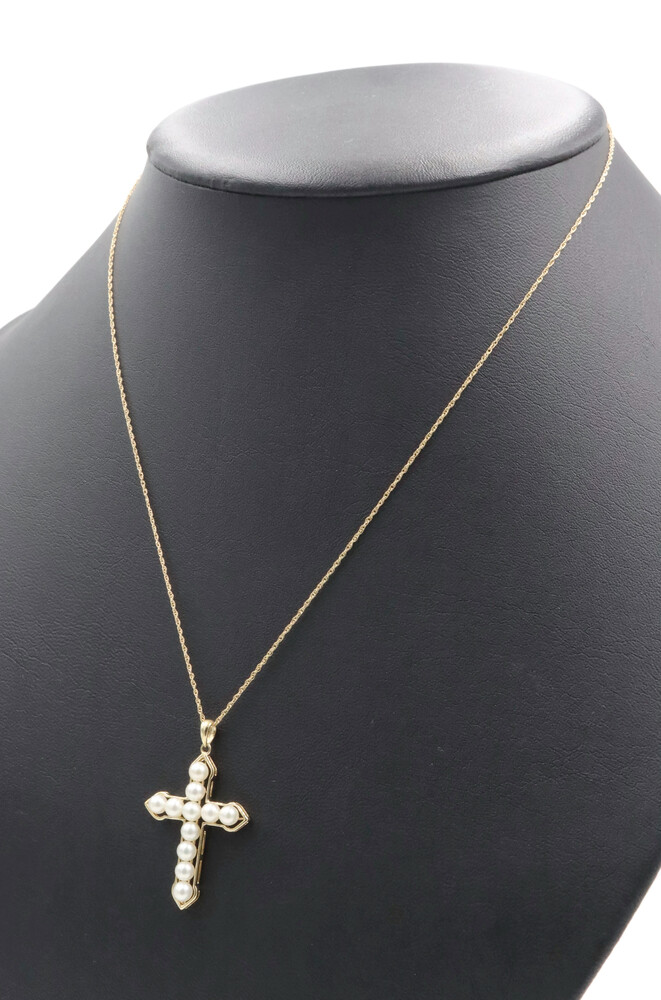Religious 14KT Yellow Gold Cultured Pearl 1.4" Cross Pendant on 14KT Chain 18". This pendant is approximately 37mm in length (including the bail) and the rope necklace is approximately 18 1/4 inches in length.
