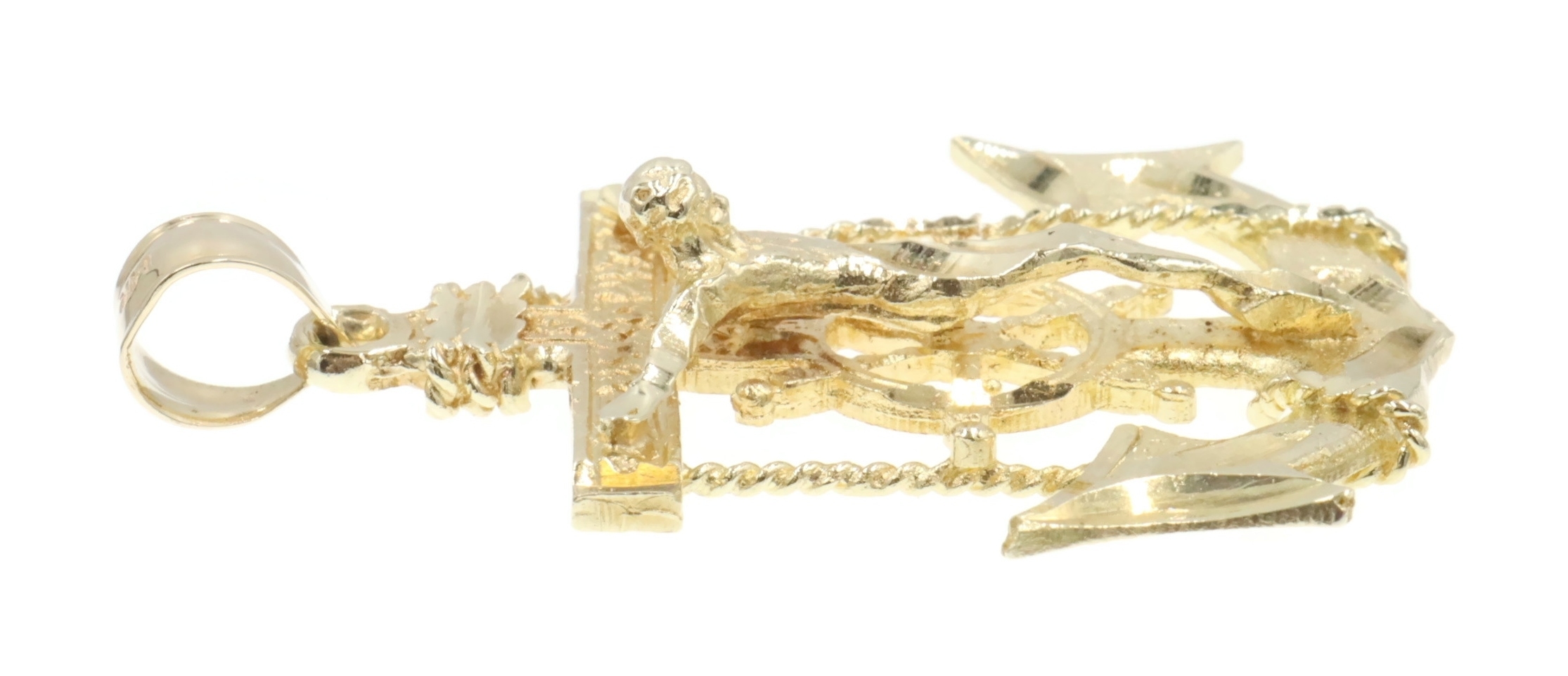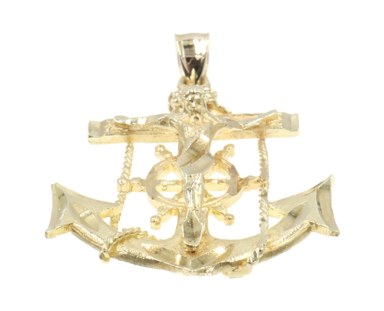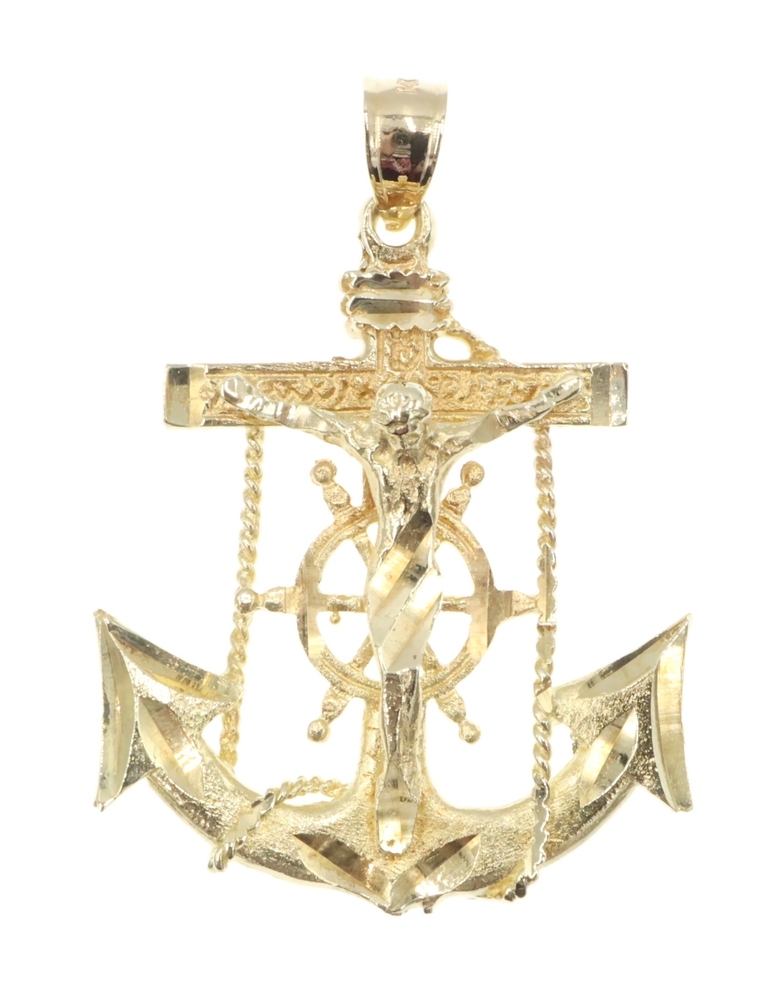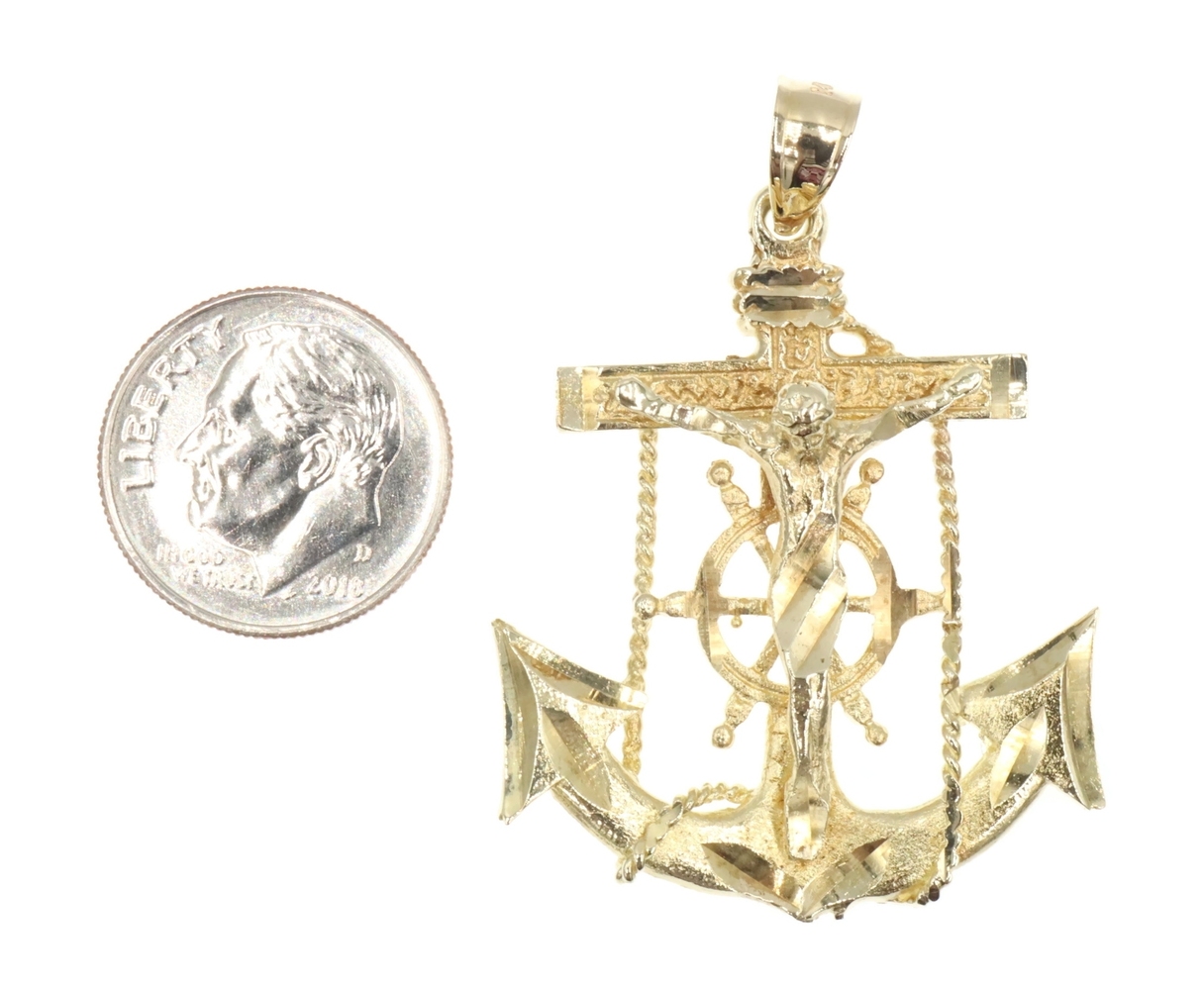 Religious Diamond-Cut 10KT Yellow Gold Anchor Crucifix Cross Pendant 1.6" - 6.1g. This pendant is approximately 42.6mm in length (including the bail) and 30.5mm in width. This pendant is made with 10KT yellow gold while the bail is made with 14KT yellow gold.