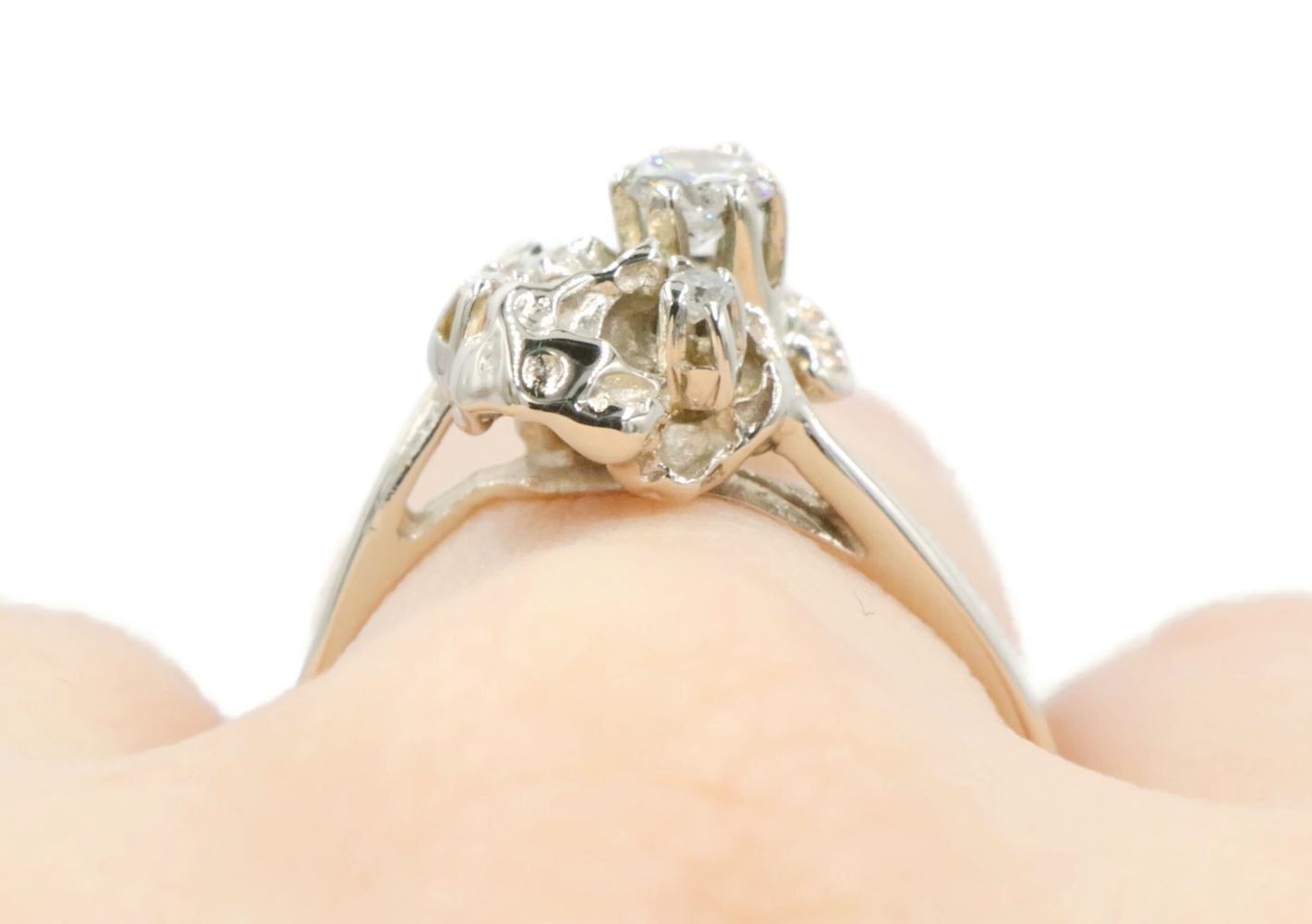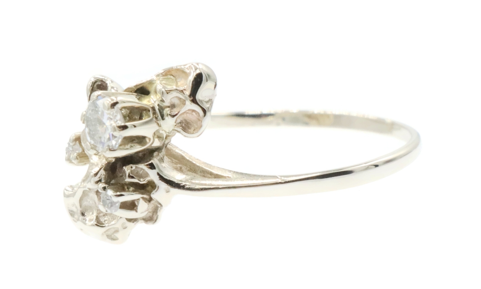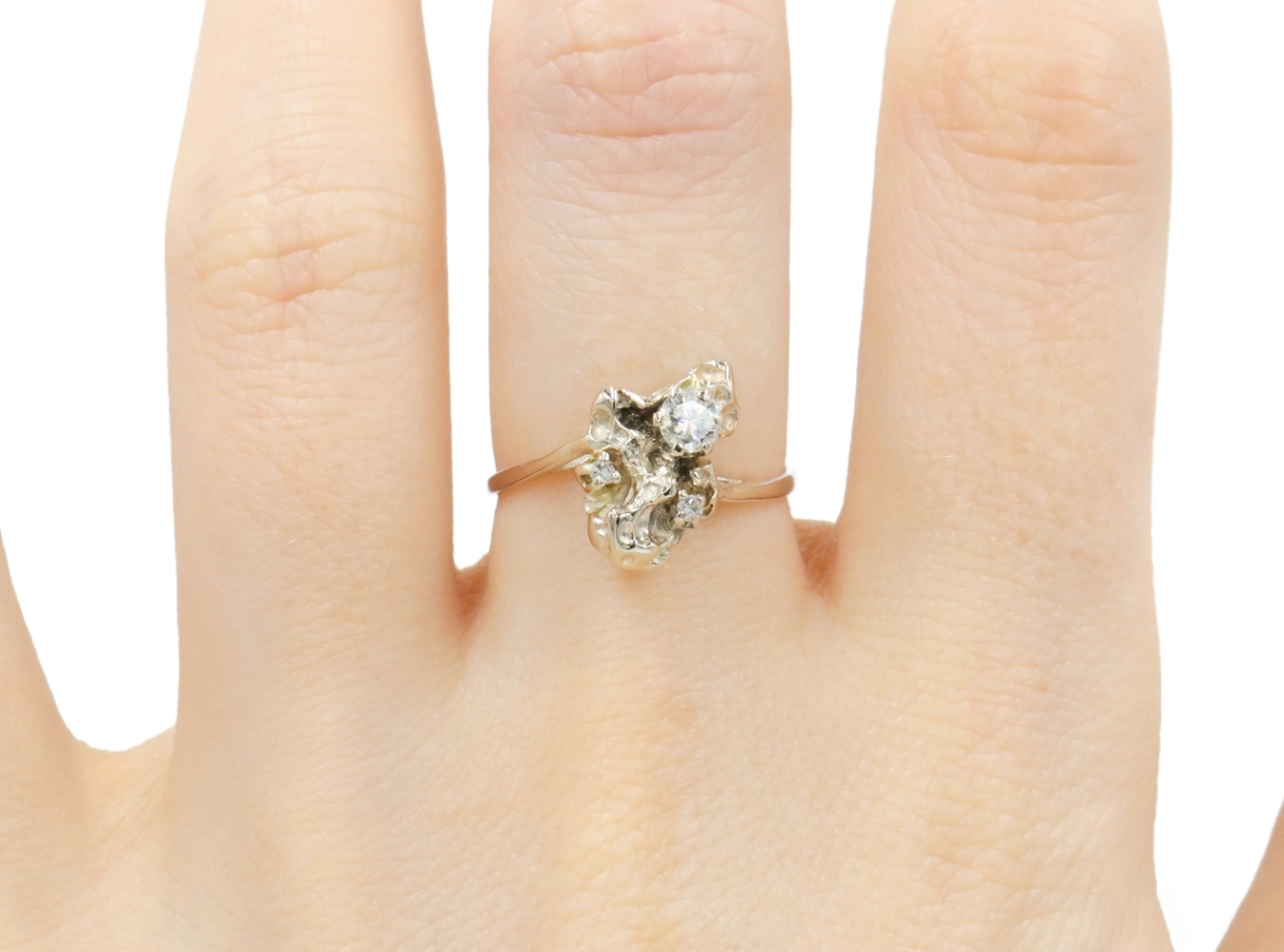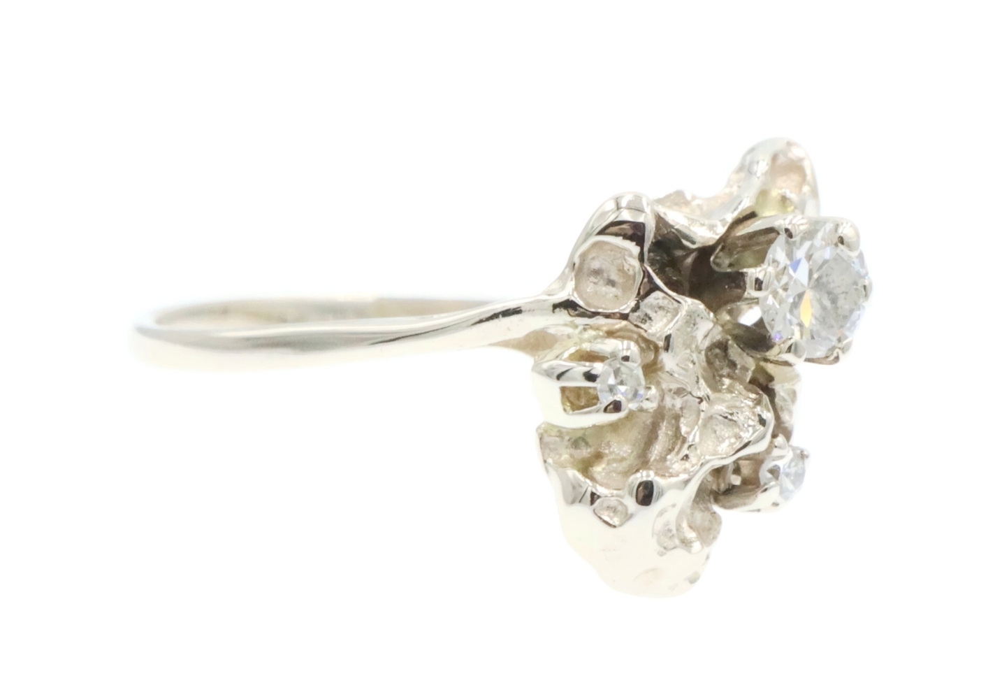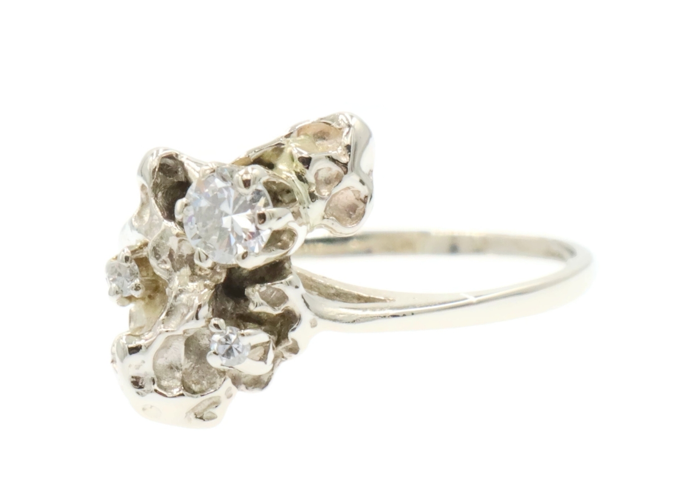 Retro Style 14KT White Gold 3-Stone 0.20 Ctw Round Diamond Nugget Ring 2.22g. This ring is a size 5 3/4.