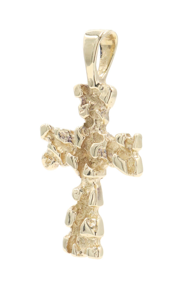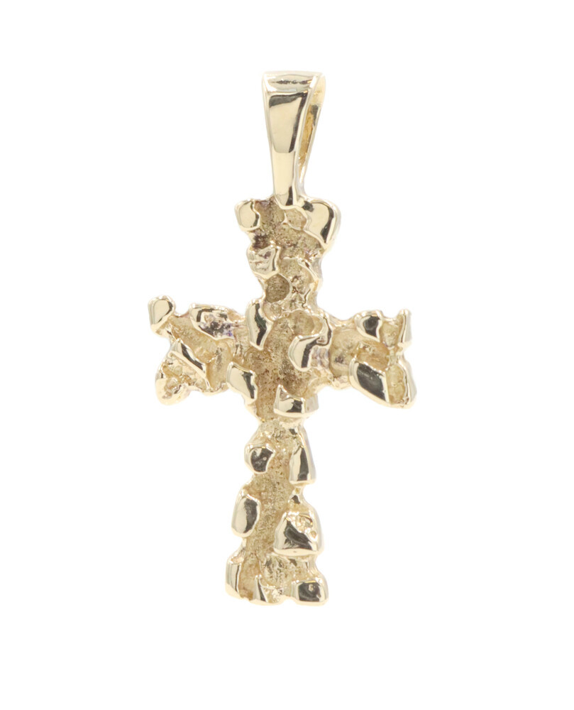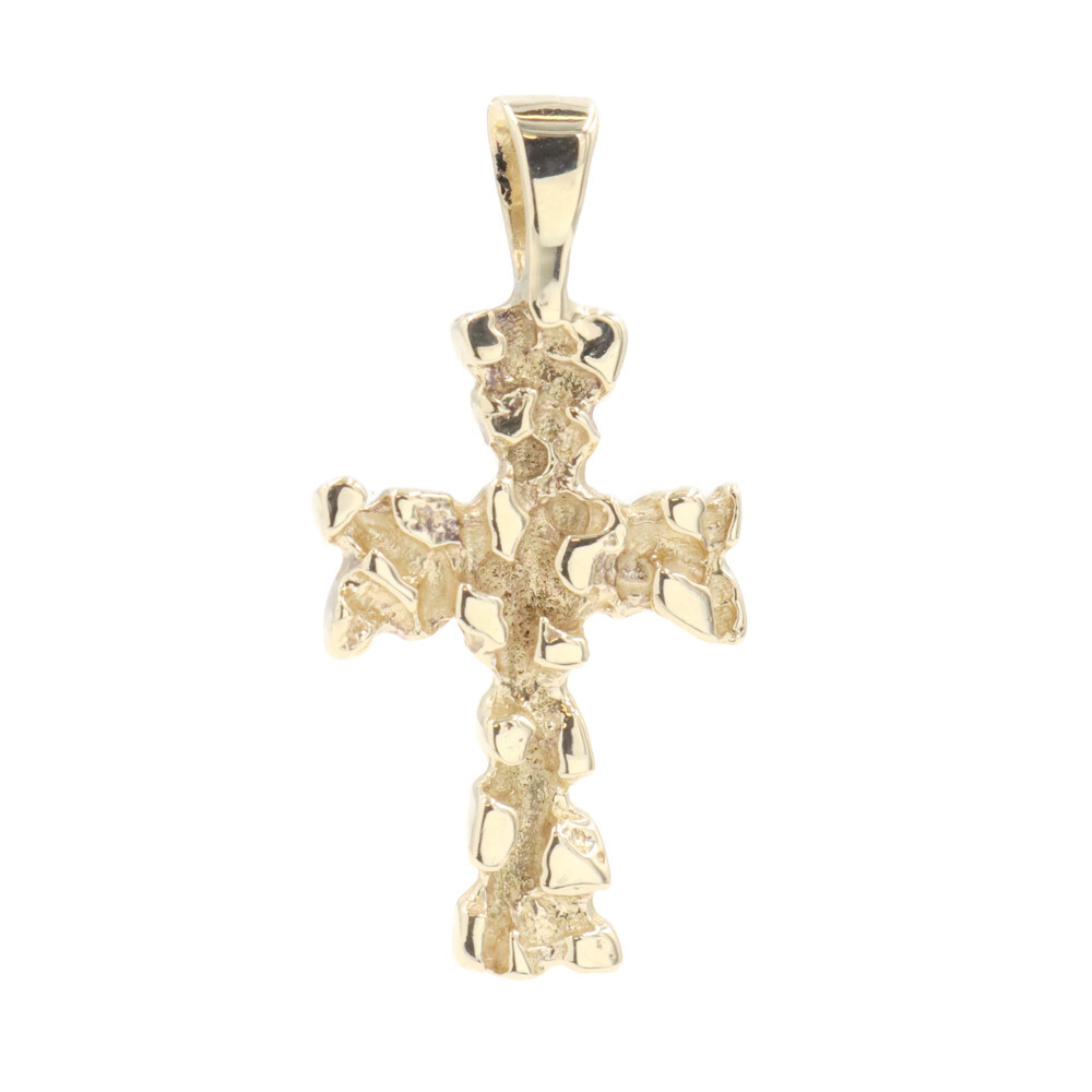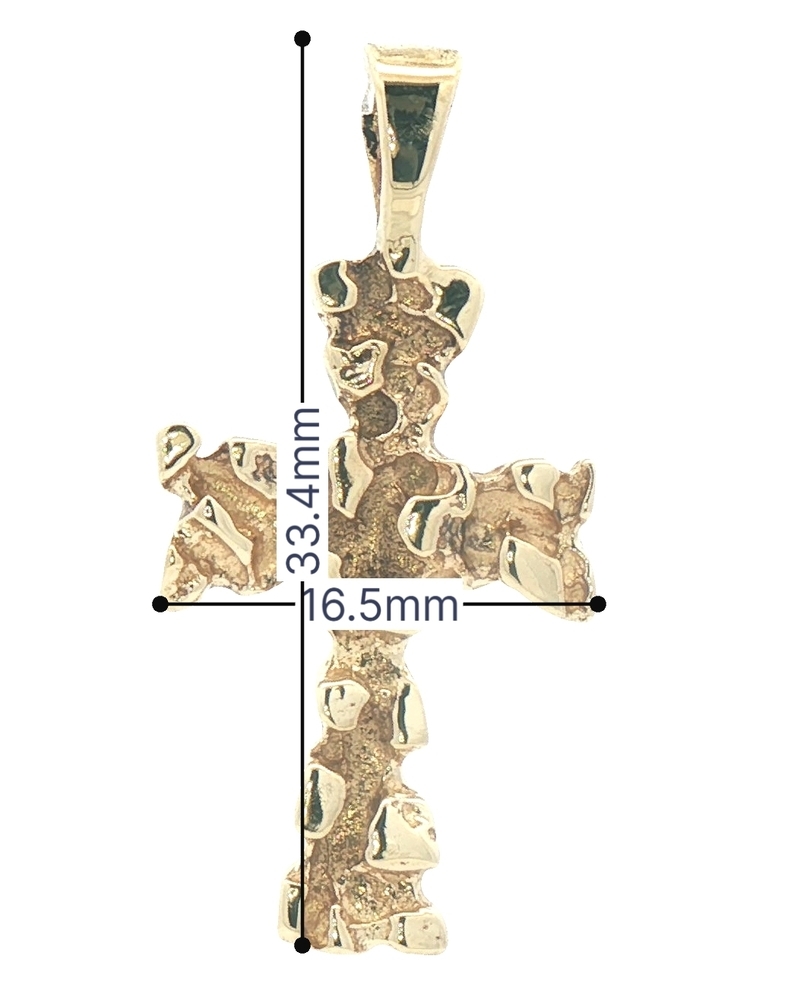 Retro-Style 14KT Yellow Gold 1.3" Religious Nugget Cross Necklace Pendant 3.23g. This pendant is approximately 33.4mm in length (including the bail) and approximately 16.5mm in width.