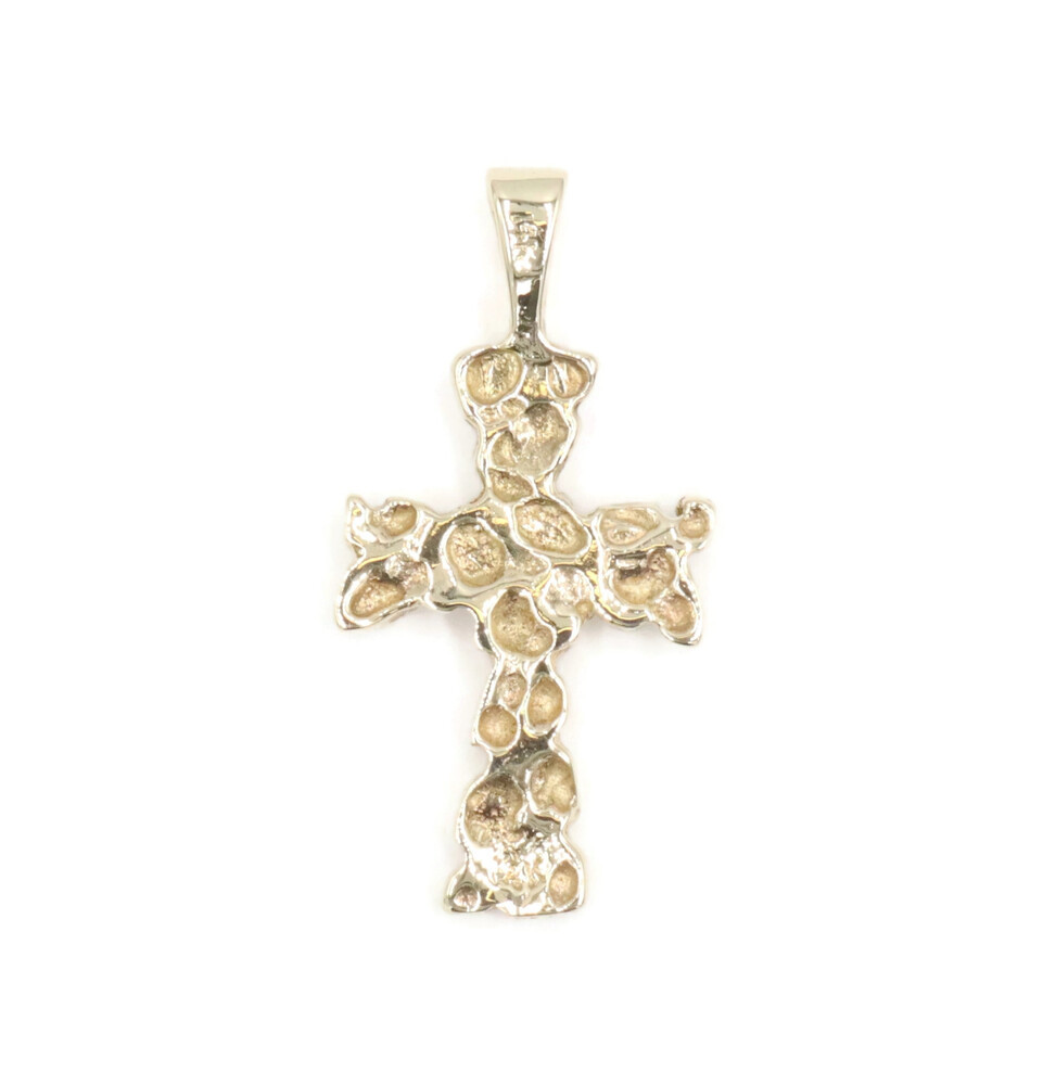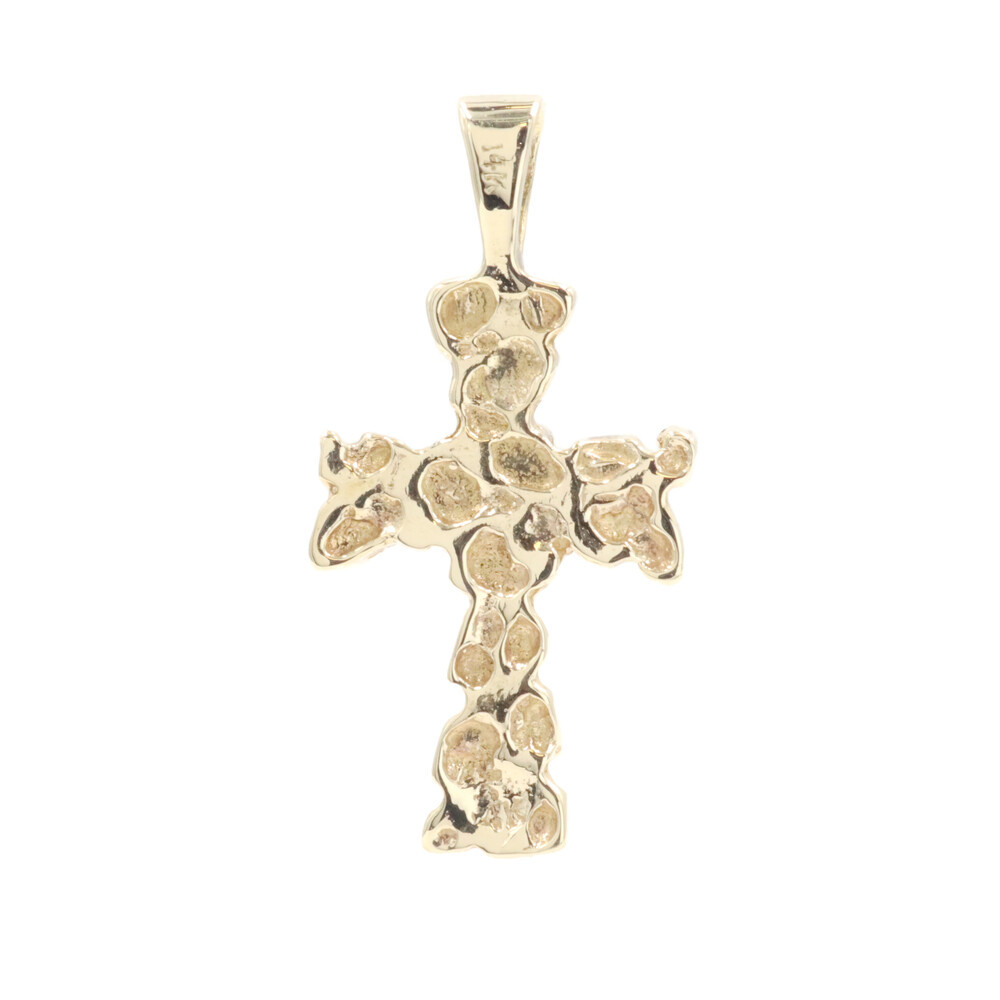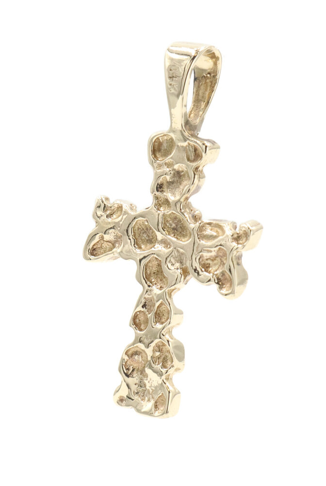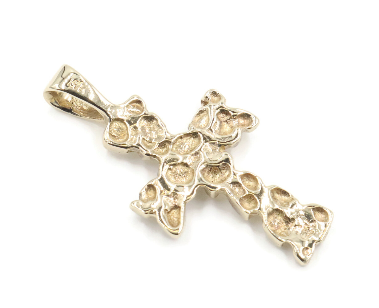 Retro-Style 14KT Yellow Gold 1.3" Religious Nugget Cross Necklace Pendant 3.23g. This pendant is approximately 33.4mm in length (including the bail) and approximately 16.5mm in width.