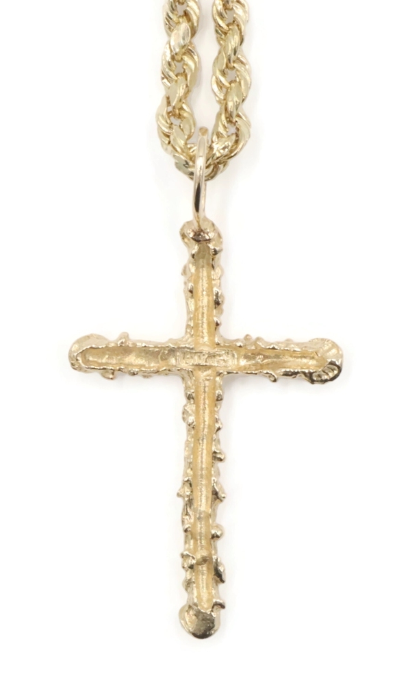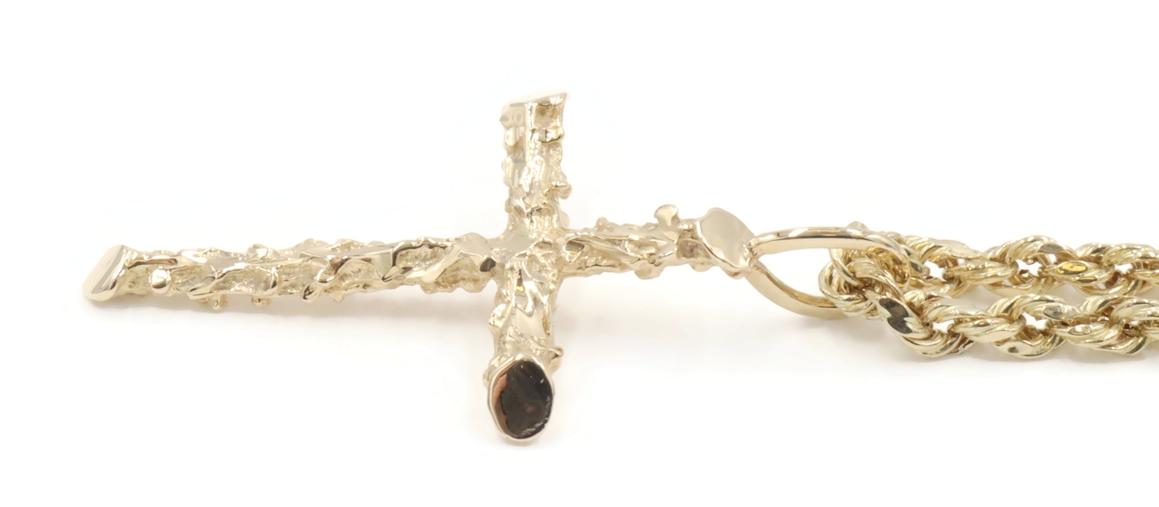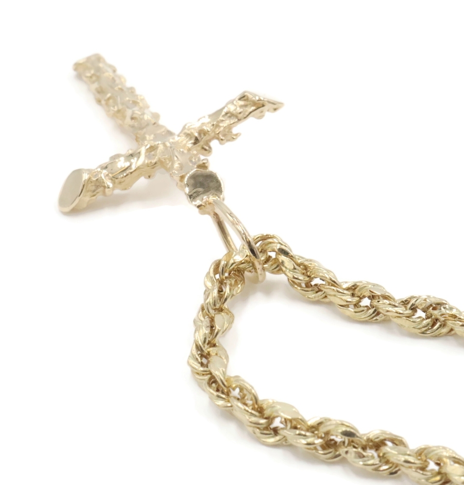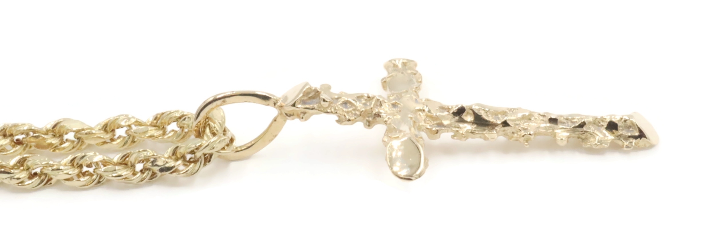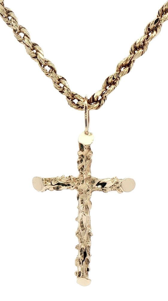 Retro-Style 14KT Yellow Gold Nugget Cross Pendant on 10KT Rope Chain 24.5" BBB. This cross pendant is approximately 40.5mm in length (including the bail) and the rope necklace is approximately 24 1/2 inches in length. The pendant is made with 14KT yellow gold and the rope necklace is made with 10KT yellow gold.