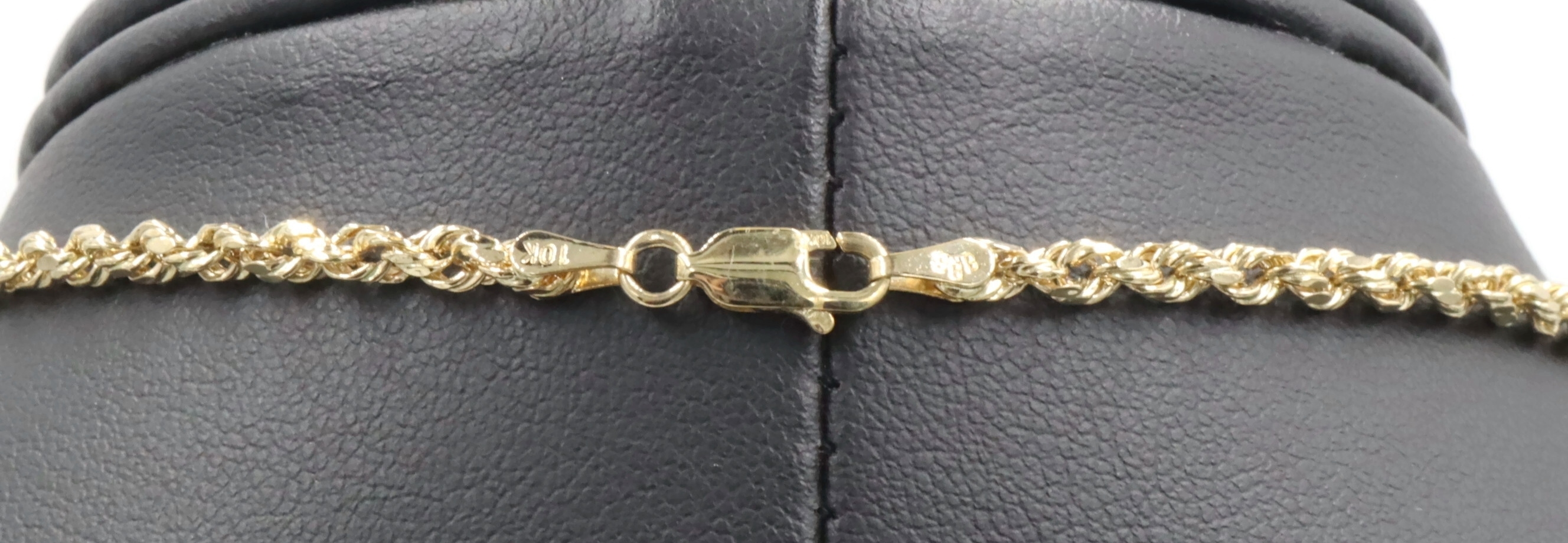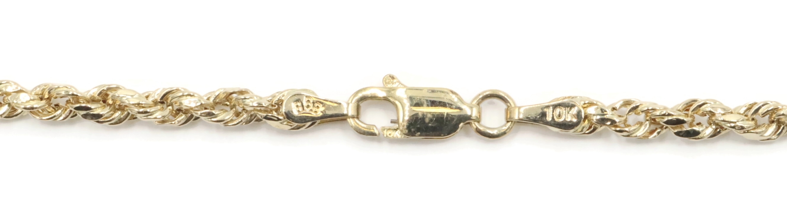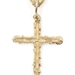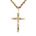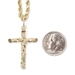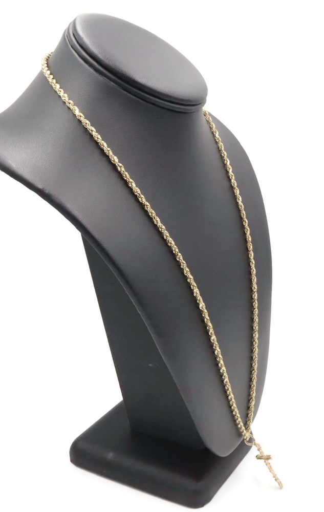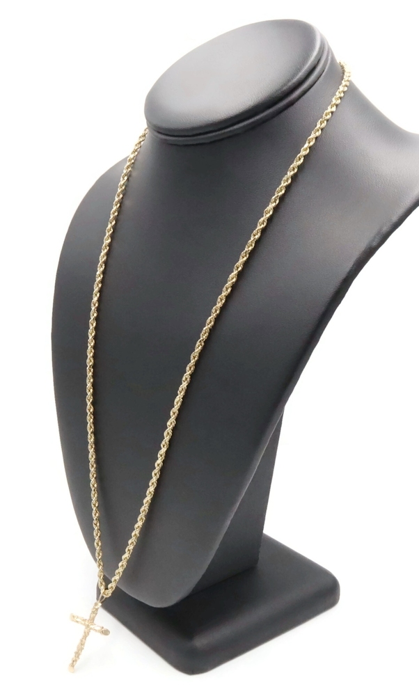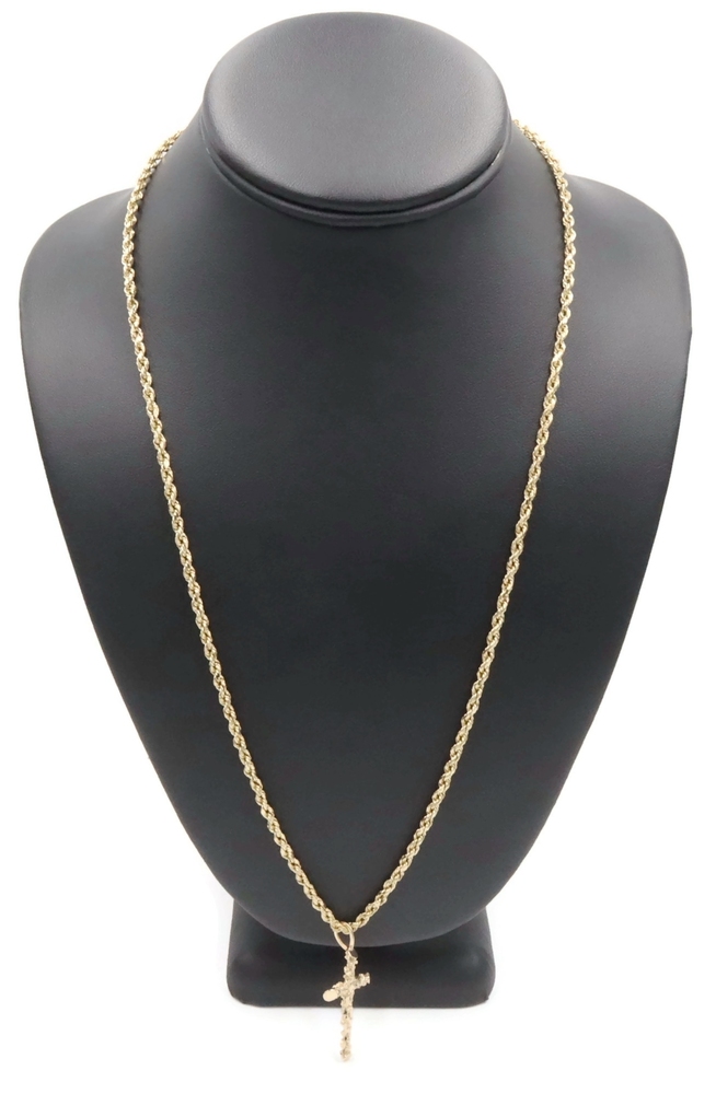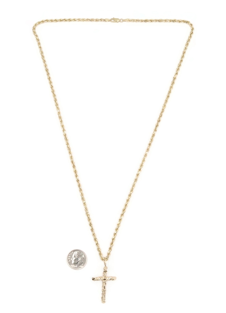 Retro-Style 14KT Yellow Gold Nugget Cross Pendant on 10KT Rope Chain 24.5" BBB. This cross pendant is approximately 40.5mm in length (including the bail) and the rope necklace is approximately 24 1/2 inches in length. The pendant is made with 14KT yellow gold and the rope necklace is made with 10KT yellow gold.