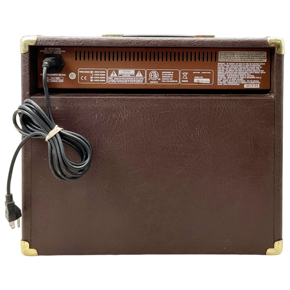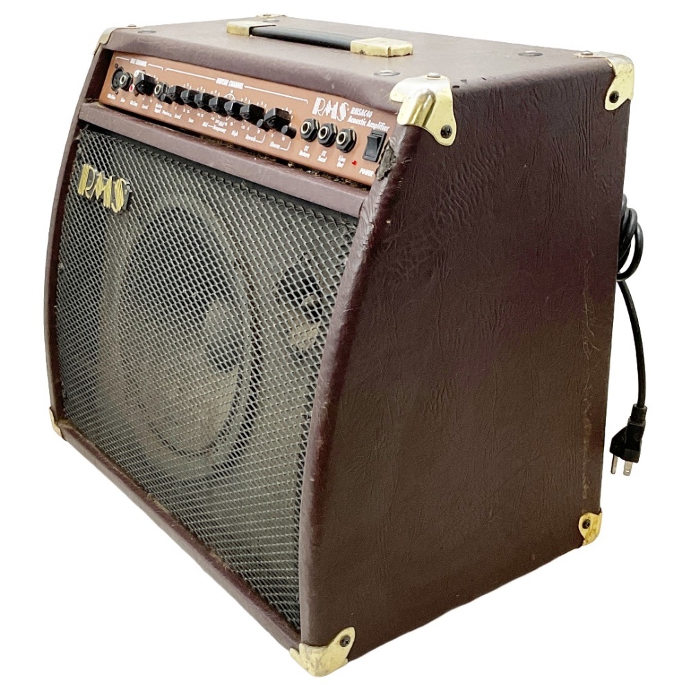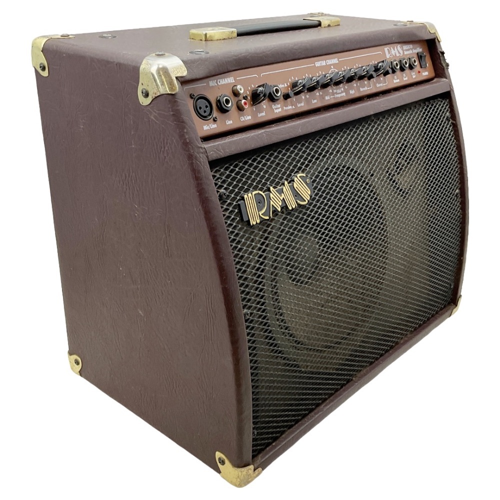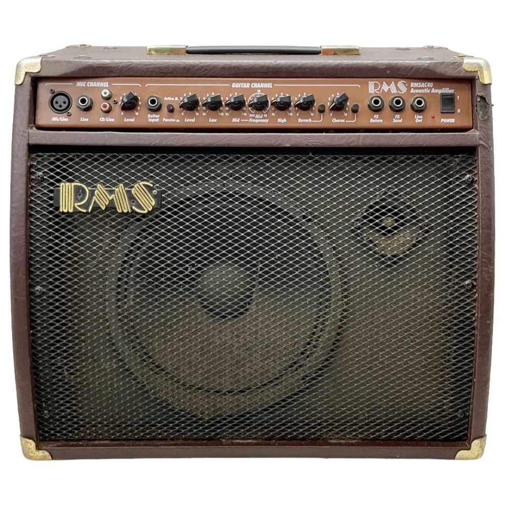 RMS RMSAC40 40w Acoustic Guitar Amp with XLR input, Power: 40 watt RMS. Speaker: 10" (Woofer), 2" (Tweeter). 2 Channels with separate volume control: Channel One: 3 pin mic input, 1/4" line input, CD input, Volume control. Channel Two: 1/4" guitar input, Active/Passive electronics selector, Volume, 3 band EQ w/ mid frequency control, Reverb On/Off and reverb control, Chorus On/Off and chorus control, Effects loop (Send/Return), Line out, Power switch.