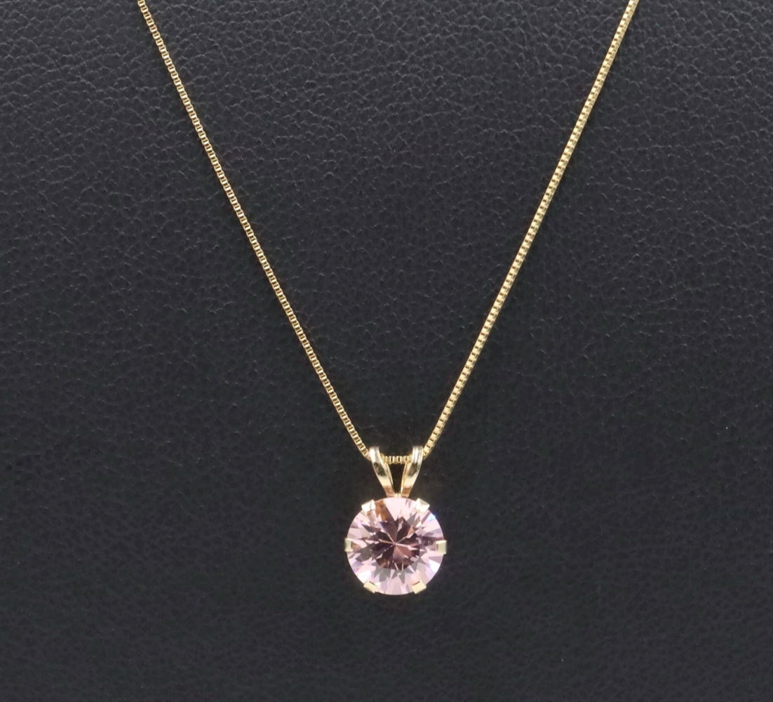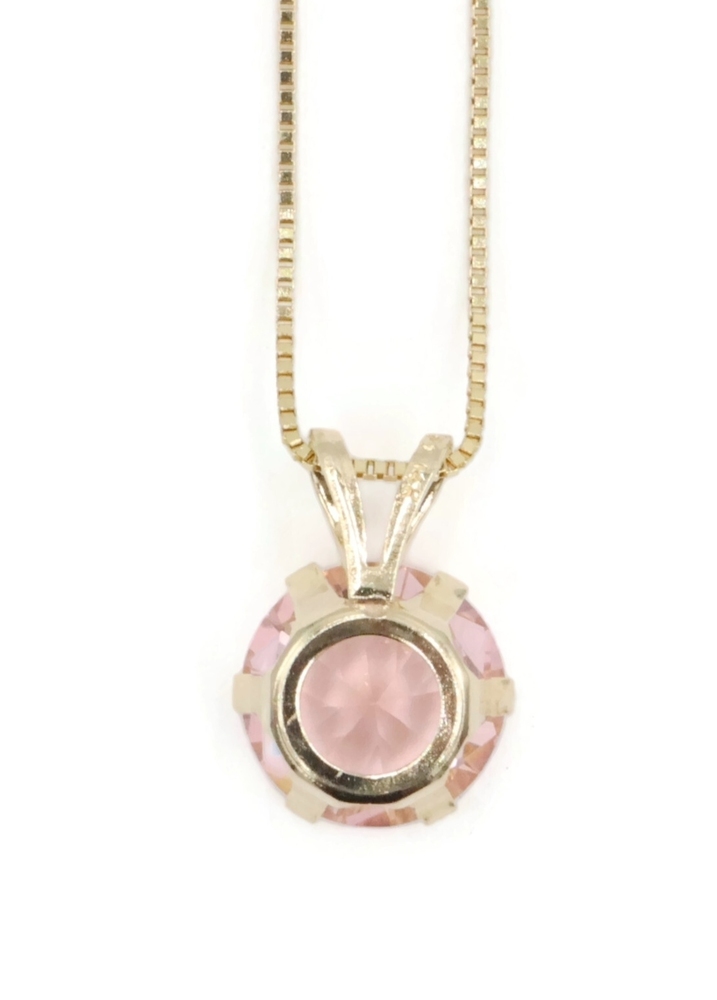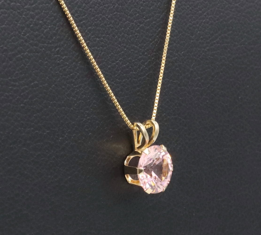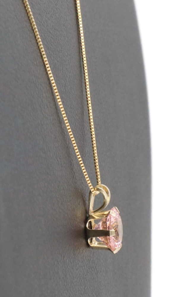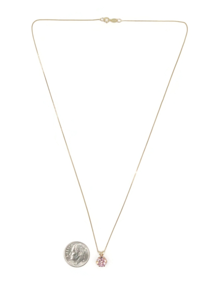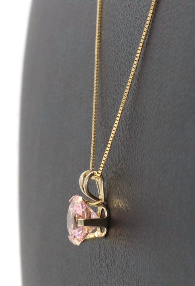 Solitaire 1.40 Ct Pink Synthetic Spinel 14KT Gold Pendant on 14KT Box Chain 18". This pendant is approximately 10.3mm in length (including the bail) and the box chain is approximately 18 inches in length.