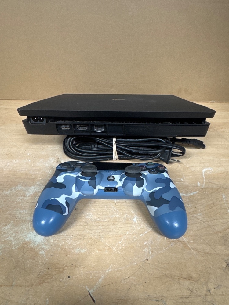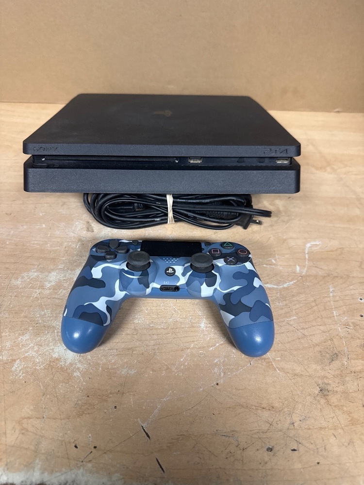SONY CUH-2215B / PS4 GAMING CONSOLE / SLIM / POWER CORD / HDMI CABLE / BLUE CAMO WIRELESS CONTROLLER (NO CHARGER)