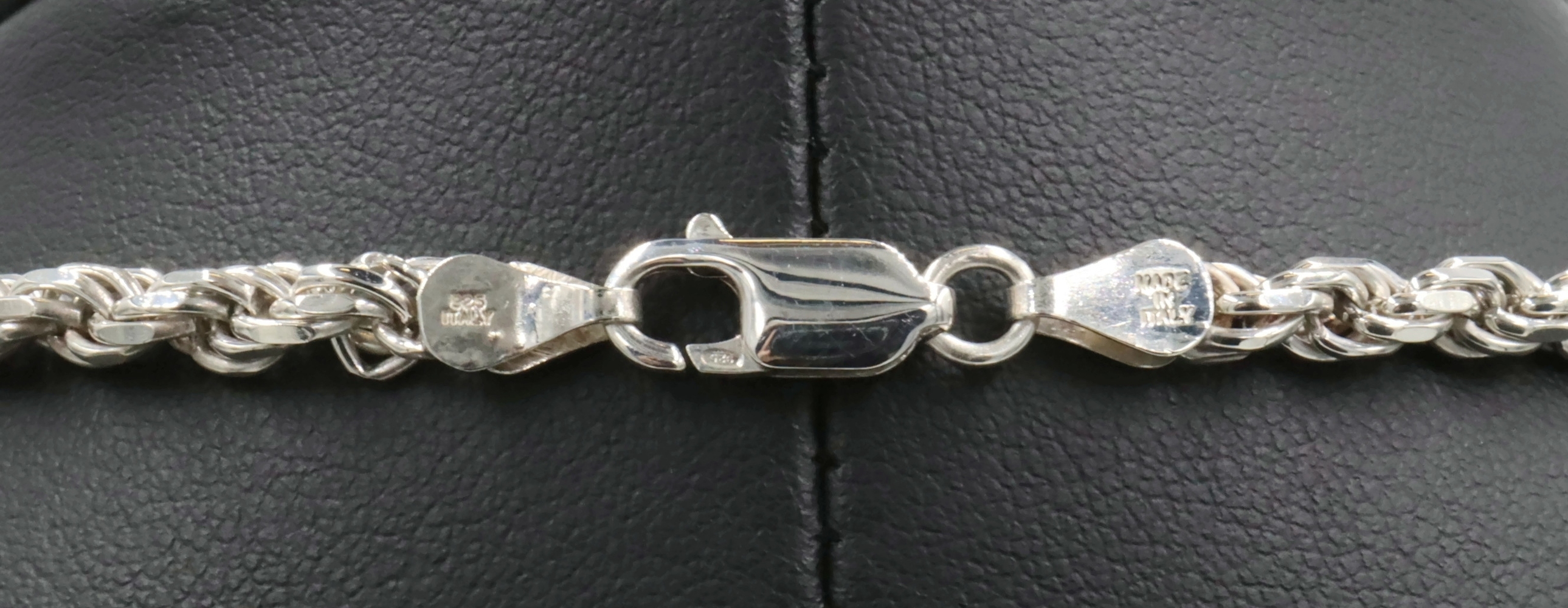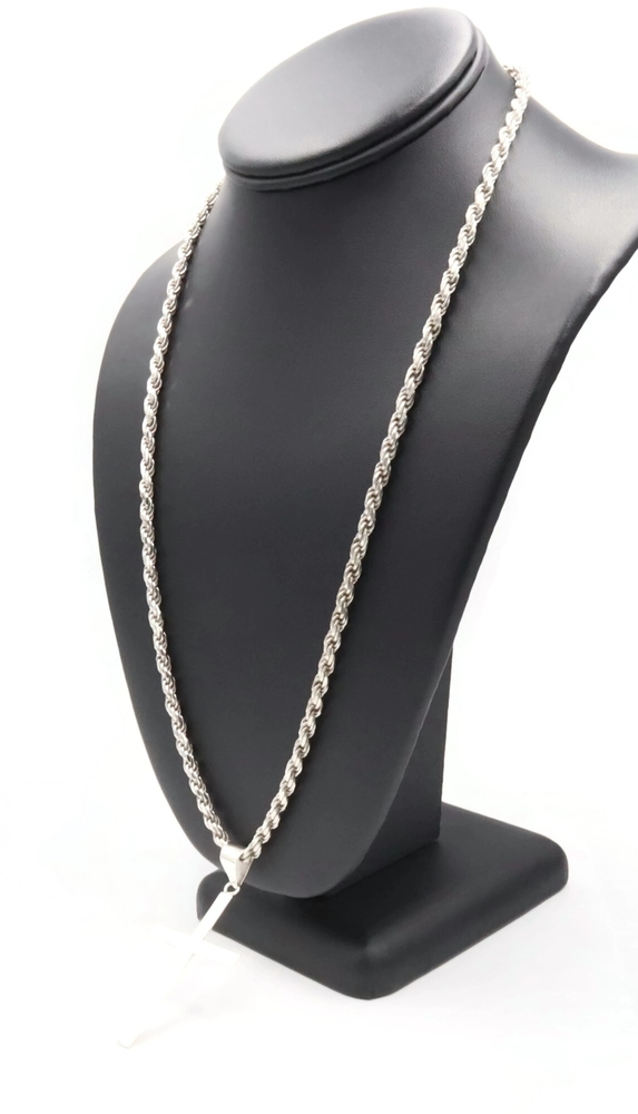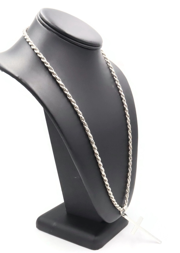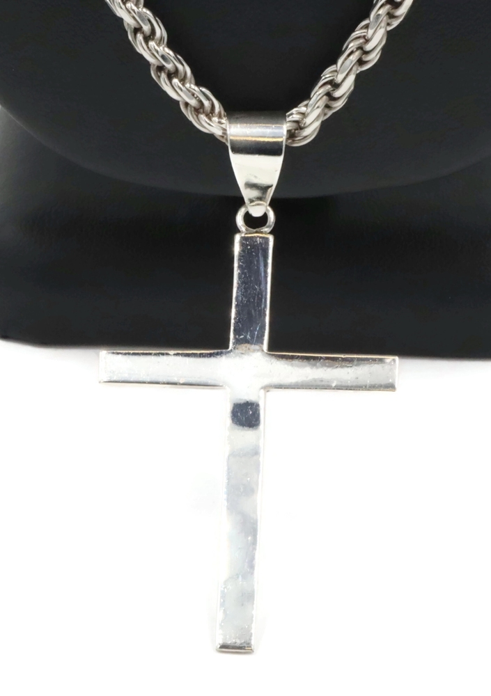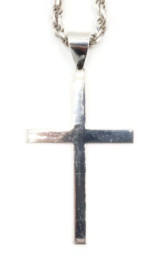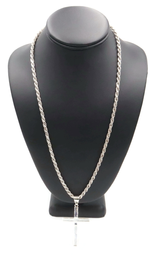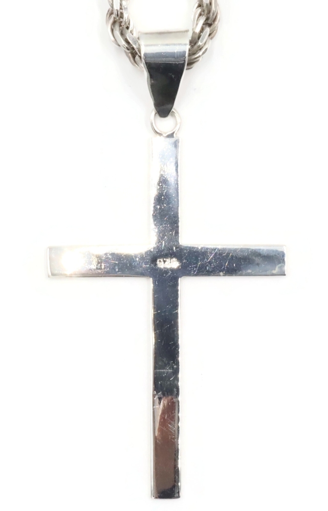 Sterling Silver (925) Classic Cross Pendant on 925 Silver Rope Necklace 24" 38g. This pendant is approximately 67.7mm in length (including the bail) and the rope necklace is approximately 24 1/4 inches in length.