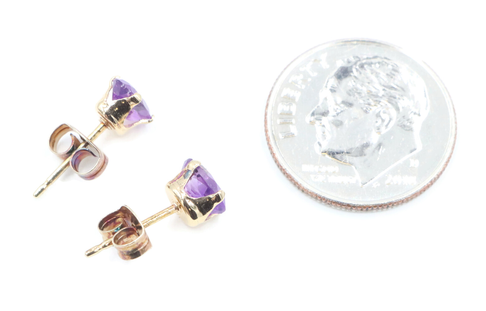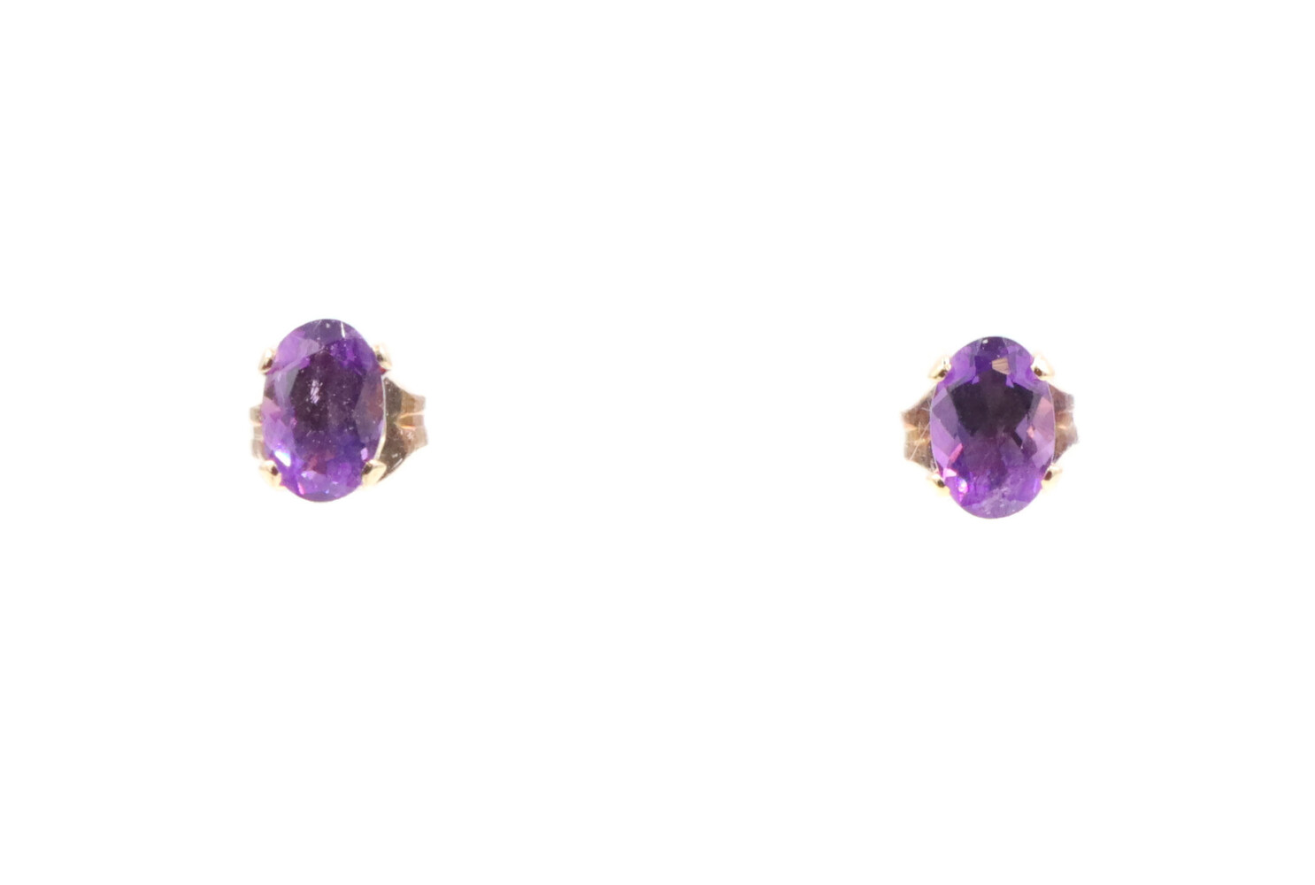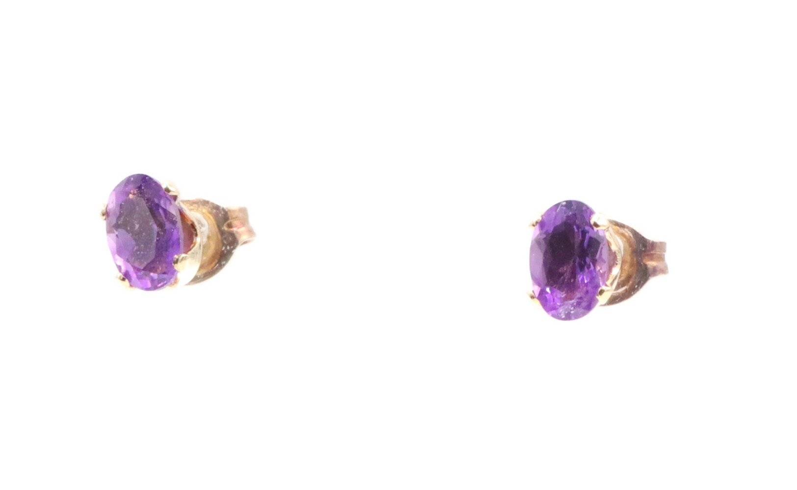 Sterling Silver (925) Oval Cut Lab-Created Amethyst 6mm Solitaire Stud Earrings. These earrings are yellow gold toned.