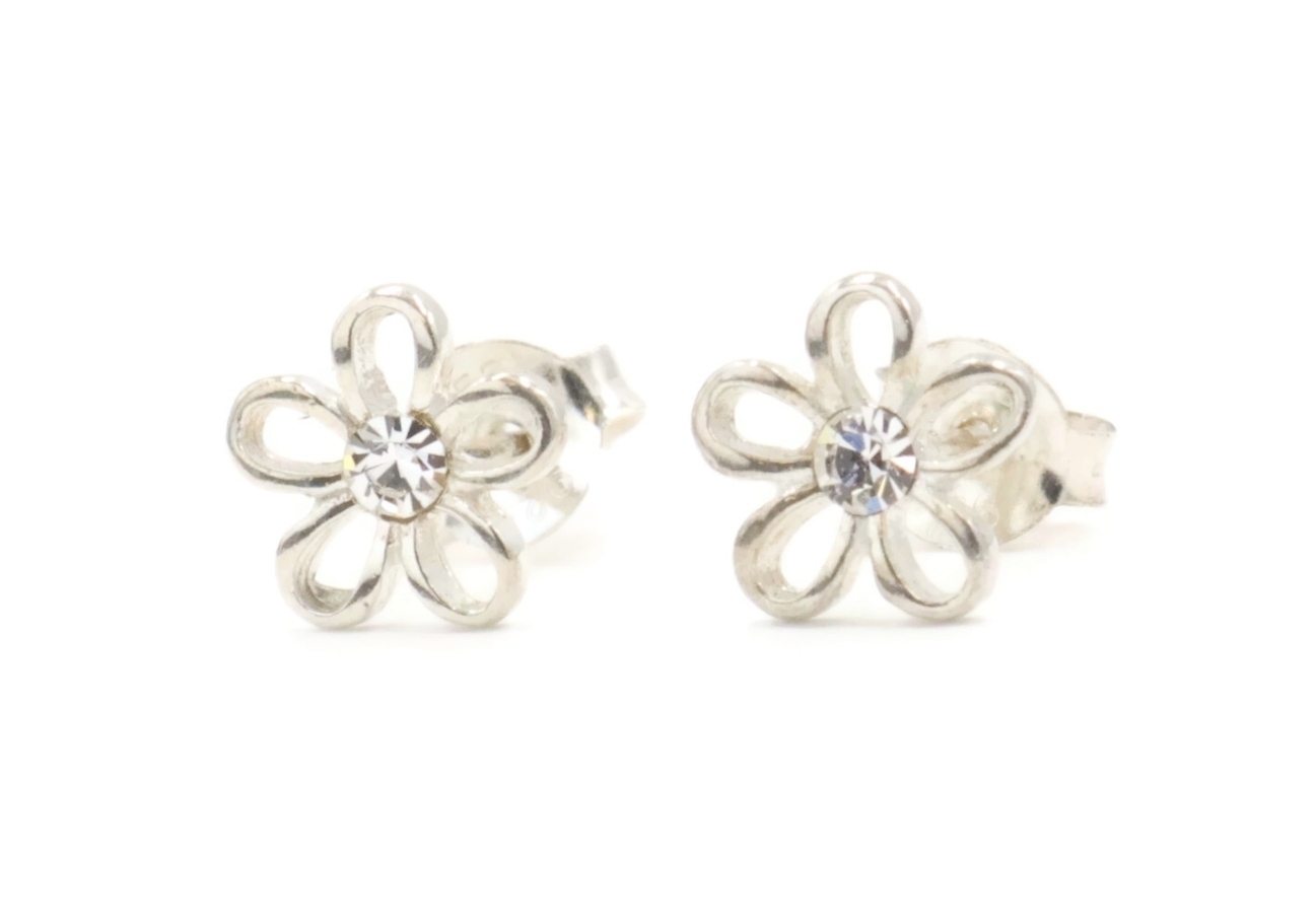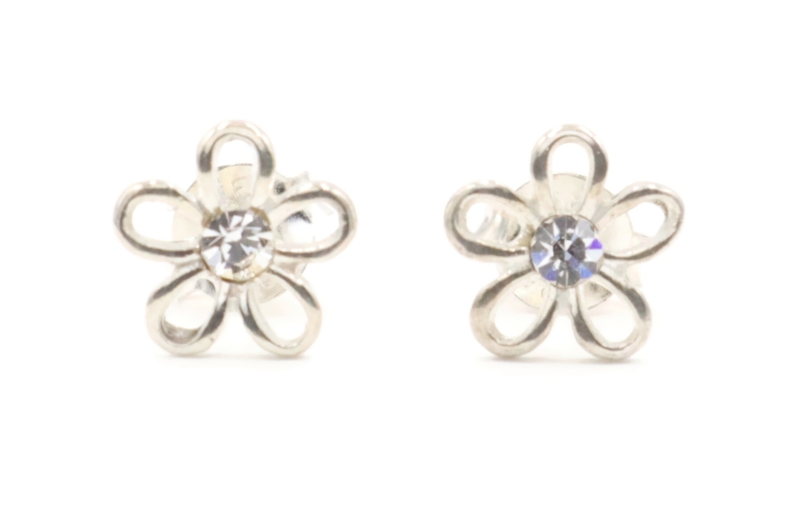Sterling Silver (925) Round Cut Clear Cubic Zirconia 7.3mm Flower Stud Earrings. These earrings each have an approximate width of 7.3mm.