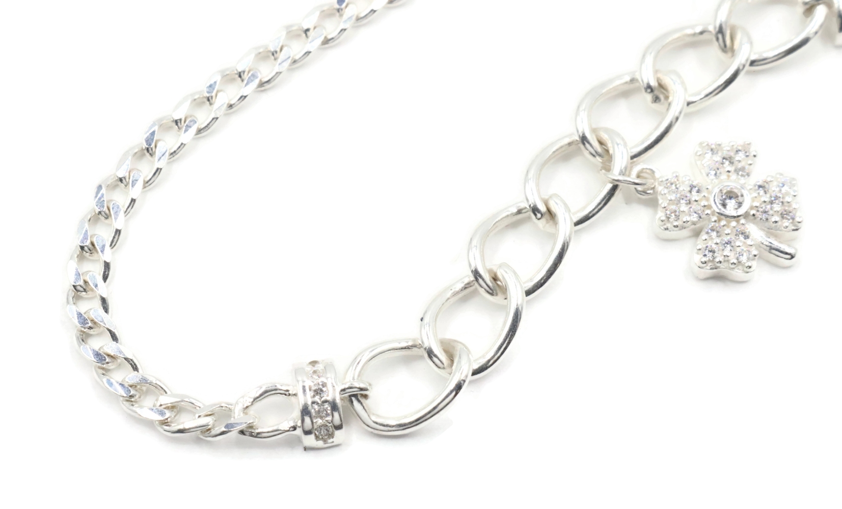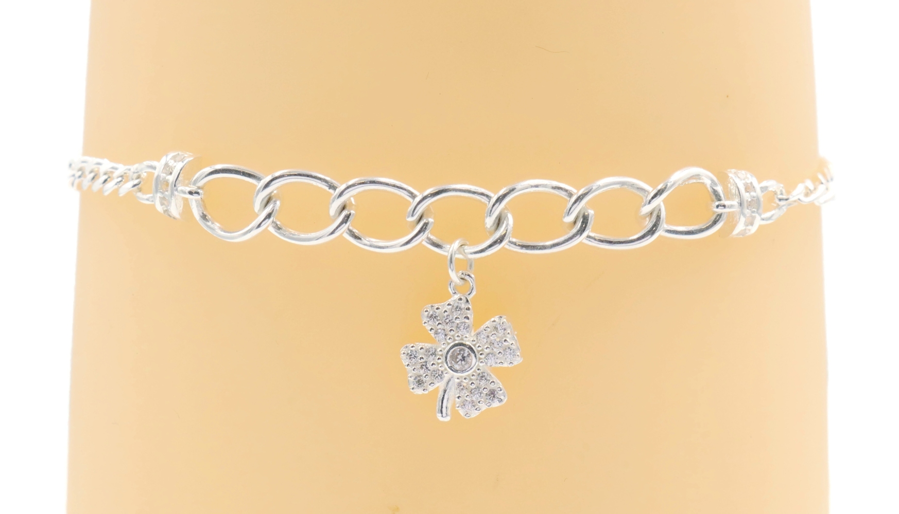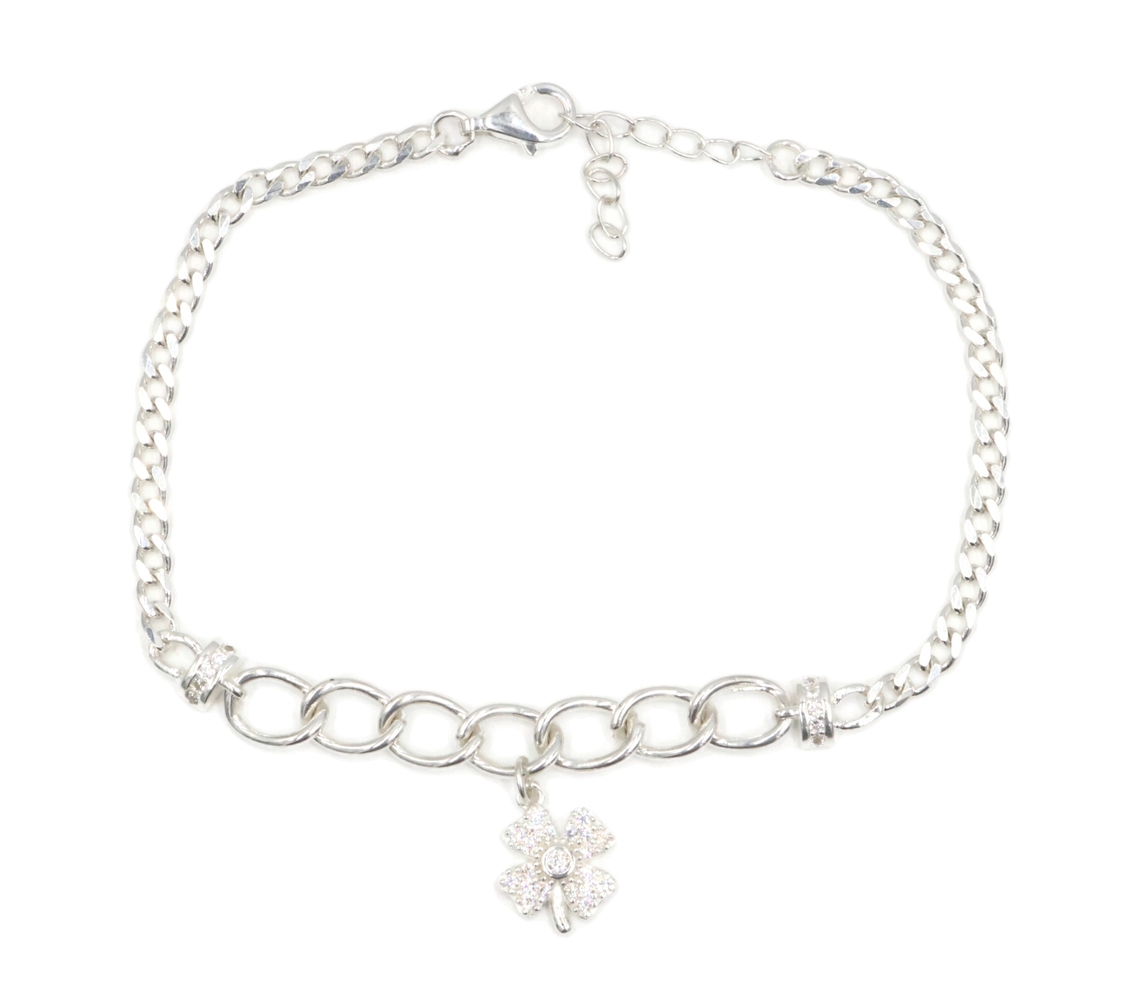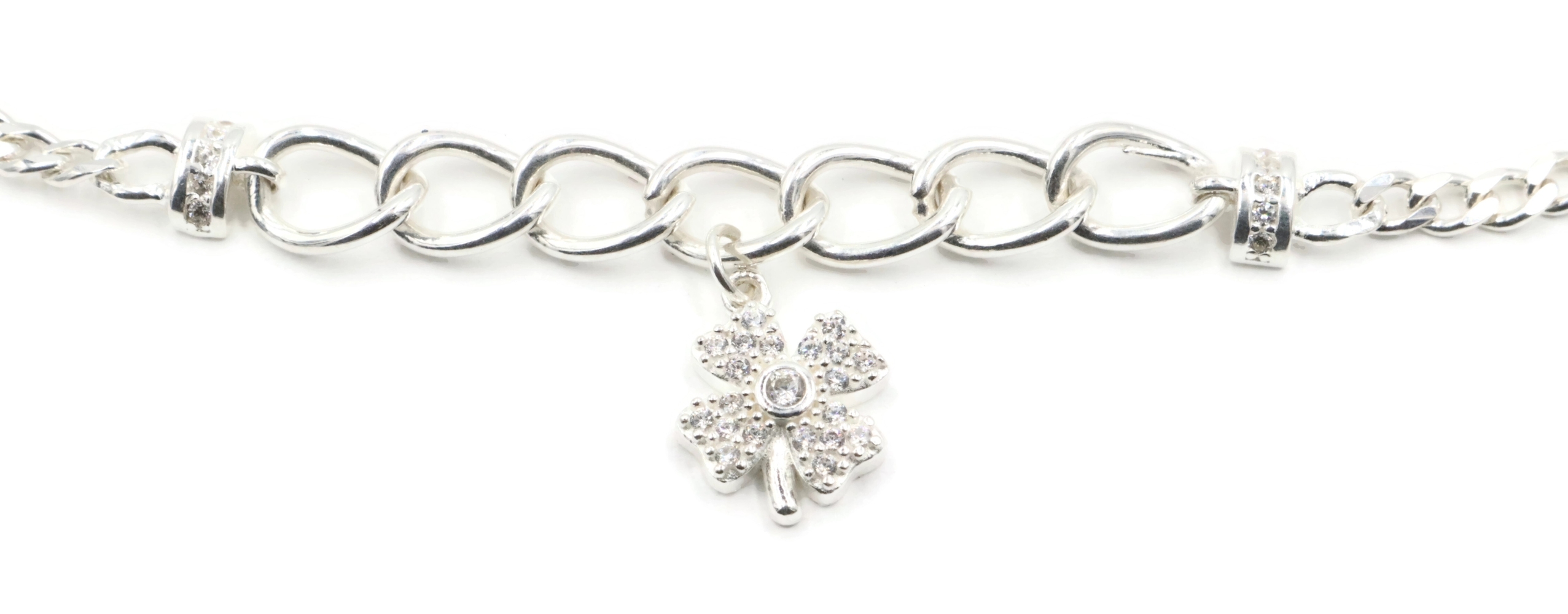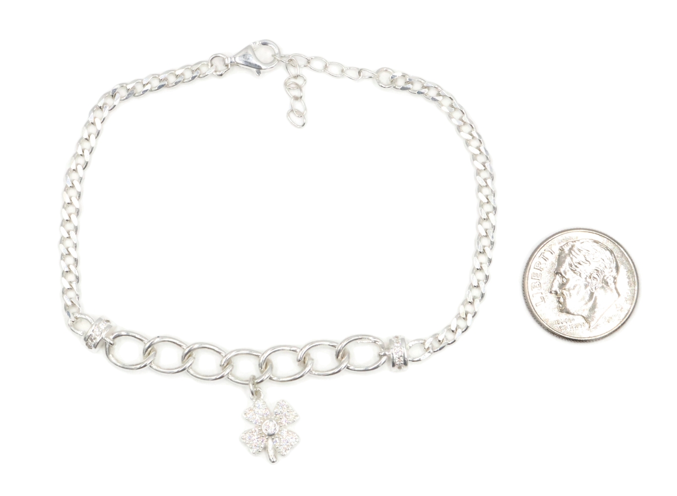 Sterling Silver 925 Round CZ Four-Leaf Clover Charm on Adjustable Curb Bracelet | USA Pawn