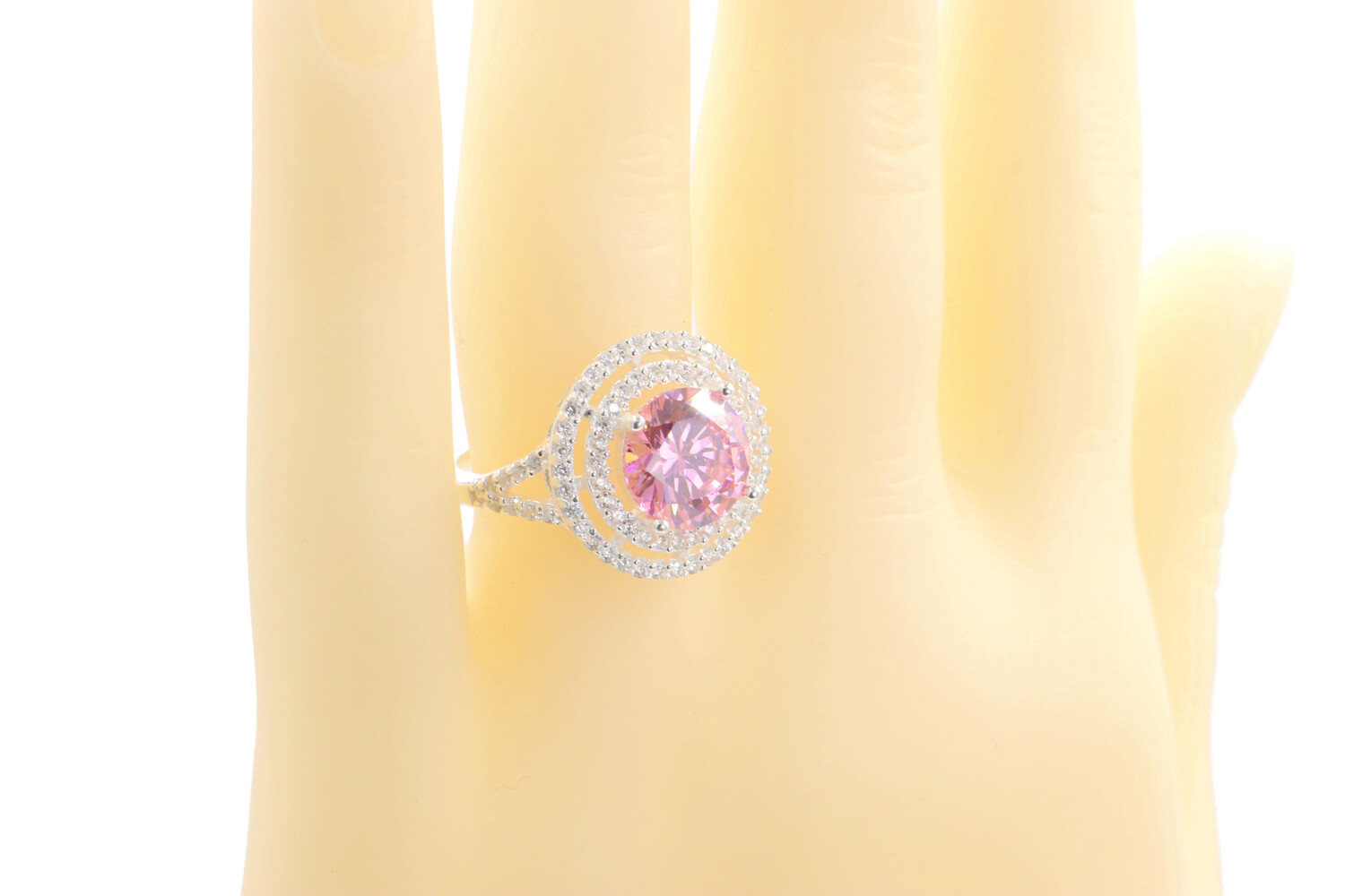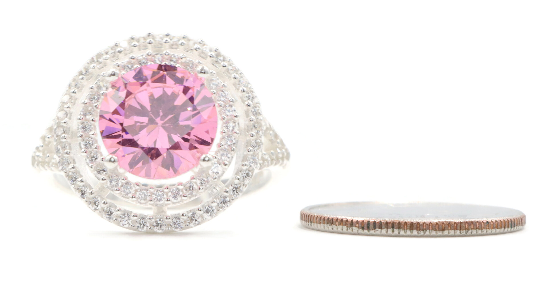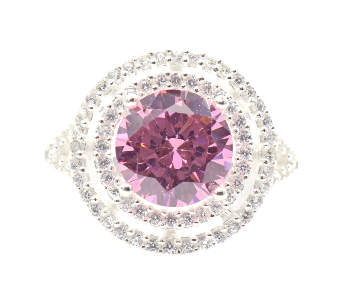 Sterling Silver Double Halo Iced Pink and White Cubic Zirconia Statement Ring | USA Pawn