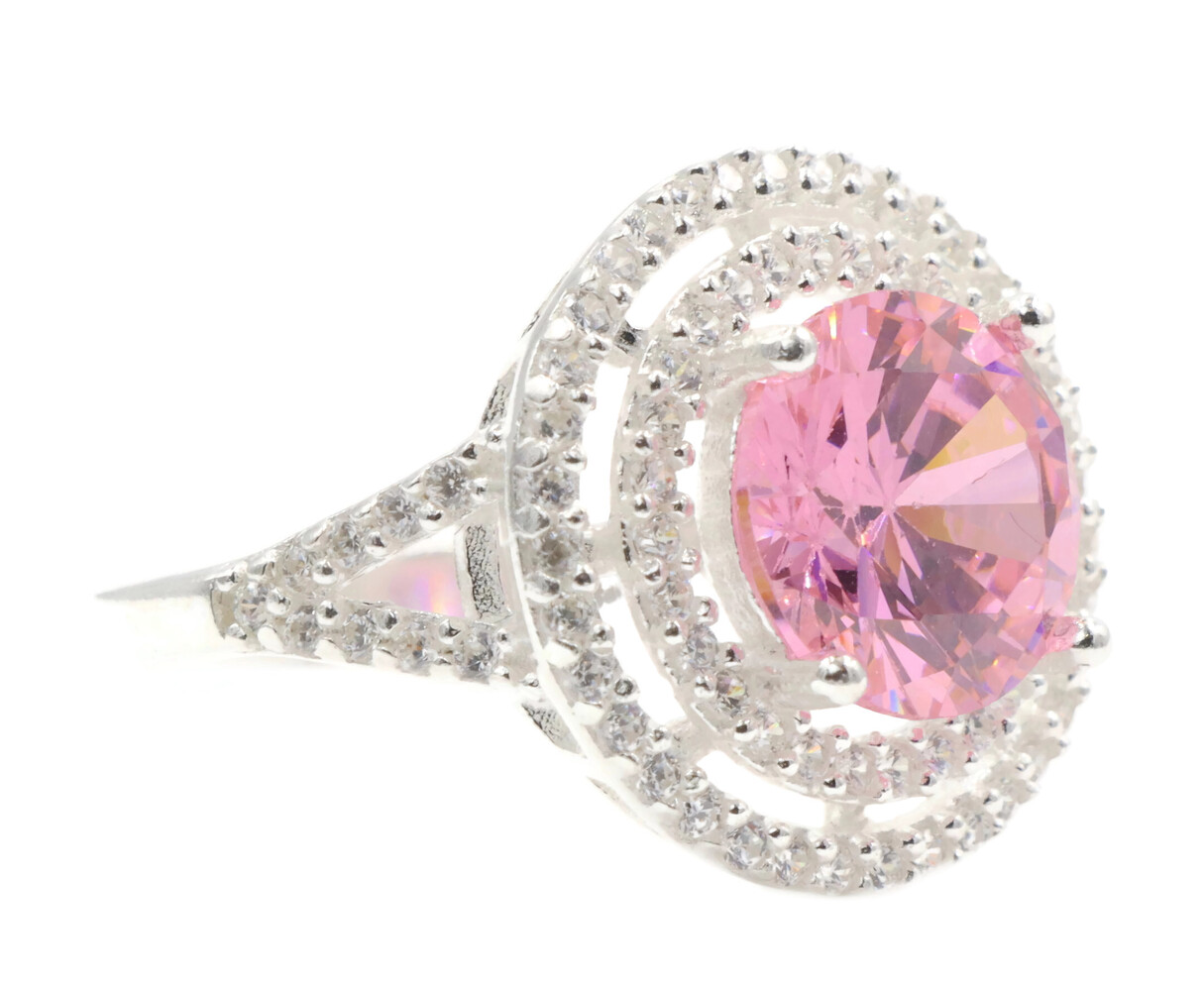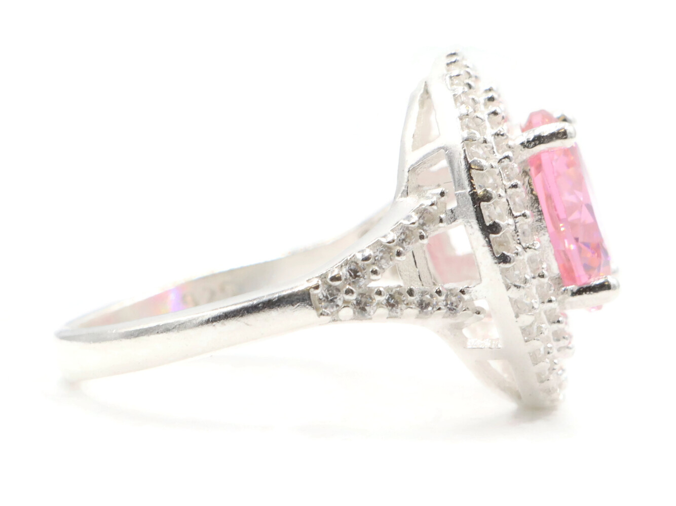 Sterling Silver Double Halo Iced Pink and White Cubic Zirconia Statement Ring. This ring is a size 7.