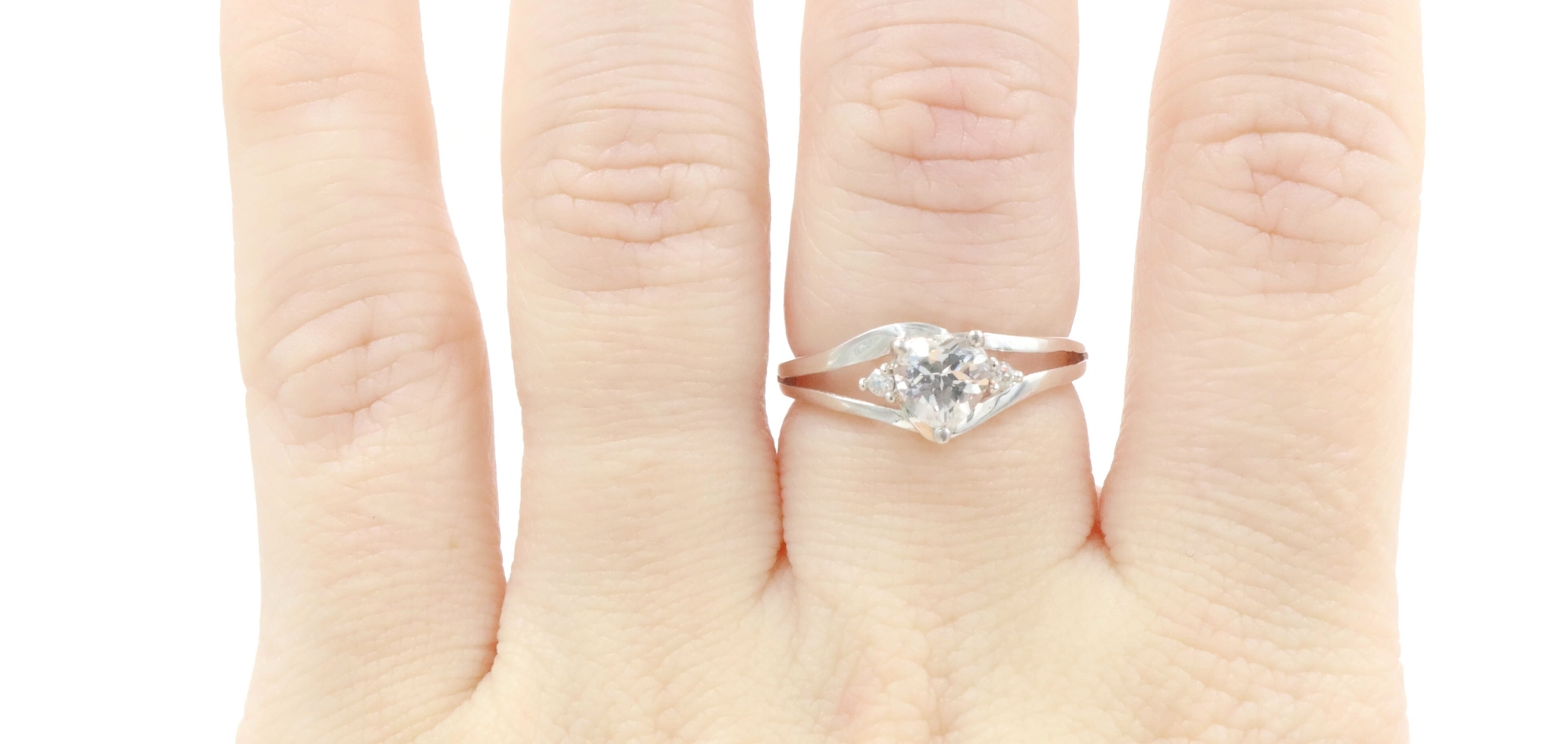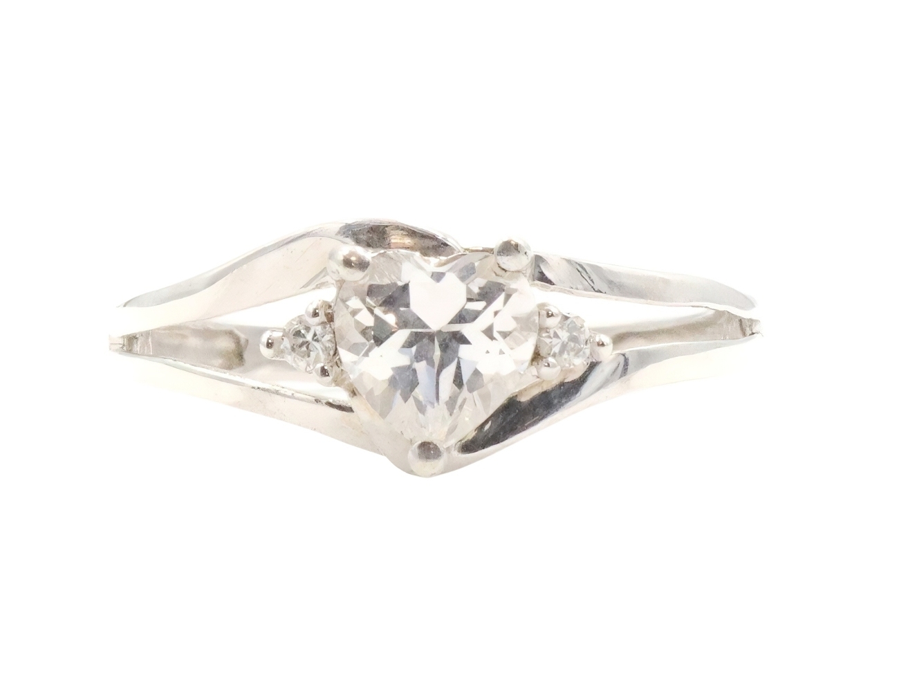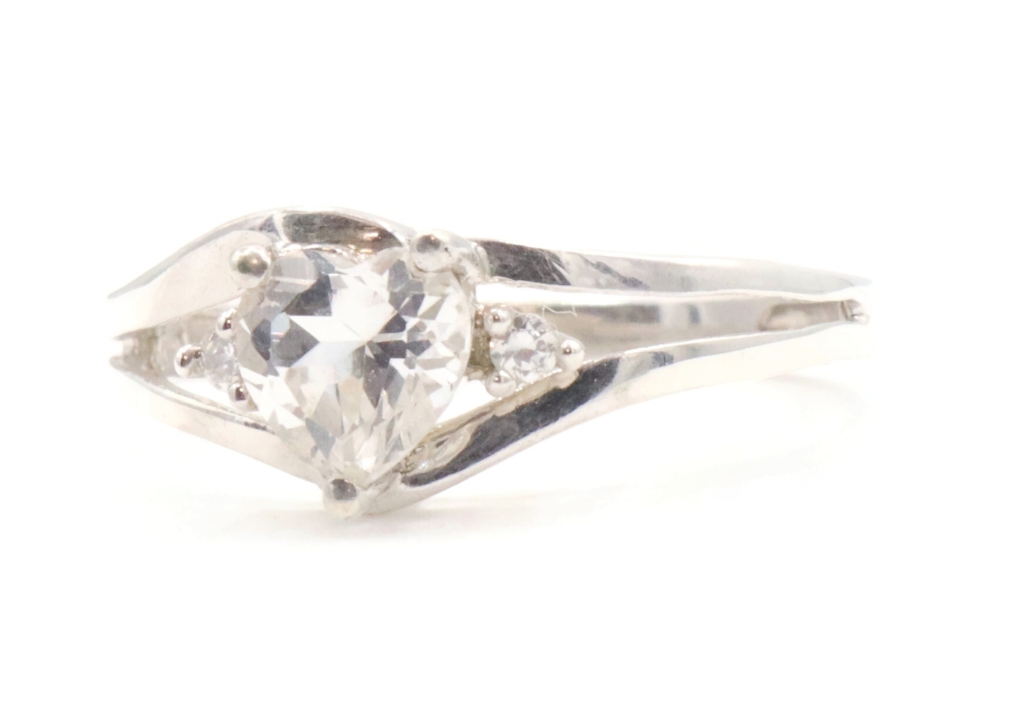 Sterling Silver White Heart Cut Cubic Zirconia CZ Solitaire 925 Statement Ring. This ring is a size 7. Featuring one heart cut and two round cut clear/white cubic zirconia (CZ) stones.