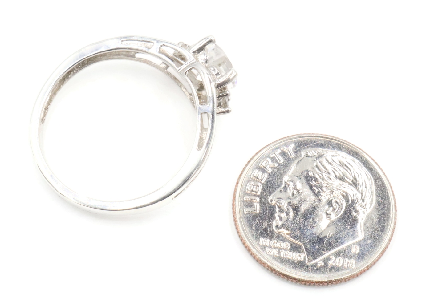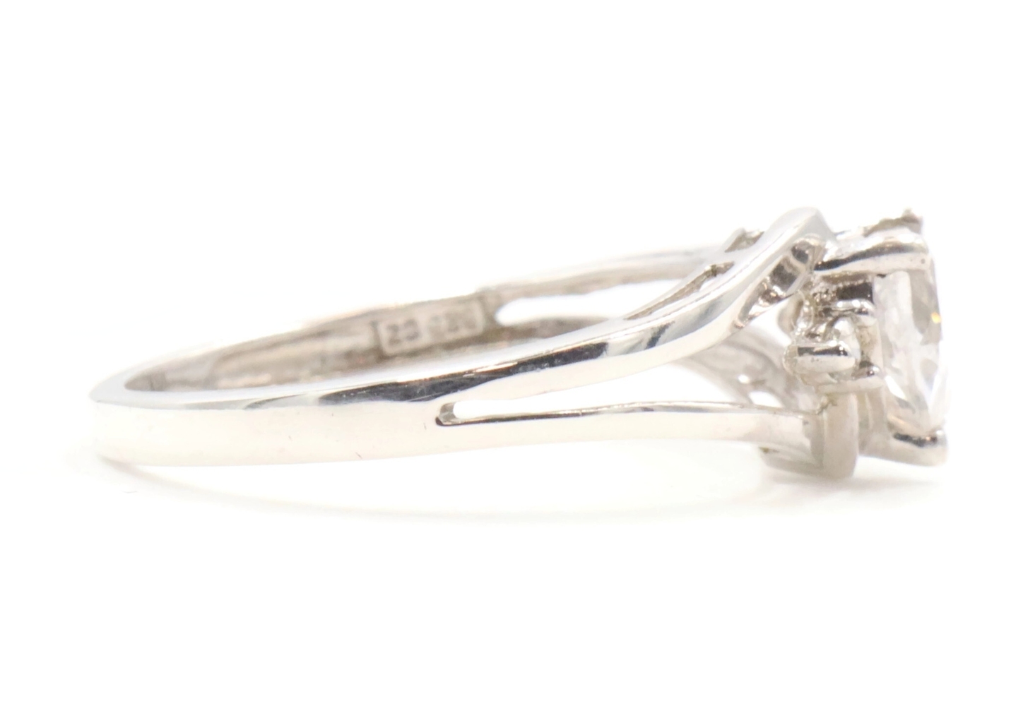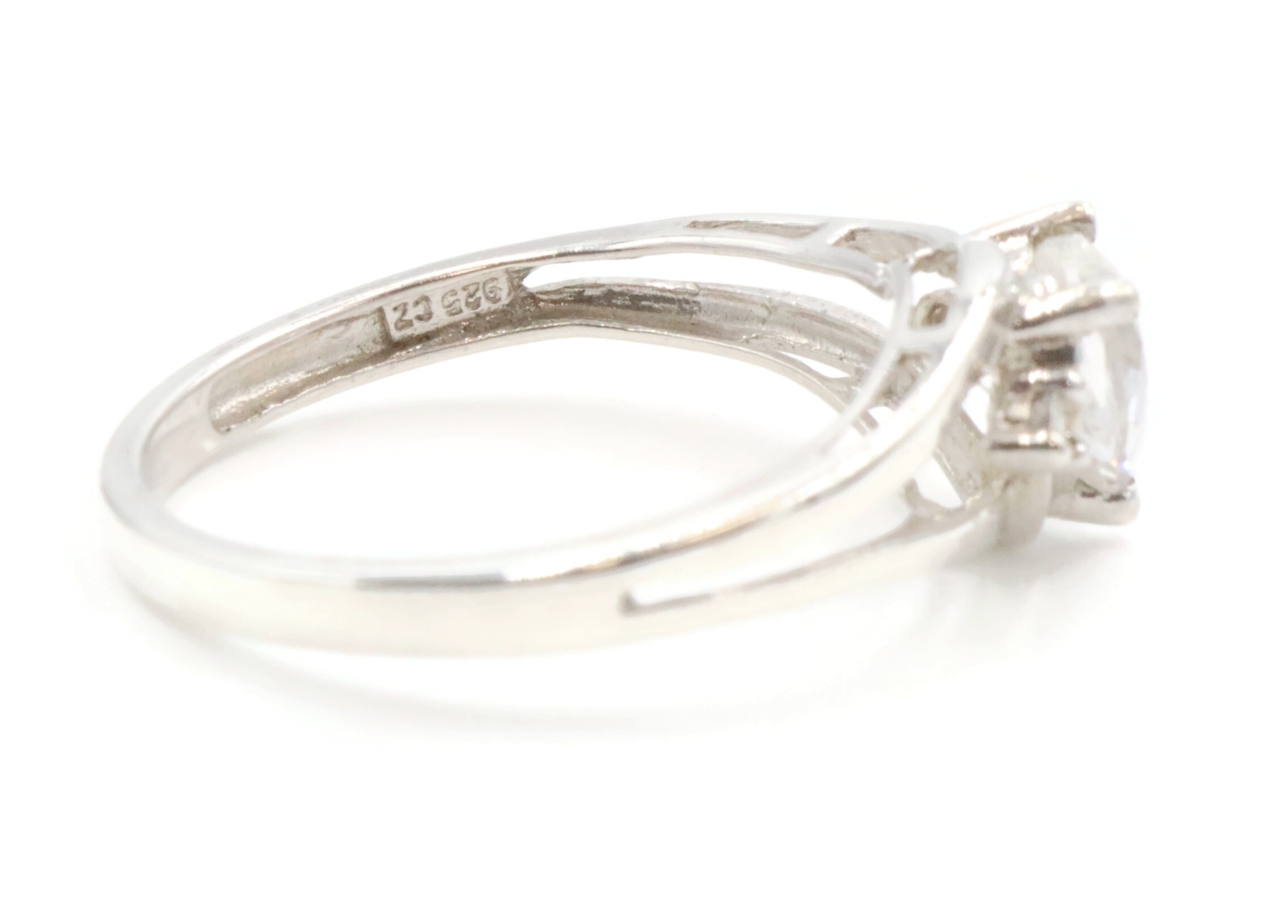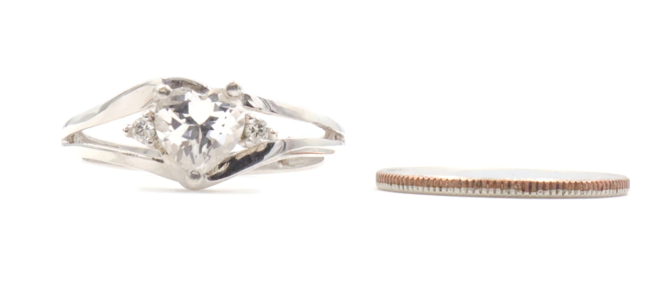 Sterling Silver White Heart Cut Cubic Zirconia CZ Solitaire 925 Statement Ring. This ring is a size 7. Featuring one heart cut and two round cut clear/white cubic zirconia (CZ) stones.