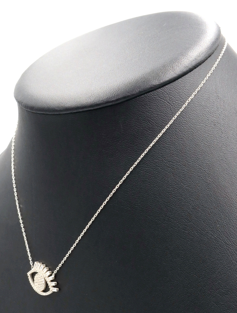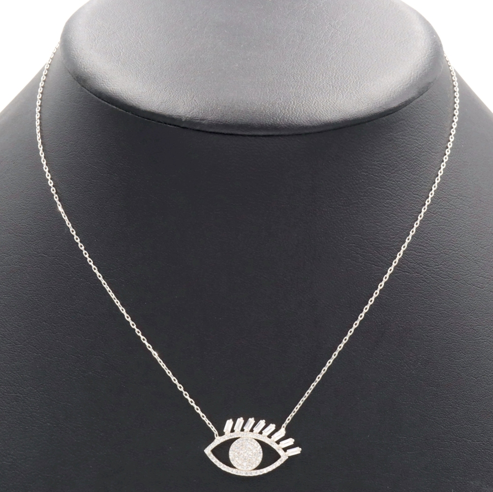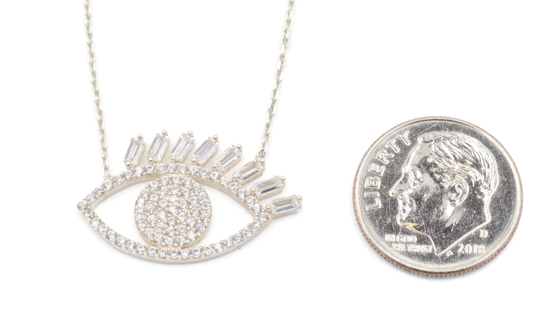 Sterling Silver Women's Eye Pendant Round and Baguette Cut CZ 16" Necklace 2.9g. This pendant features round and baguette cut cubic zirconia (CZ) stones. This necklace has an adjustable wearable length of 16" to 18".