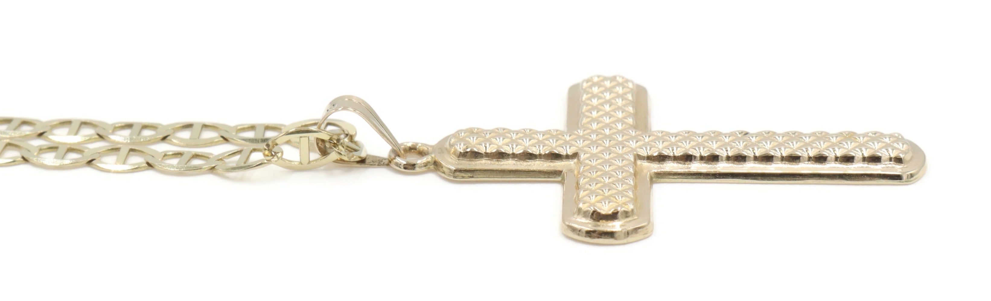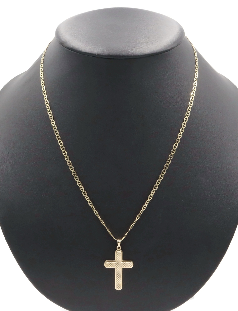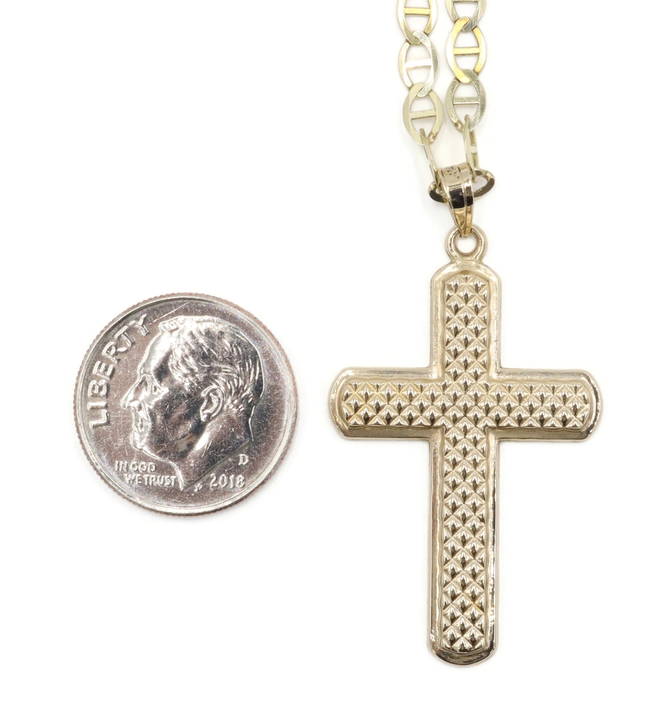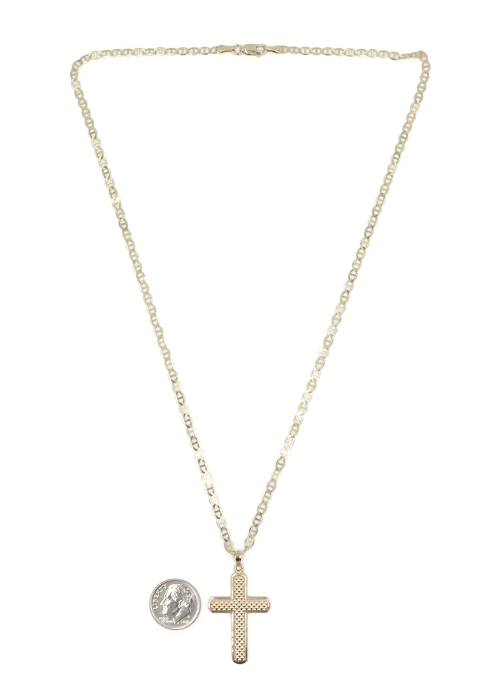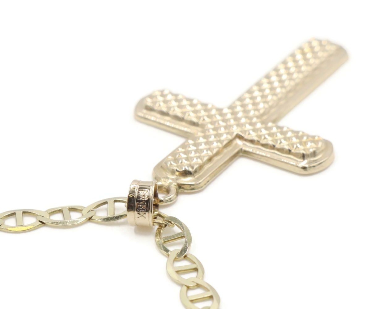 Textured 14KT Yellow Gold 1.5" Cross Pendant on 10KT Gold Mariner Chain 20.5" RL. This pendant is approximately 40mm in length (including the bail) and the mariner necklace is approximately 20 1/2 inches in length.
