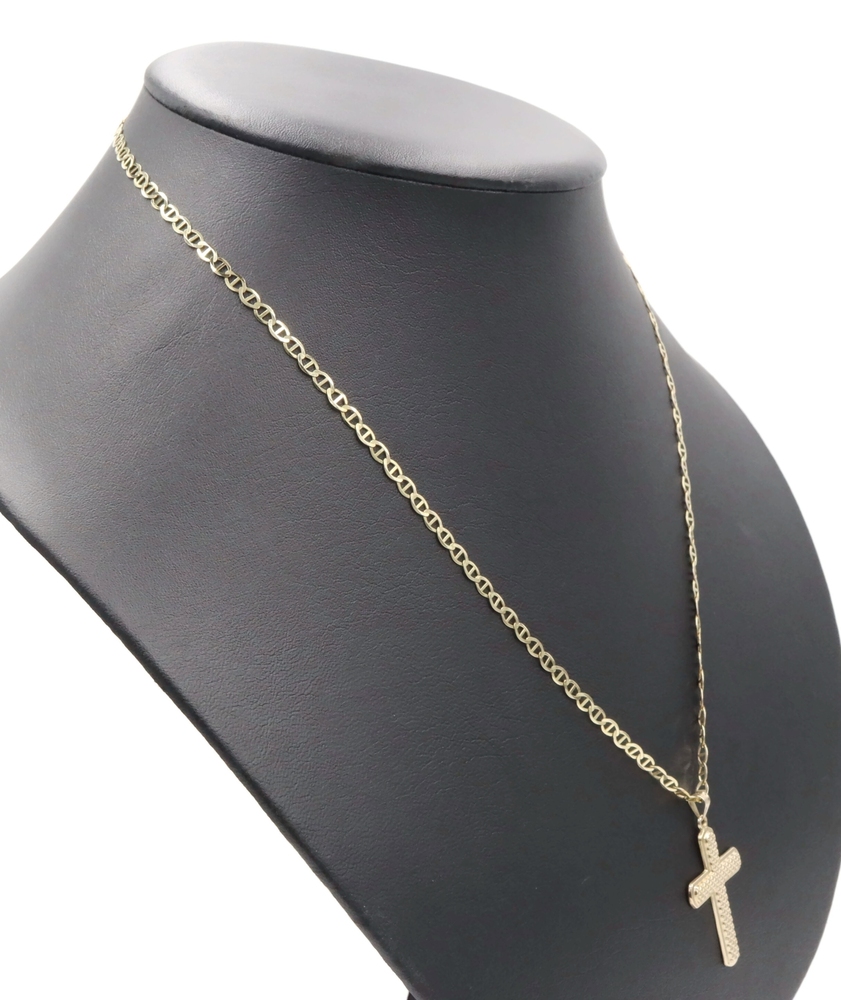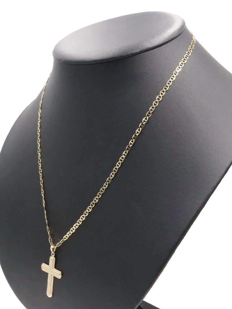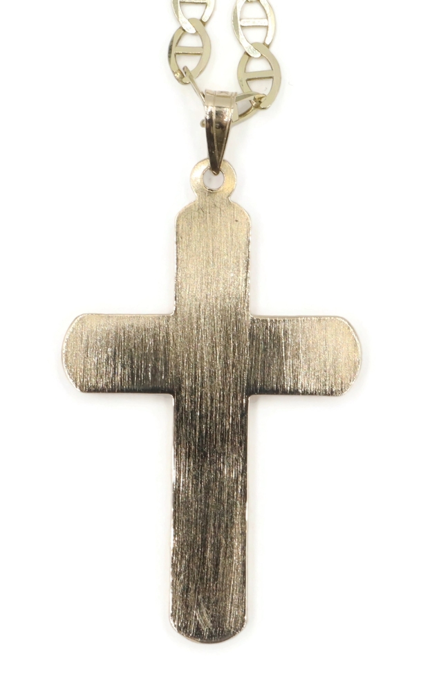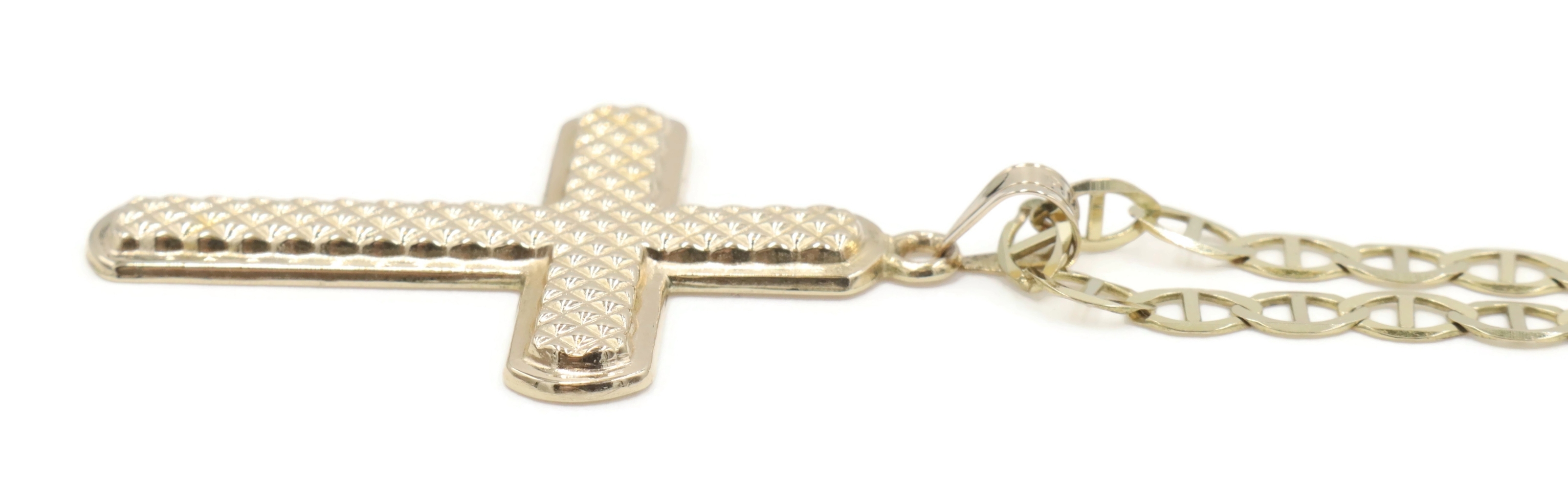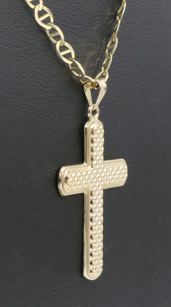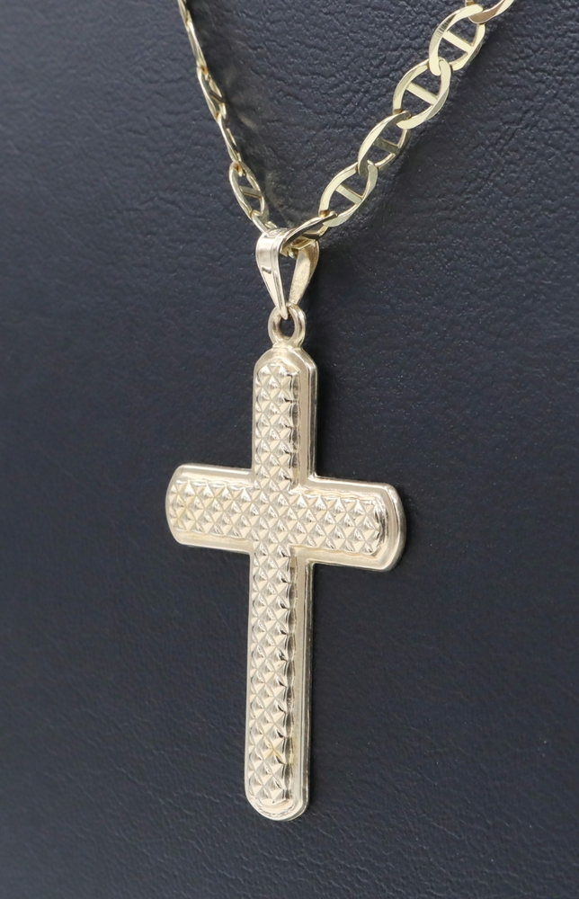 Textured 14KT Yellow Gold 1.5" Cross Pendant on 10KT Gold Mariner Chain 20.5" RL. This pendant is approximately 40mm in length (including the bail) and the mariner necklace is approximately 20 1/2 inches in length.