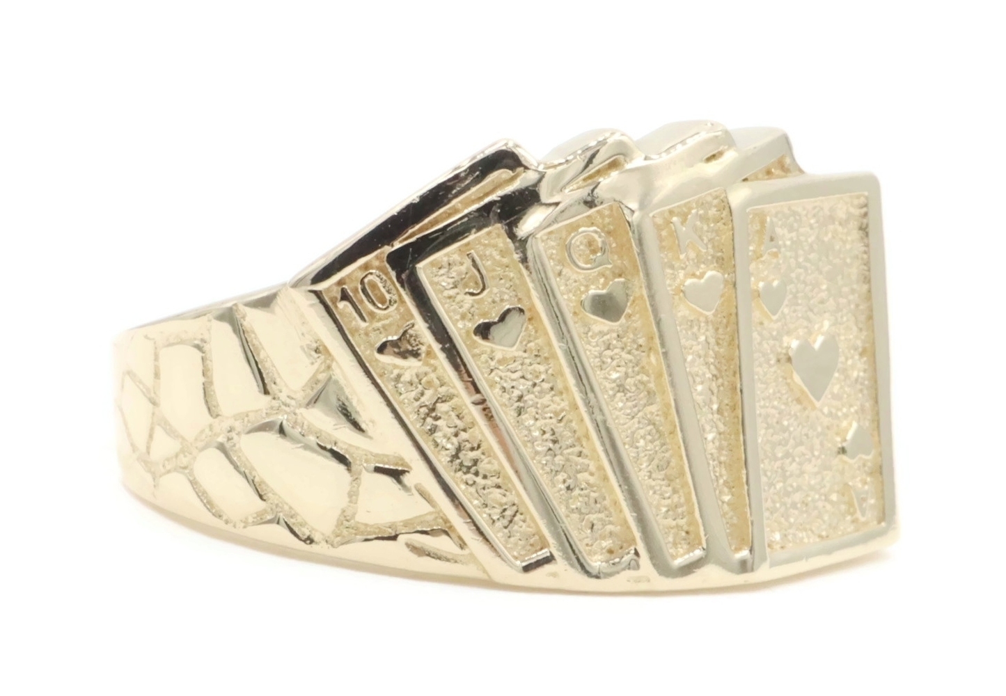 Textured Royal Flush 14KT Yellow Gold Playing Cards Nugget Band Ring CG 9.7g. This ring is a size 10 1/2.
