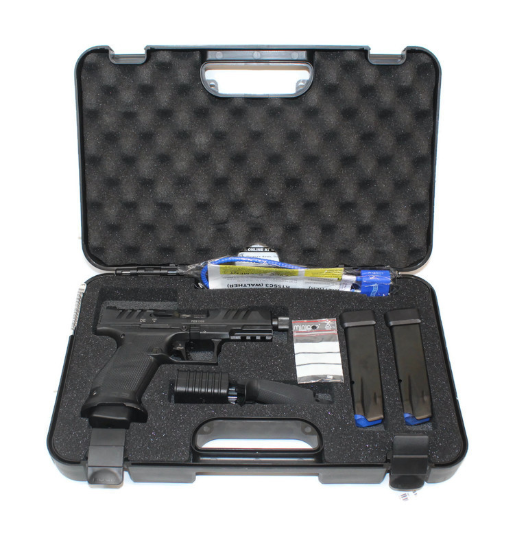 Log#250343 WALTHER Pistol SEMIAUTO 9MM Cal. pdp in case, 3 mags, and pistol grips